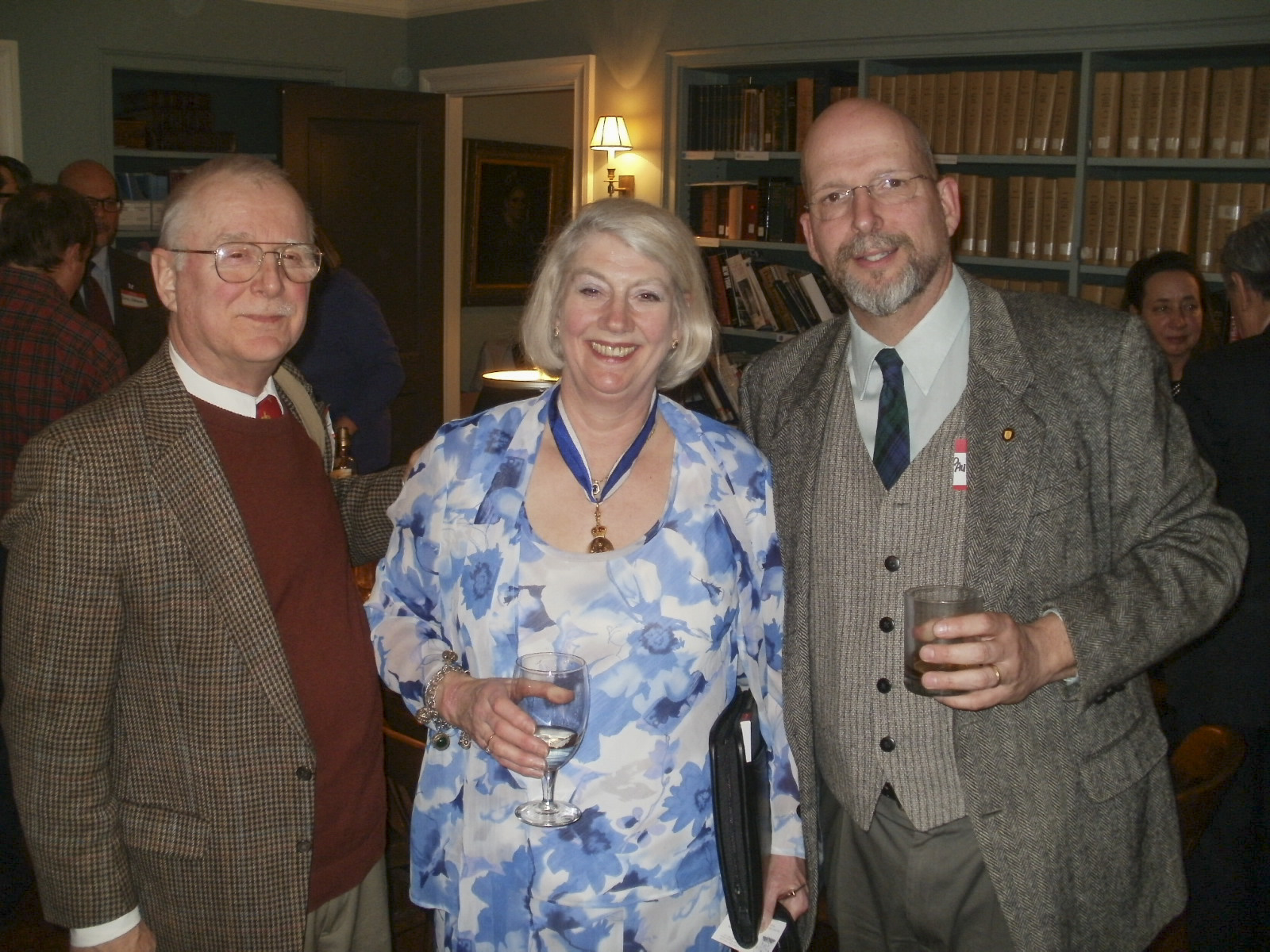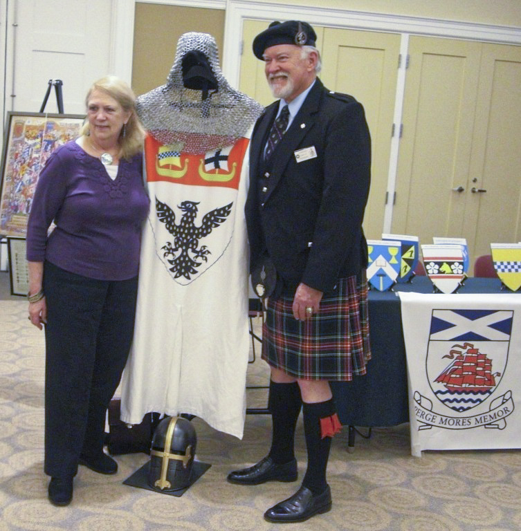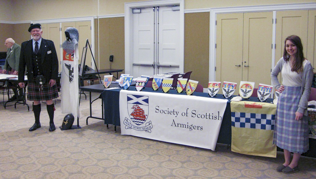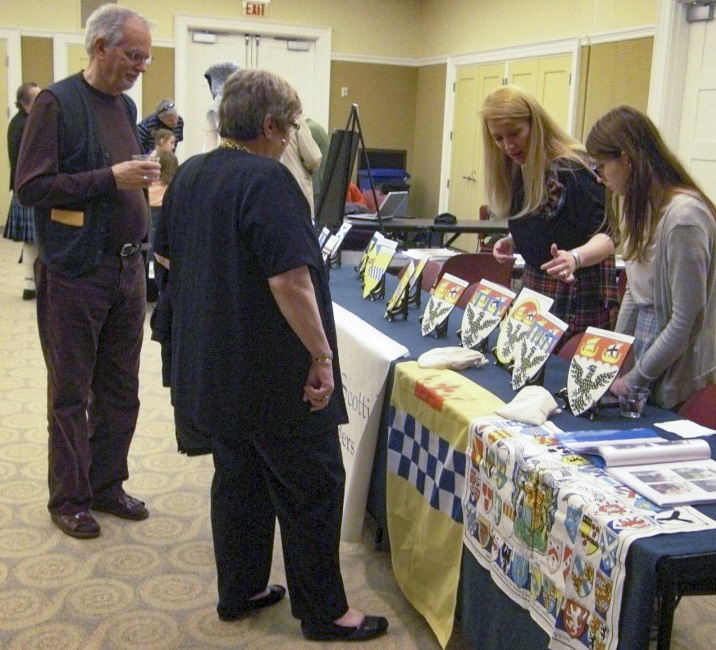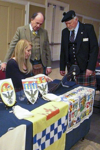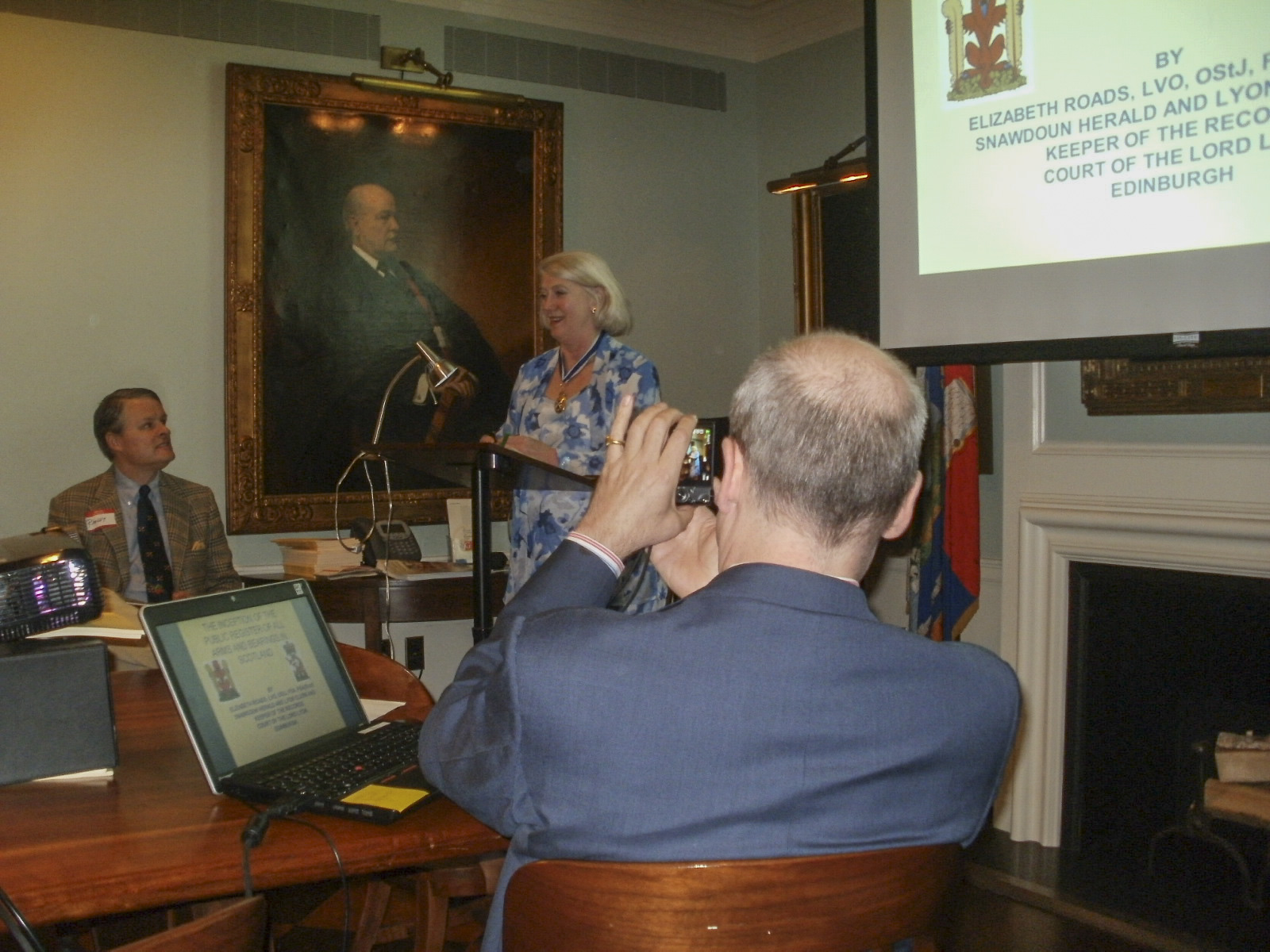 On Monday, 7 April 2014, Elizabeth Ann Roads, LVO, OSt.J, FSA Scot, Snawdoun Herald, Lyon Clerk and Secretary of the Order of the Thistle, gave a presentation on the origin and development of the Public Register of All Arms and Bearings in Scotland at the New York Genealogical and Biographical Society in New York City to a house packed to the rafters. Though we had corresponded over the years we had never met, so I was excited to see, meet and listen to Mrs. Roads speak. She made a PowerPoint presentation which was delightful, informative and humorous. She thoughtfully sprinkled the various reigns of Lyons with Letters Patent to Americans ( mainly colonists but also including a most recent set of Letters Patent signed by Lord Lyon Dr. Morrow). I would say more that half the audience were holders of honorary arms from the College of Arms in England and those of us who were Scottish armigers were amused at Mrs. Roads’ assumption and declaration of the pre-eminence of Scottish Armoury. Score one for the Lyon Office. After, we all enjoyed four, repeat four, different kinds of single malt Scotch with cheese & crackers.