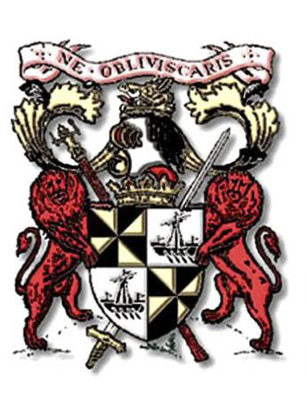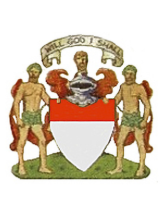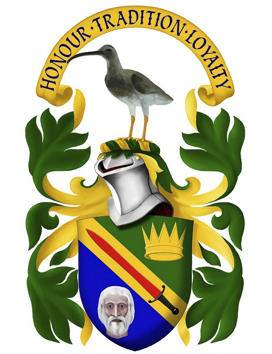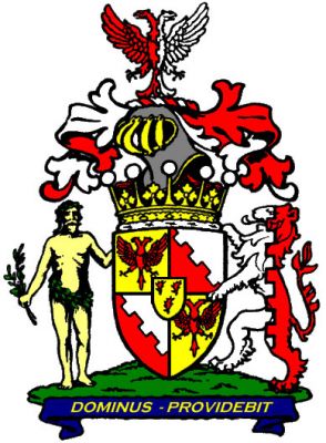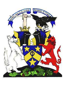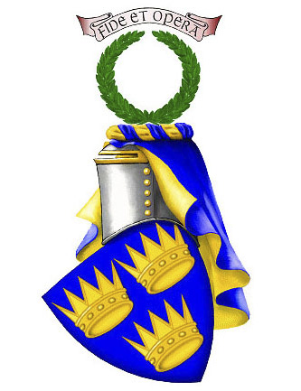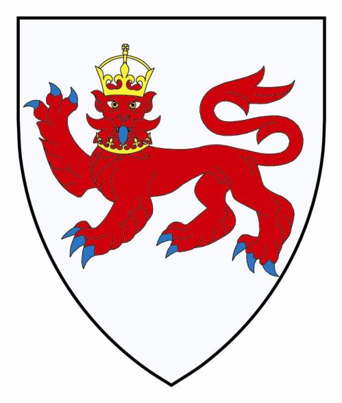 Arms: Gules on a bend Argent between in chief a fir tree eradicated Argent and in base an ancient crown Or a sword in bend Gules hilted and pommeled Or a bordure engrailed parted per pale Azure and Argent.