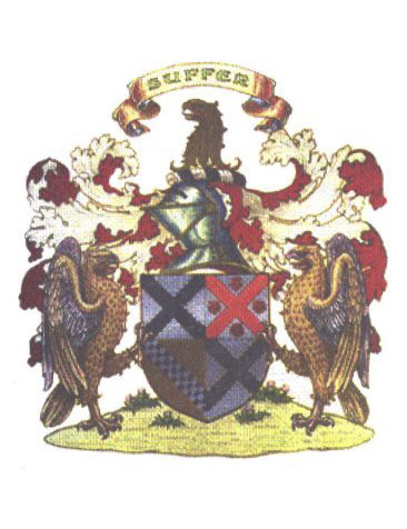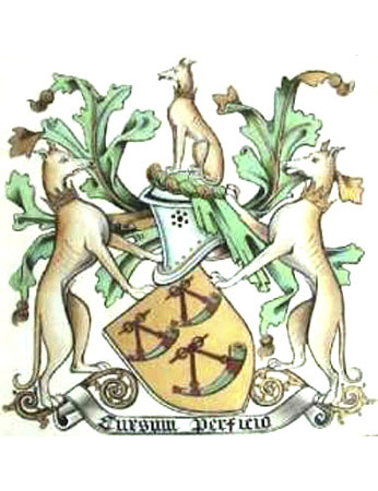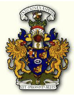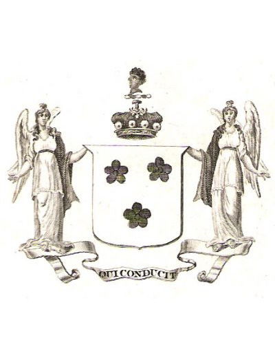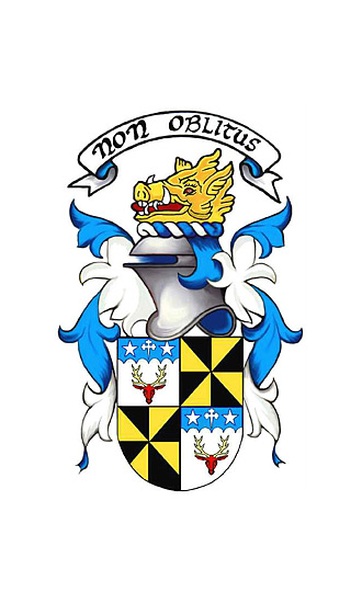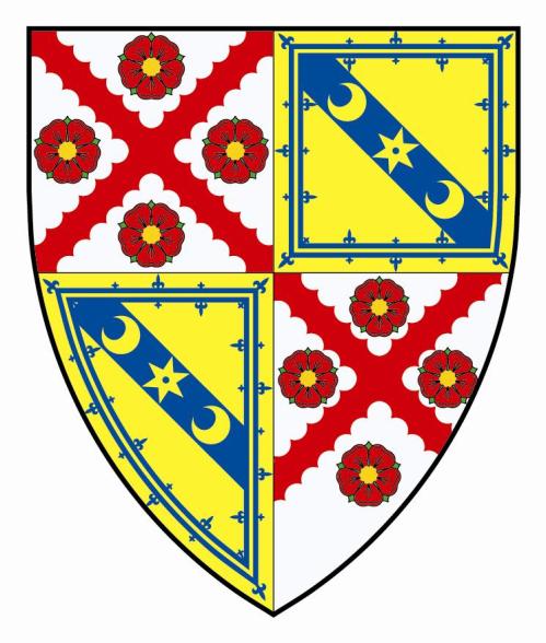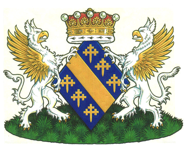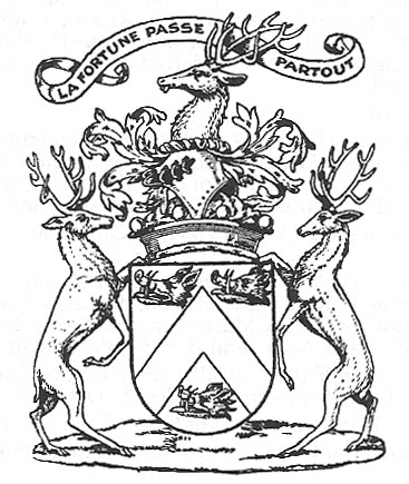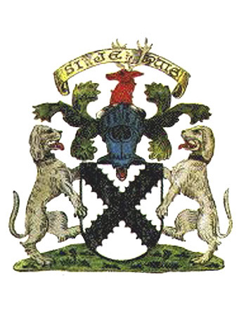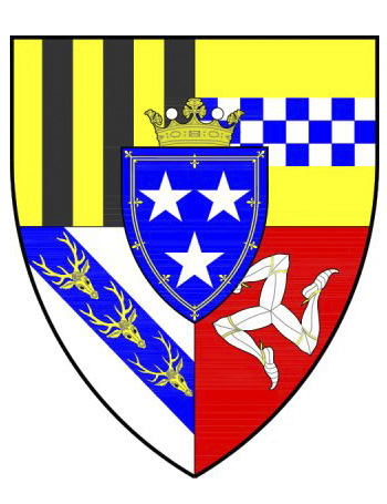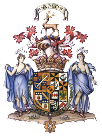 Arms: Quarterly: 1st & 4th: Argent a saltire engrailed Sable ( Haldane), 2nd: Argent a saltire between four roses Gules ( Lennox), 3rd: Or a bend chequy Sable and Argent (Menteith)