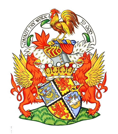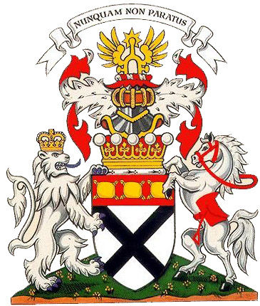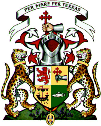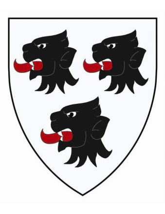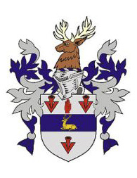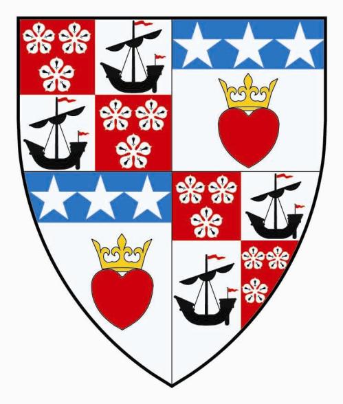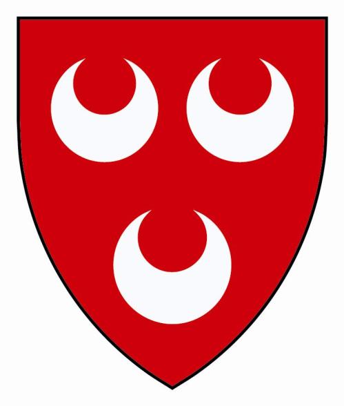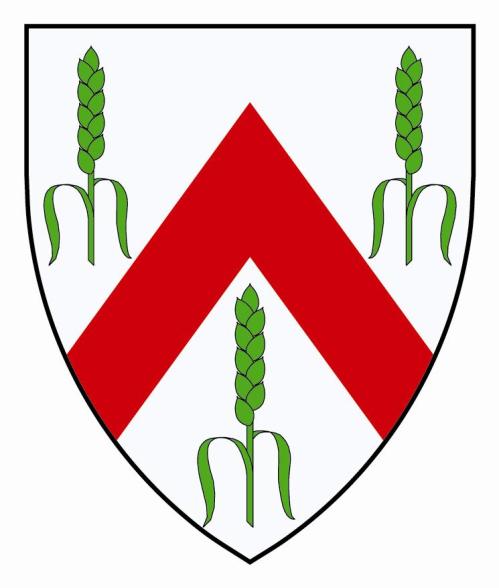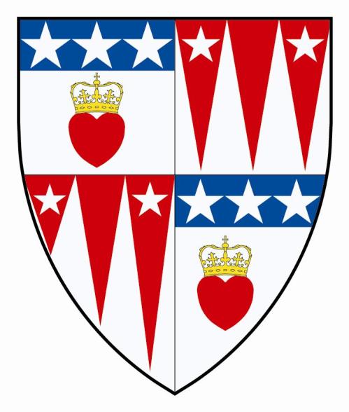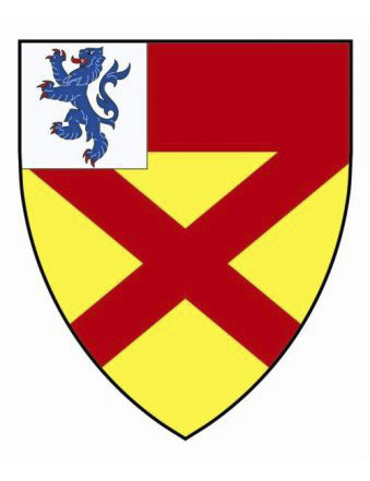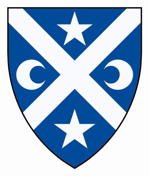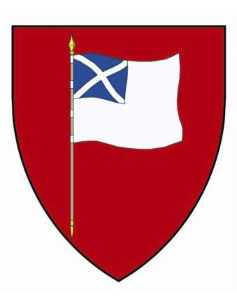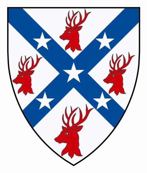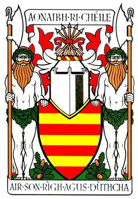 Arms: Argent, a saltire Gules cantoned between in chief a mullet in base a lymphad sails furled Sable flagged Gules. In the dexter flank a clarsach and in sinister flank a bluebell slipped and leaved Proper, a bordure indented parted per pale Argent and Or.