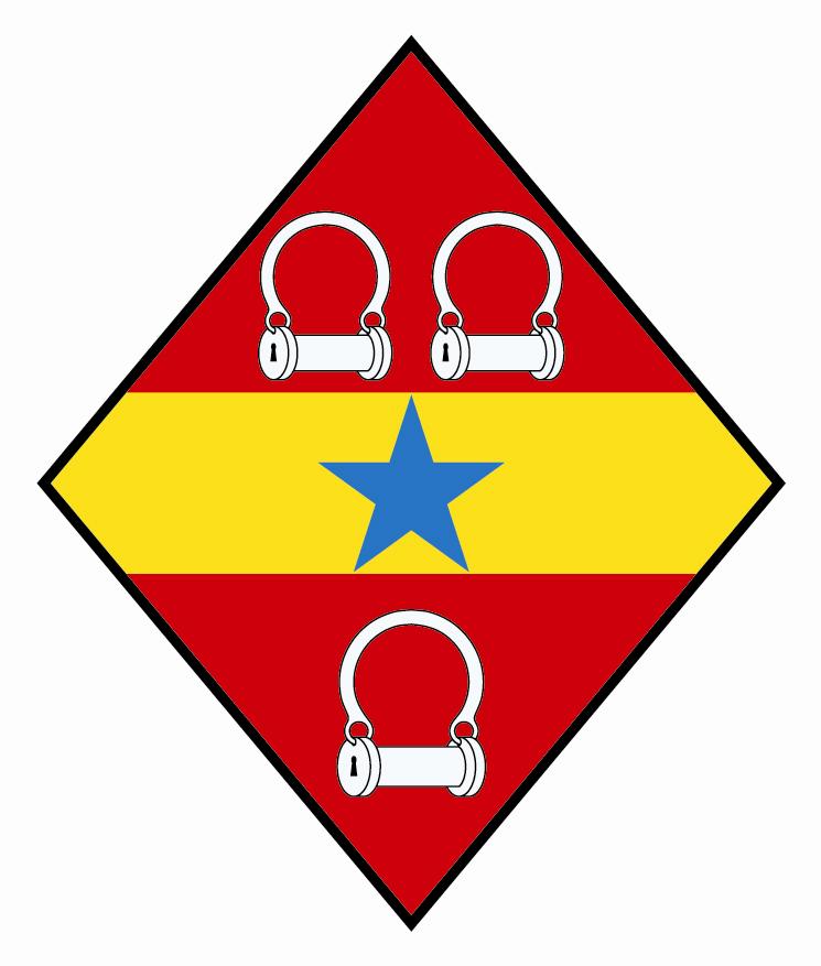 Arms: Gules on a fess or between three fetterlocks argent, a mullet azure