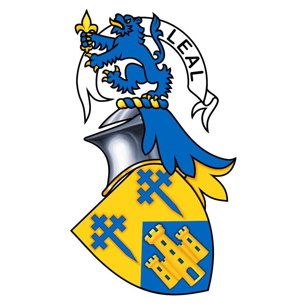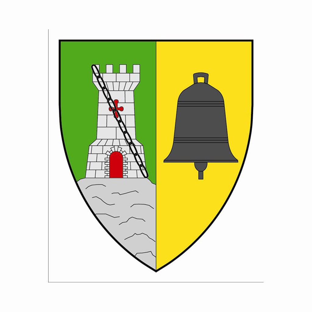 Arms: Two coats per pale; dexter: Vert on a rocky mount a tower Proper masoned Sable and with a port Gules, the tower surmounted from its dexter chief point to its sinister base by a chain Sable (for Cadenas); sinister: Or a bell Proper (for Vicent)