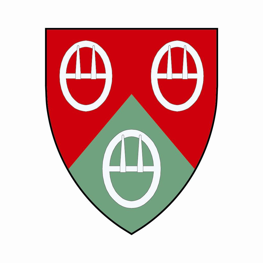 ARMS: Per chevron Gules and Vert three oval buckles two and one their double tongues upward Argent