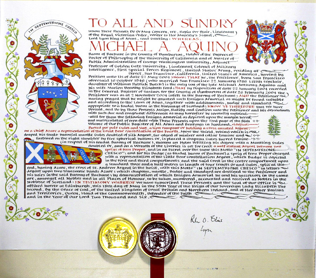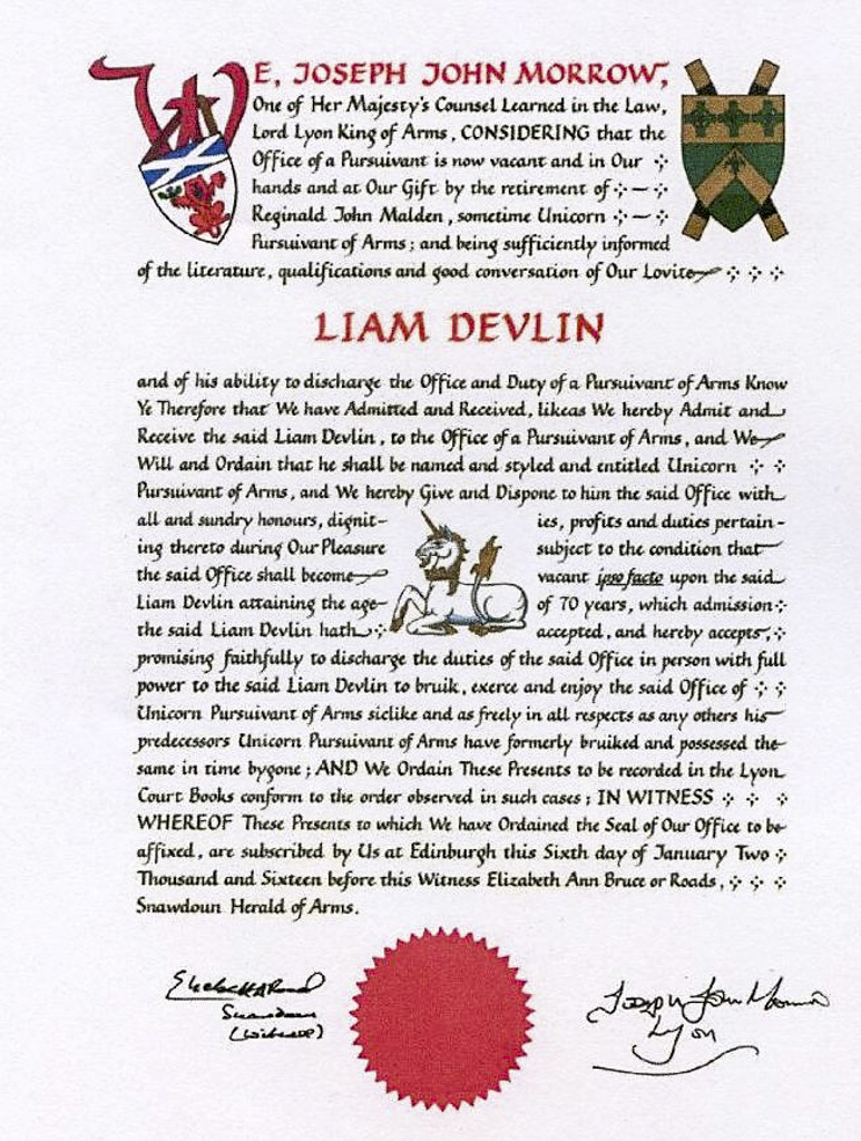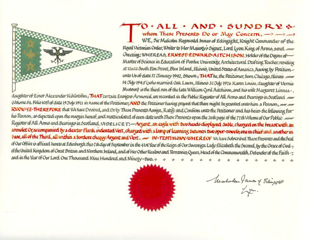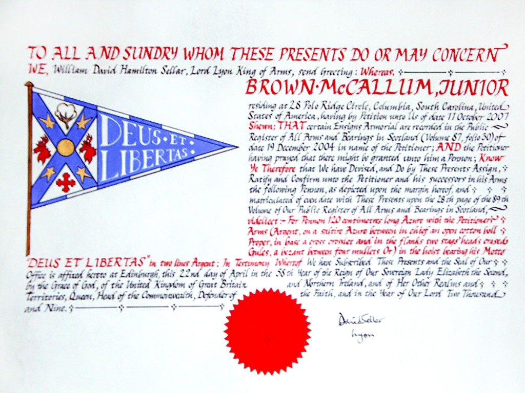 I, Sir James Balfour Pau;, Lord Lyon King of Arms of Scotland hereby declare and certify that the signatures of the two noble Lords appended hereinto do rightly pertain to them and are authentic. Given under my hand and seal of office this thirty first day of October 1907