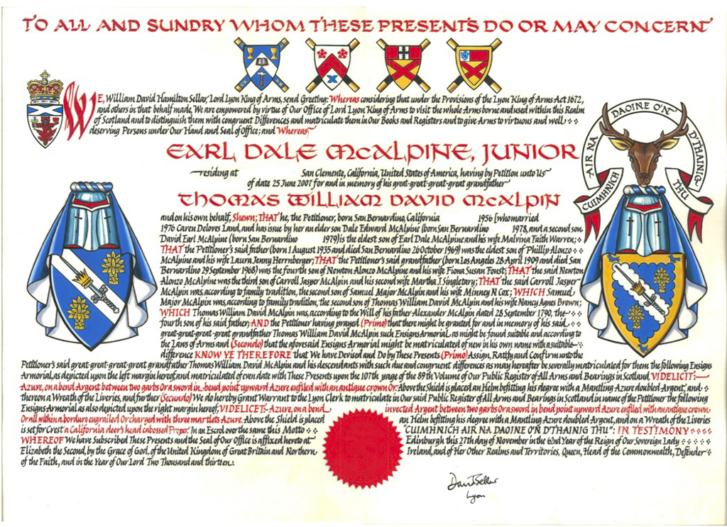 as the thirteenth Laird of the name, and that he is descended in the direct male line from William McKerrell