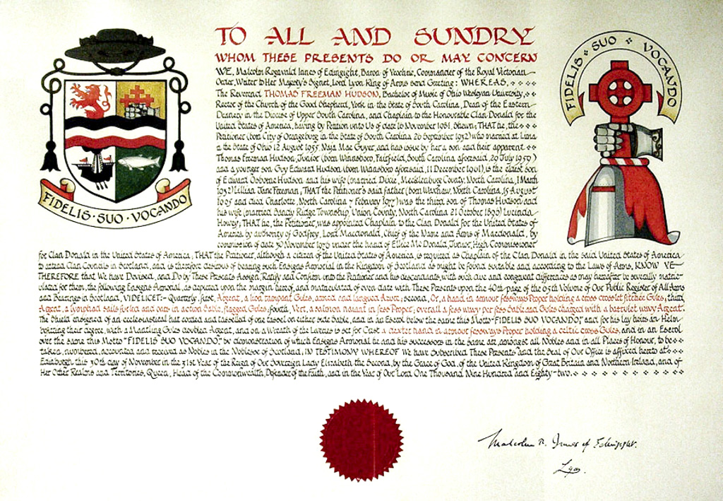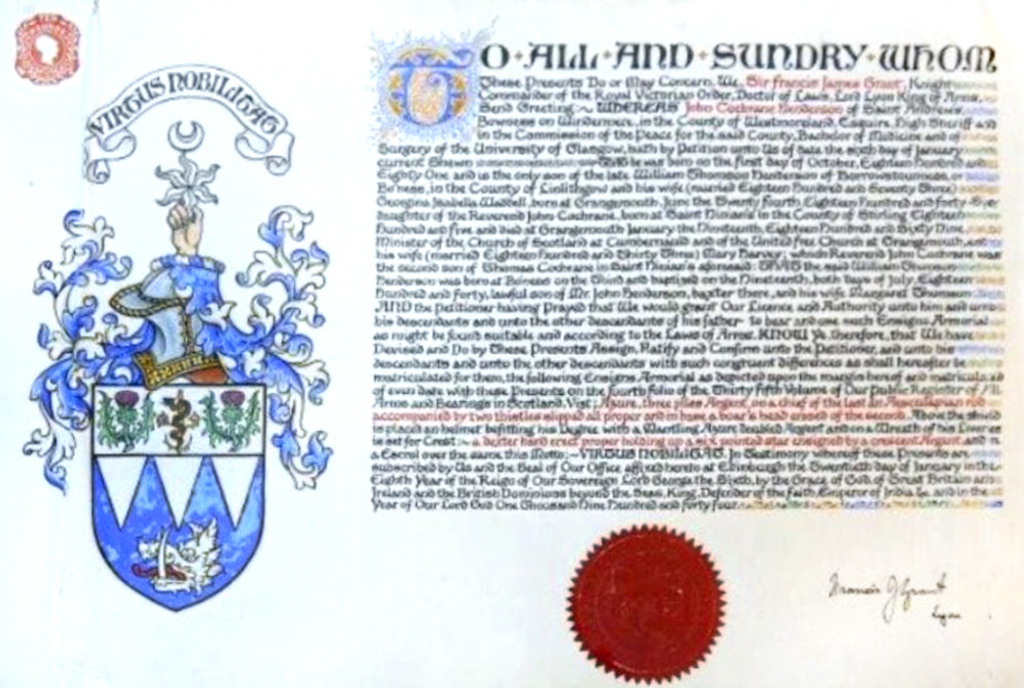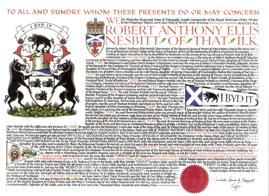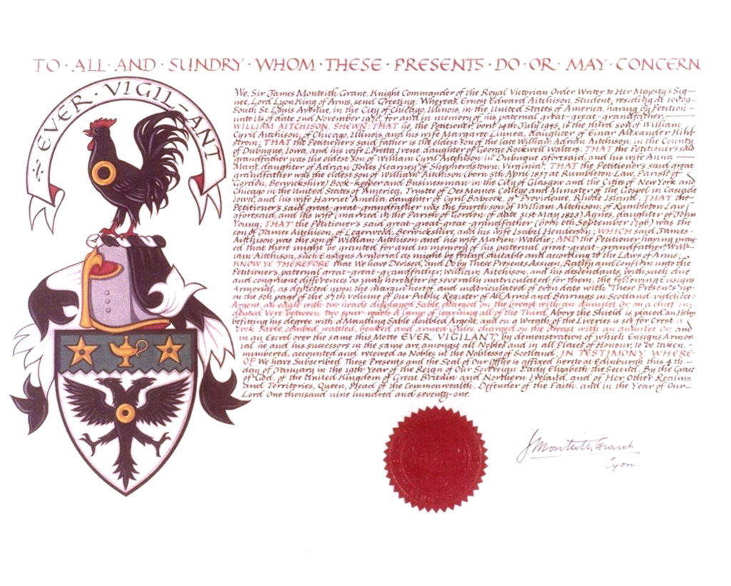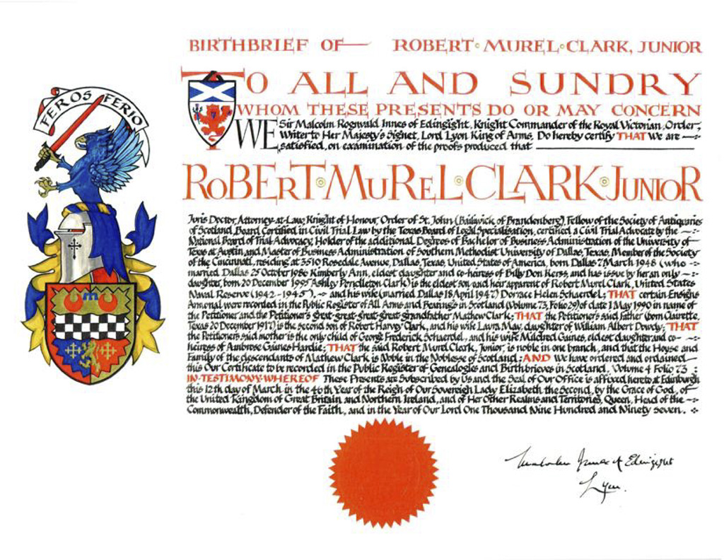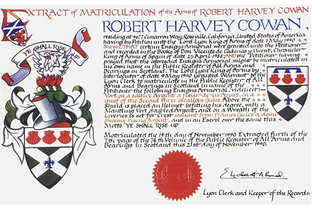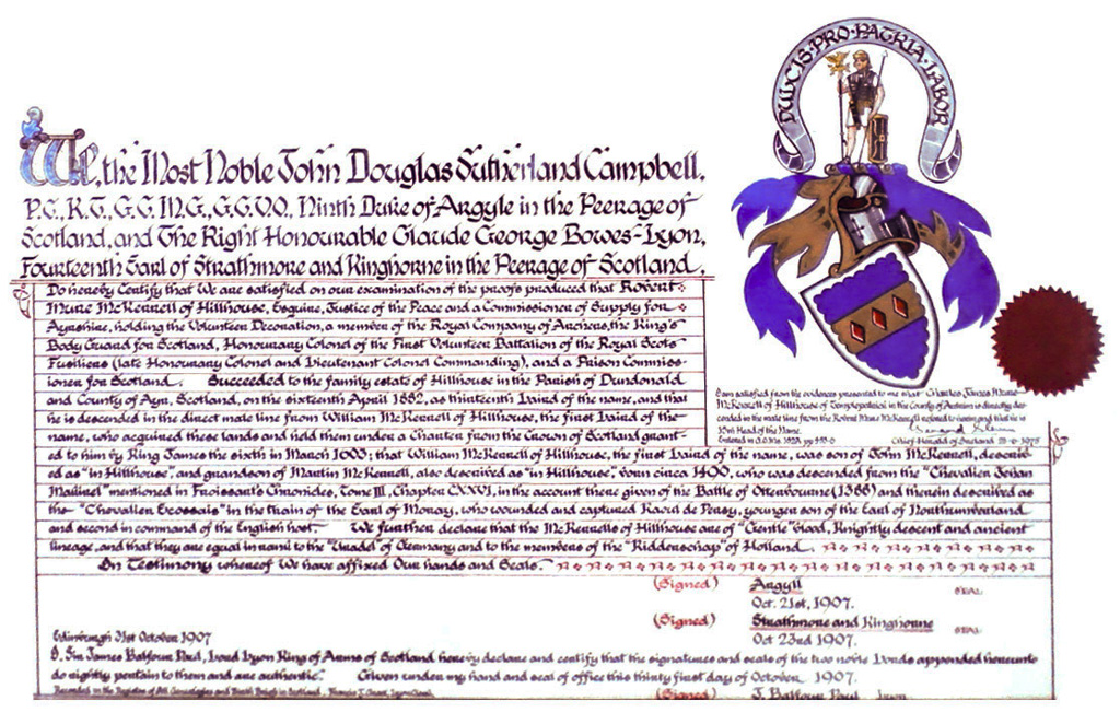 Do hereby Certify that We are satisfied on our examination of the proofs produced that Robert Mure McKerrell of Hillhouse, Esquire Justice of the Peace and Commissioner of Supply for Ayrshire, holding the Volunteer Decoration, a member of the Royal Company of Archers, the King's Bodyguard for Scotland, Honorary Colonel of the First Volunteer Battalion of the Royal Scots Fusiliers (late Honorary Colonel and Lieutenant Colonel Commanding ), and a Prison Commissioner for Scotland. Succeeded to the family estate of Hillhouse in the Parish of Dundonald and County of Ayr, Scotland on the sixteenth of April 1882,