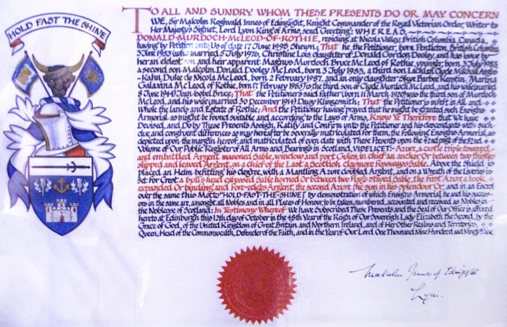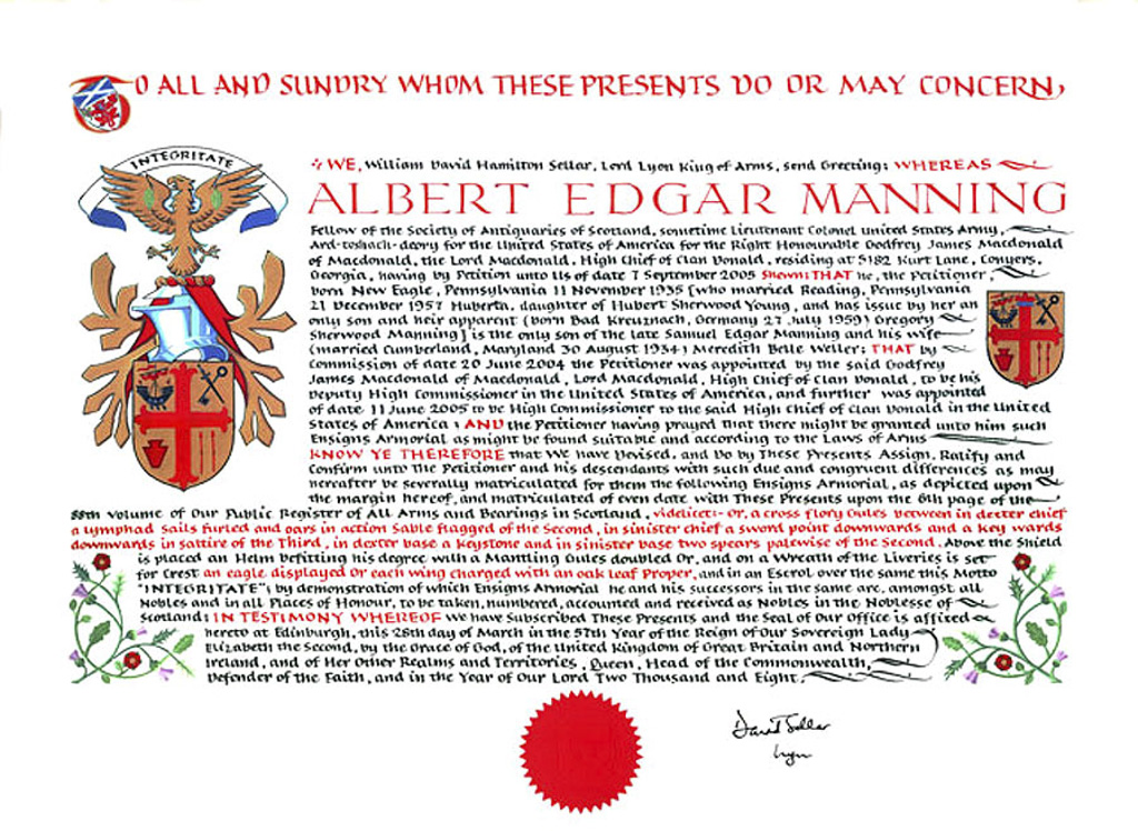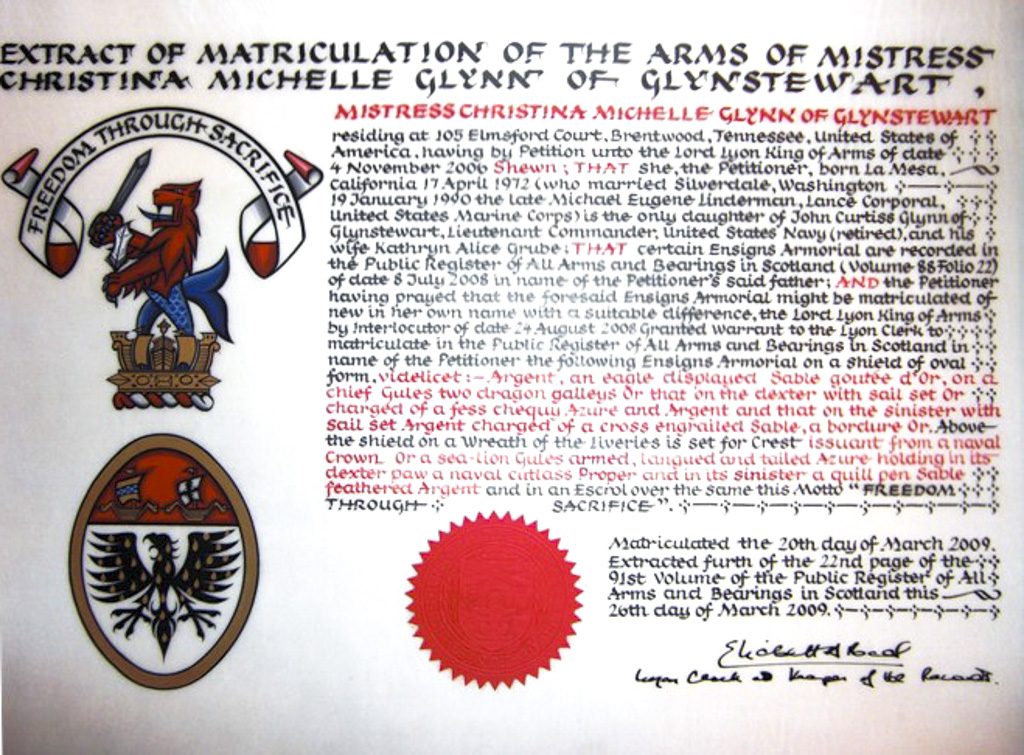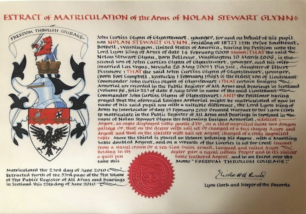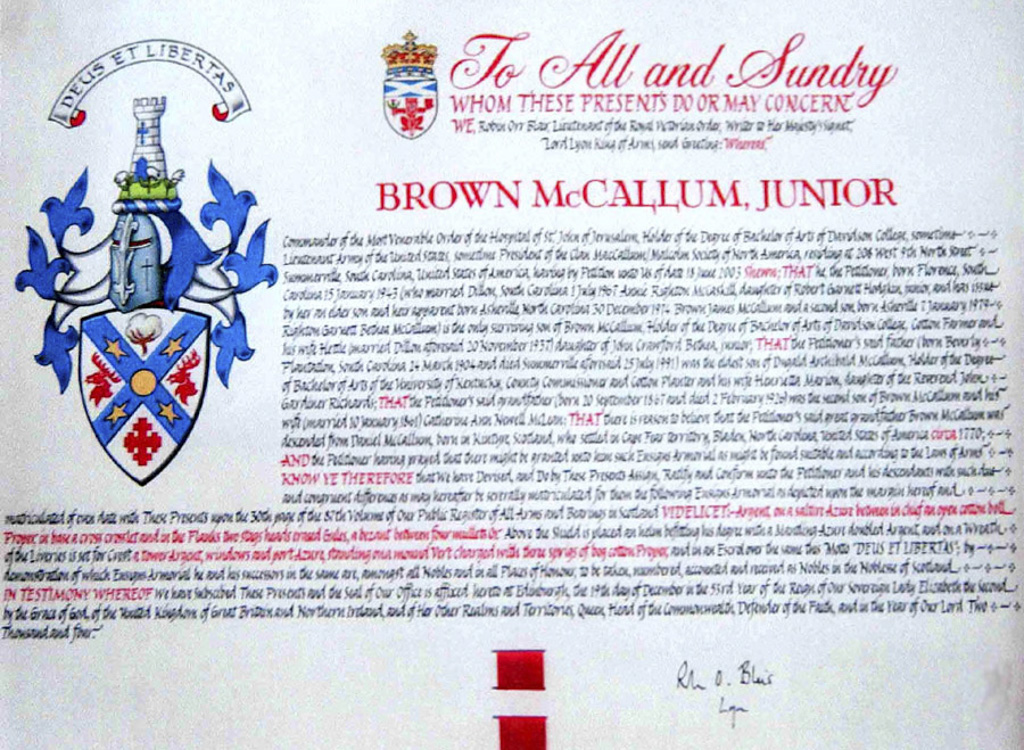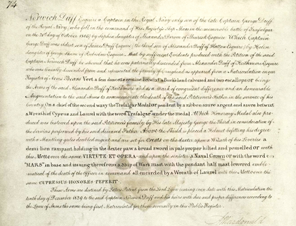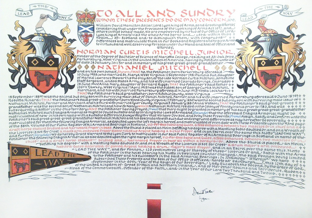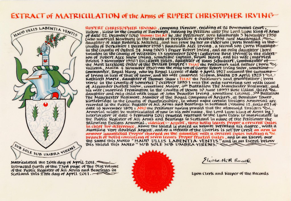 Do hereby Certify that We are satisfied on our examination of the proofs produced that Robert Mure McKerrell of Hillhouse, Esquire Justice of the Peace and Commissioner of Supply for Ayrshire, holding the Volunteer Decoration, a member of the Royal Company of Archers, the King's Bodyguard for Scotland, Honorary Colonel of the First Volunteer Battalion of the Royal Scots Fusiliers (late Honorary Colonel and Lieutenant Colonel Commanding ), and a Prison Commissioner for Scotland. Succeeded to the family estate of Hillhouse in the Parish of Dundonald and County of Ayr, Scotland on the sixteenth of April 1882,