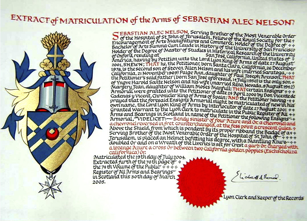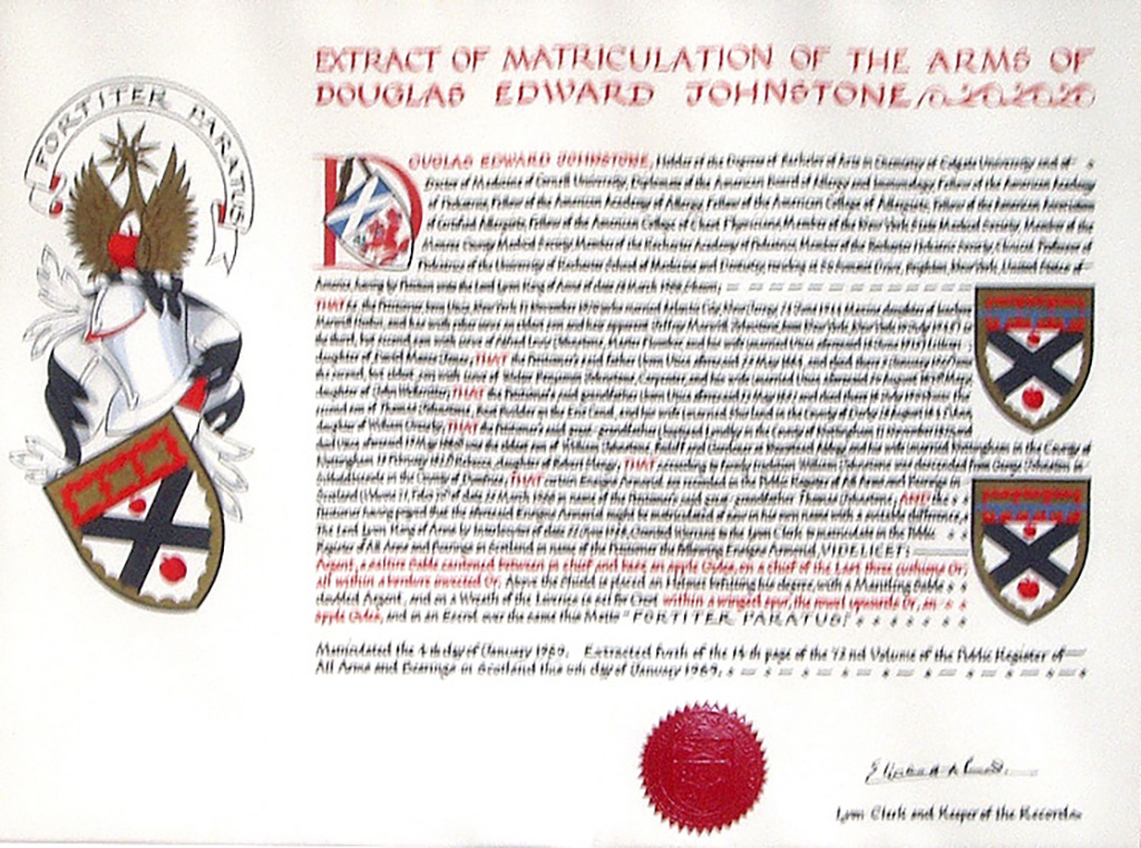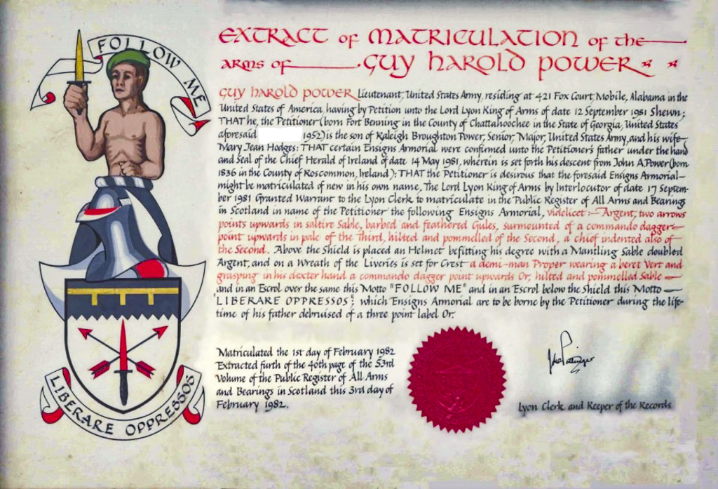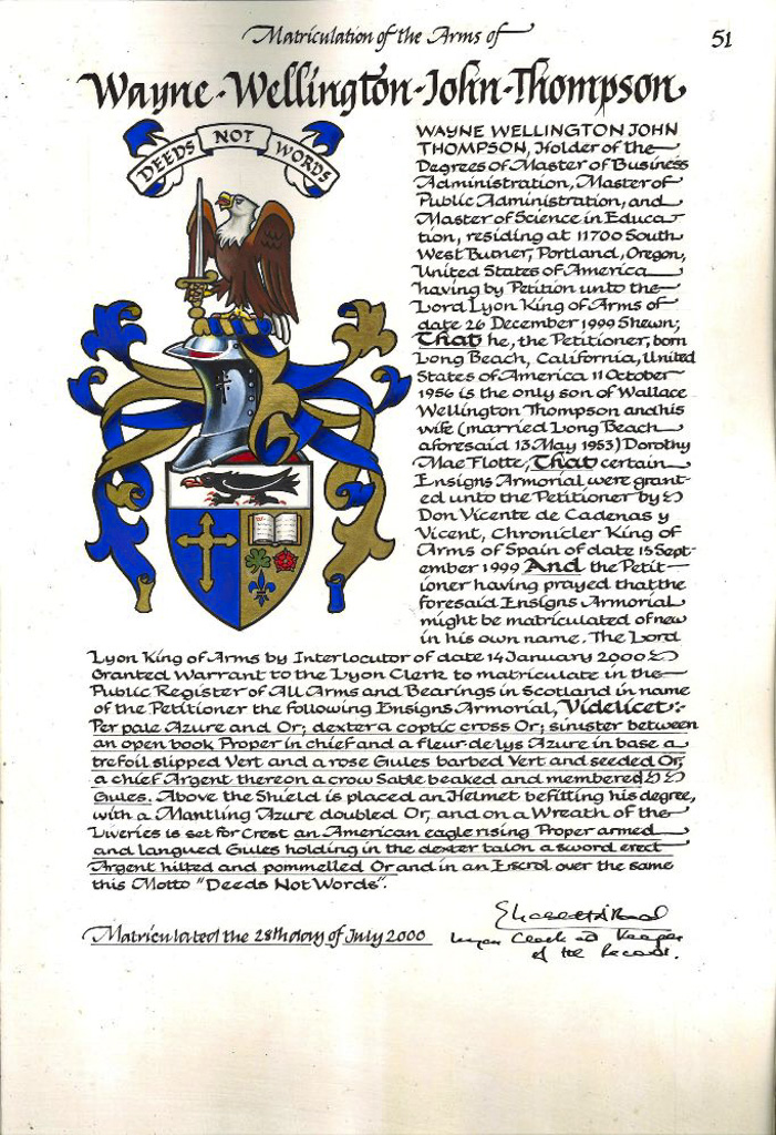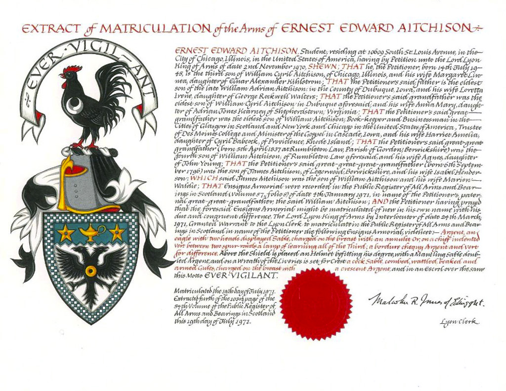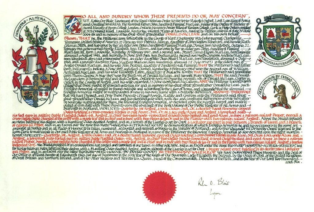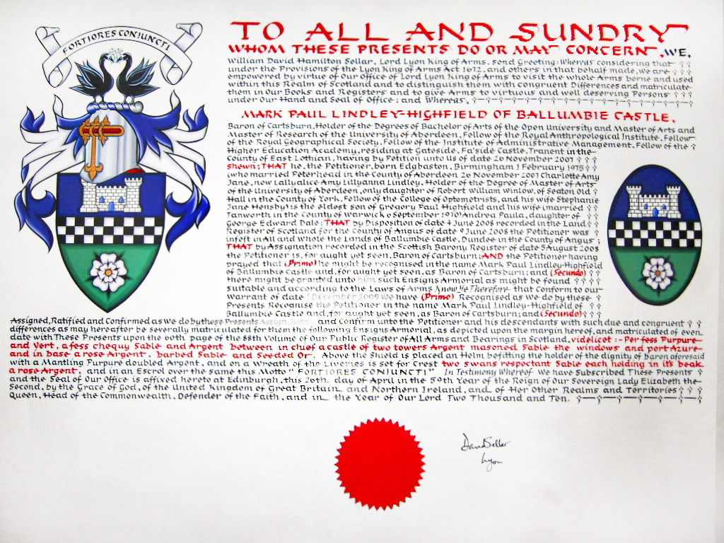 Do hereby Certify that We are satisfied on our examination of the proofs produced that Robert Mure McKerrell of Hillhouse, Esquire Justice of the Peace and Commissioner of Supply for Ayrshire, holding the Volunteer Decoration, a member of the Royal Company of Archers, the King's Bodyguard for Scotland, Honorary Colonel of the First Volunteer Battalion of the Royal Scots Fusiliers (late Honorary Colonel and Lieutenant Colonel Commanding ), and a Prison Commissioner for Scotland. Succeeded to the family estate of Hillhouse in the Parish of Dundonald and County of Ayr, Scotland on the sixteenth of April 1882,