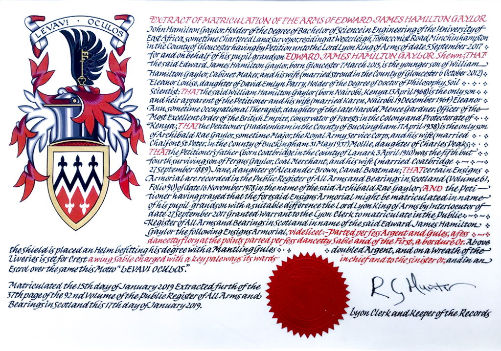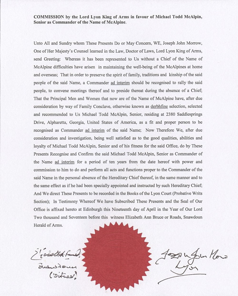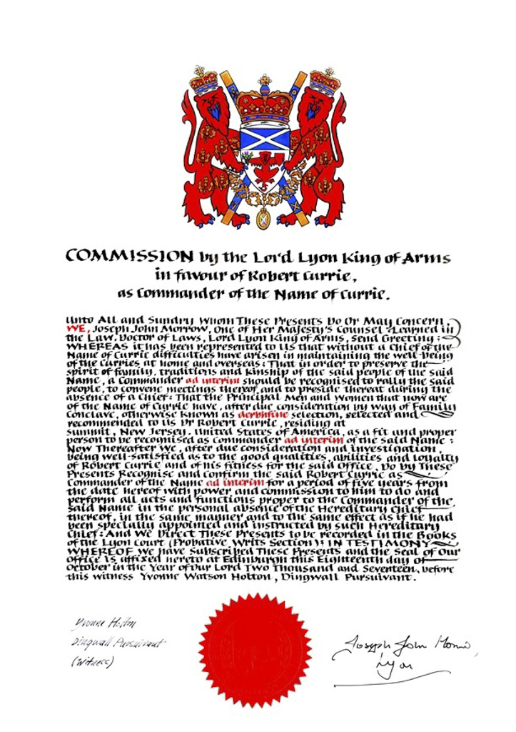 I am satisfied from the evidence given that Charles James Mure McKerrell of Hillhouse of Templepatrick in the County of Antrim is descended in the male line from the Robert Mure McKerrell referred to herein and that he is 15th Head of the Name.