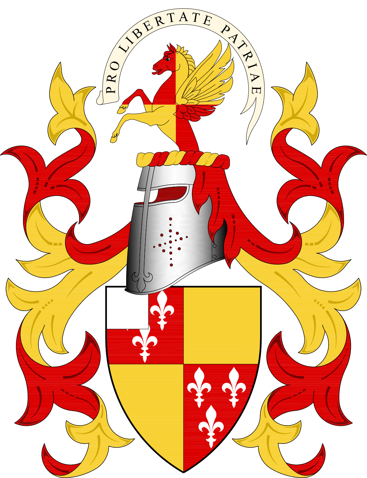 Crest: A demi-pegasus forcené wings elevated and addorsed quarterly Gules and Or.