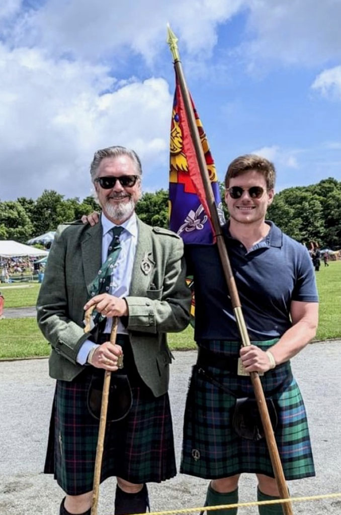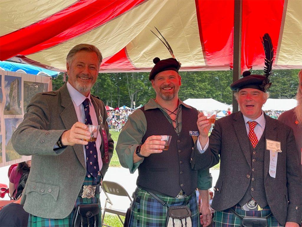 Having a sip are from L to R: first Andrew Morrison, Viscount Dunrossil, next Scott Turner, a chieftain of Clan Lamont, High Commissioner for Clan Lamont in the US and President of the Clan Lamont Society of North America, lastly Sebastian Leslie who is a chieftain of Clan Leslie.