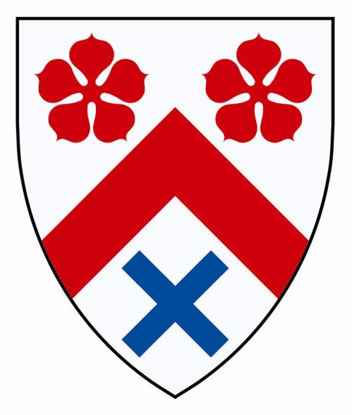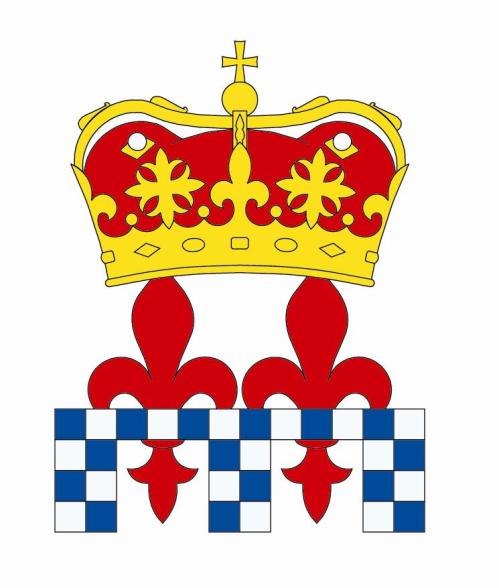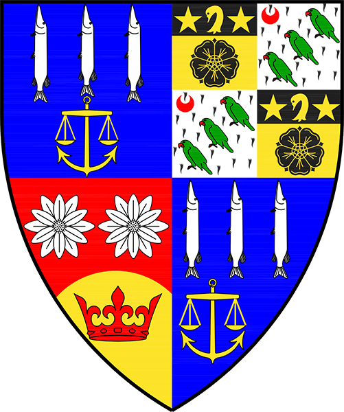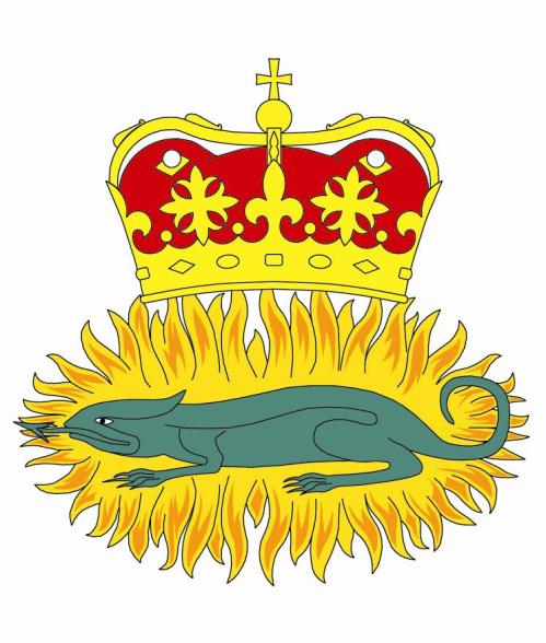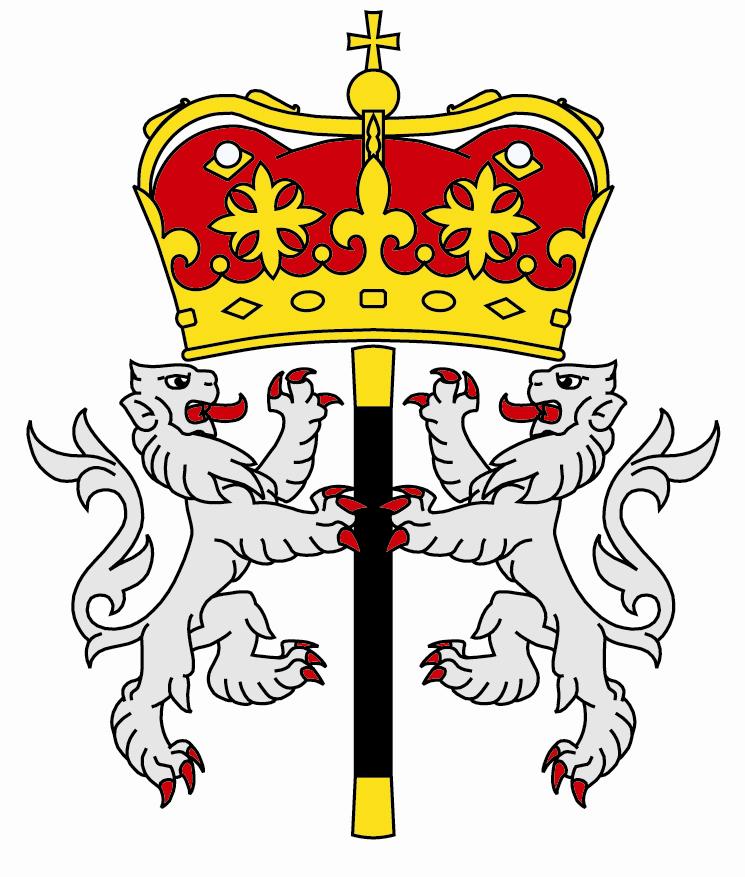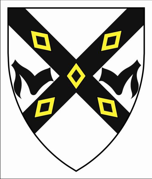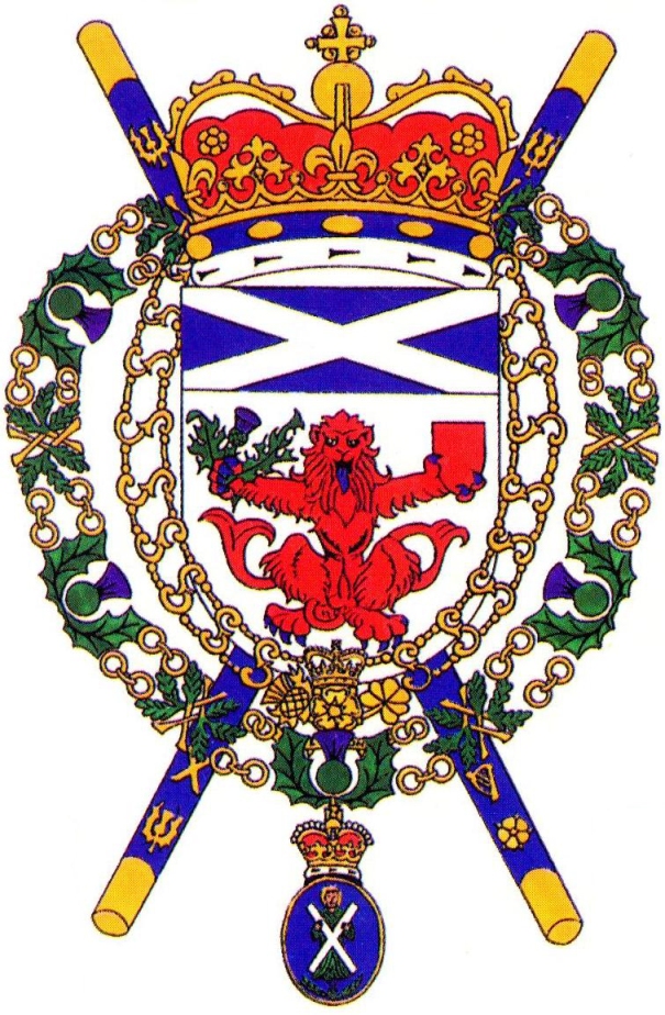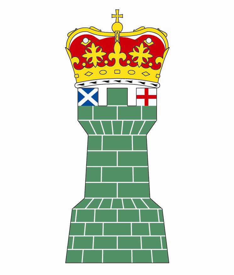 Blazon of the badge: A tower of three castellations Vert, masoned Argent, the dexter castellation Azure, charged of a saltire Argent, the sinister castellation Argent, charged of a cross Gules, all ensigned of the Crown of Scotland Proper.