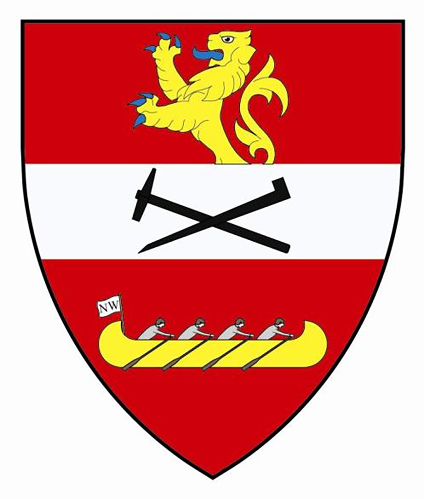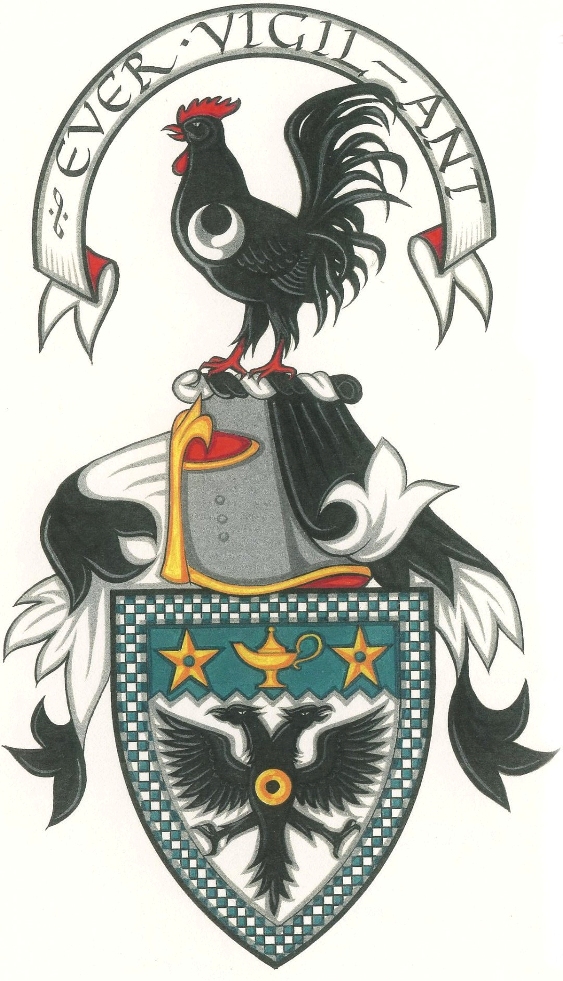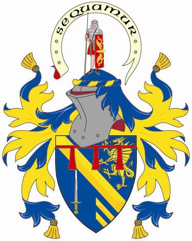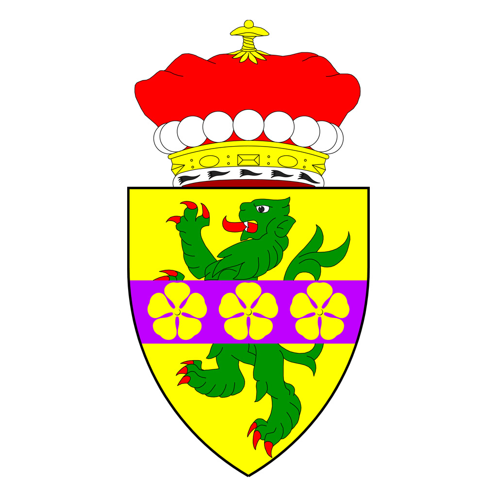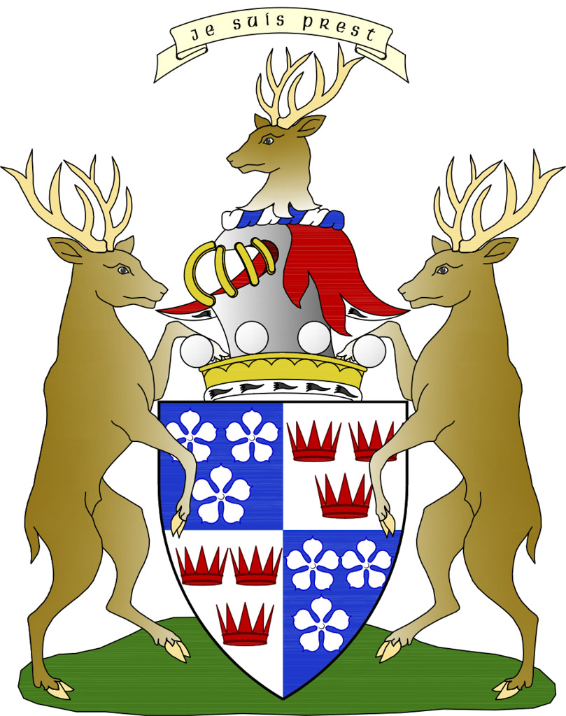 Arms: Vert a fess dancetty Ermine between a stag’s head cabossed in chief and two escallops in base Or; on a chief wavy Ermine the Trafalgar medal Or, pendant by a ribbom Azure, Argent, Azure, between wreaths of cypress and laurel with the word “Trafalgar” under the medal.