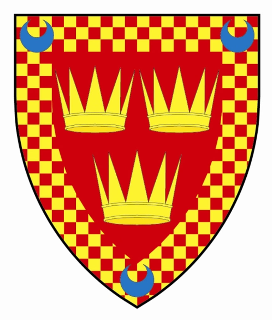 ARMS: Gules three antique crowns or within a bordure chequy of the last and the first charged with three crescents azure.