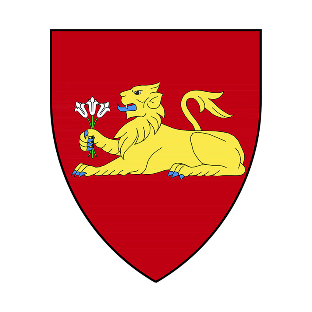 Gules a lion couchant Or holding in its dexter fore-paw a bunch of three lilies slipped proper.
