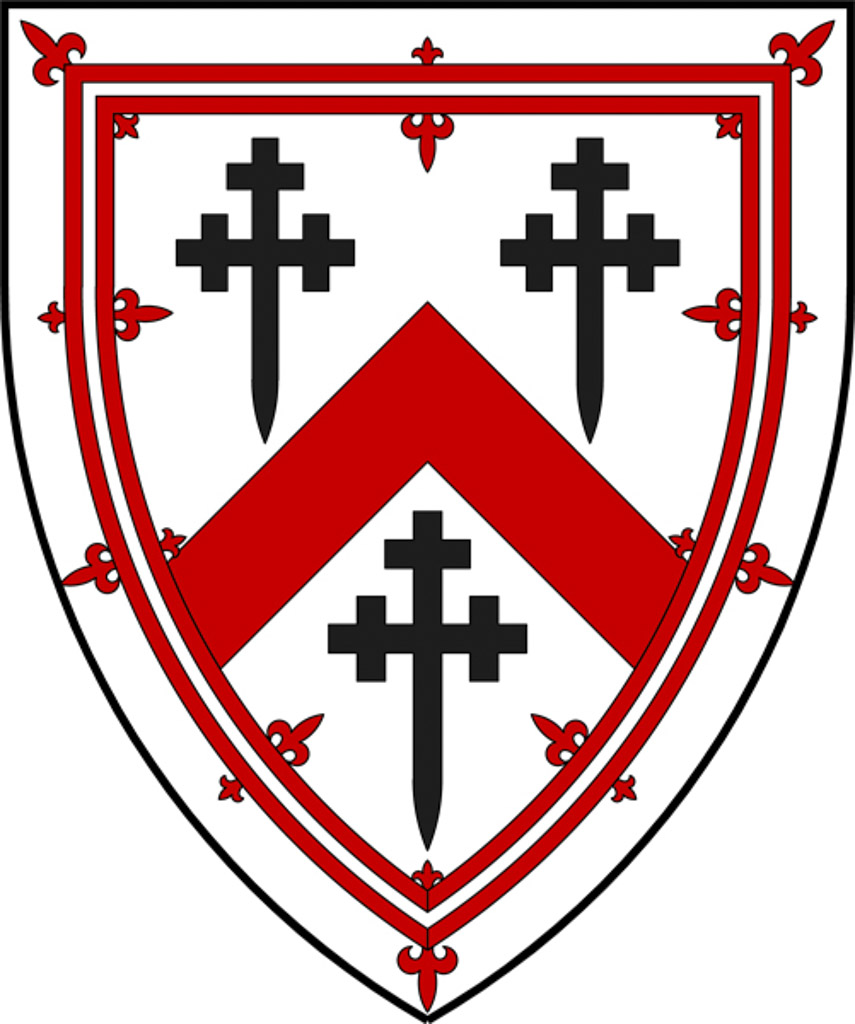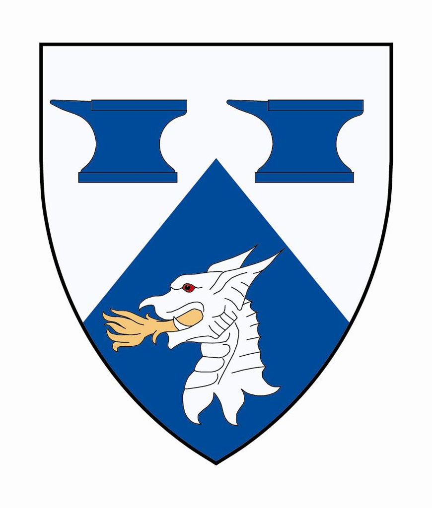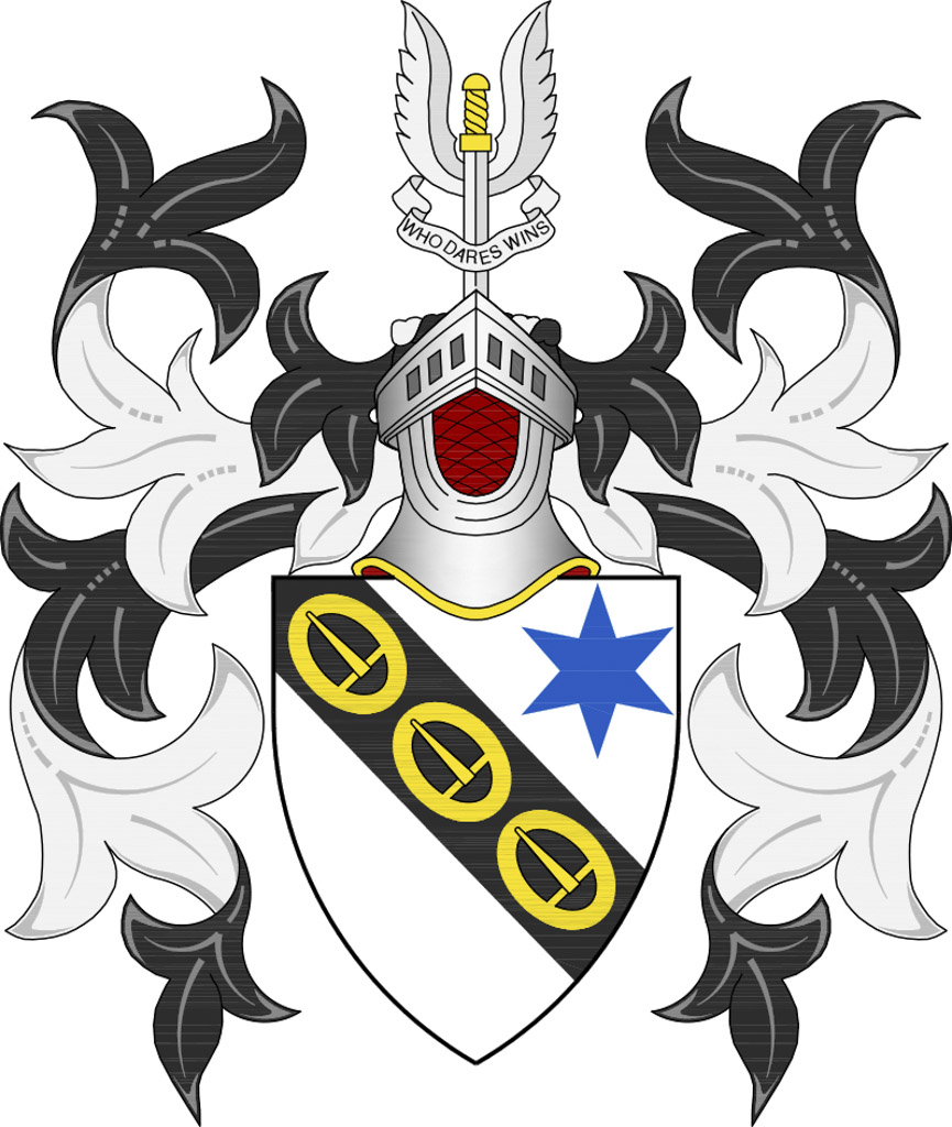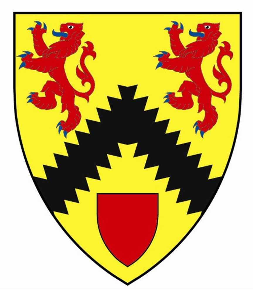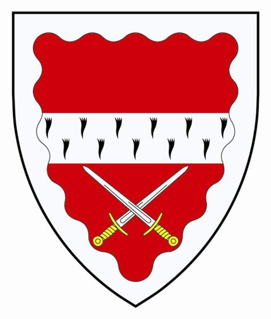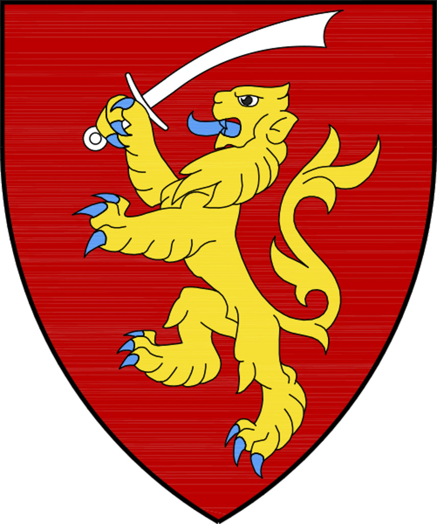 Arms: Gules a chevronel Or in chief two cinquefoils and in base a dragon’s head couped holding between its teeth a sword in bend sinister hilt upward Argent hilt Or pommel Argent.