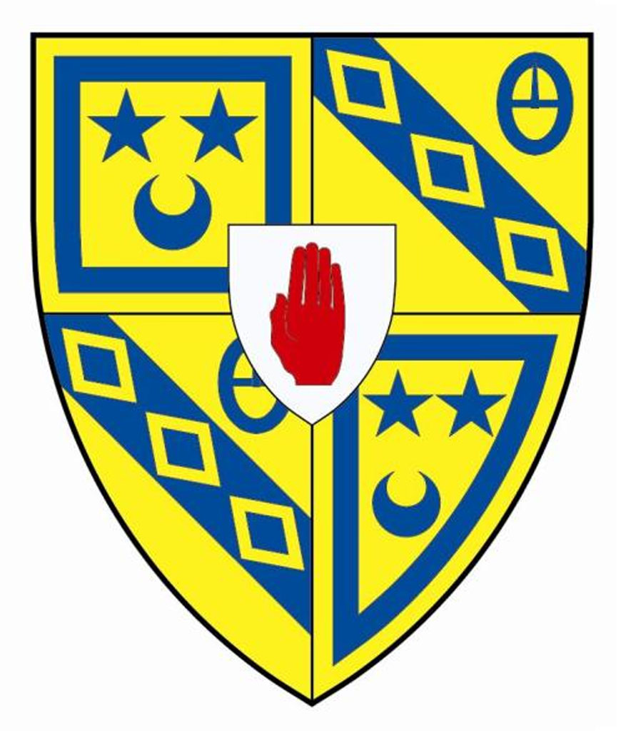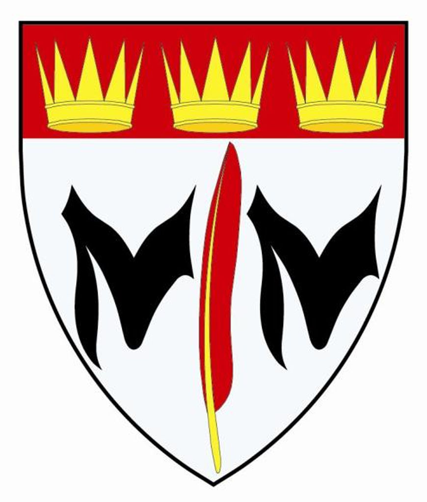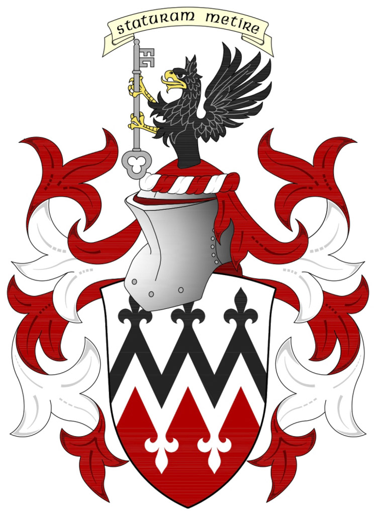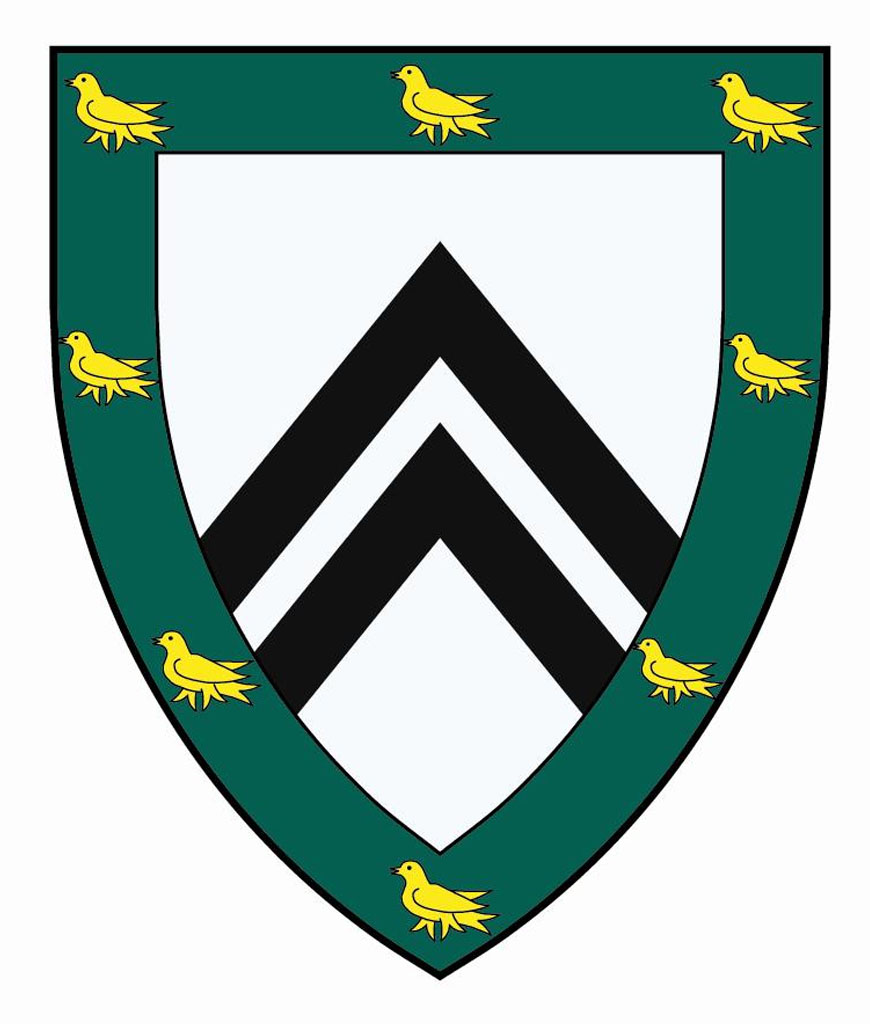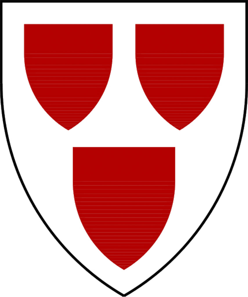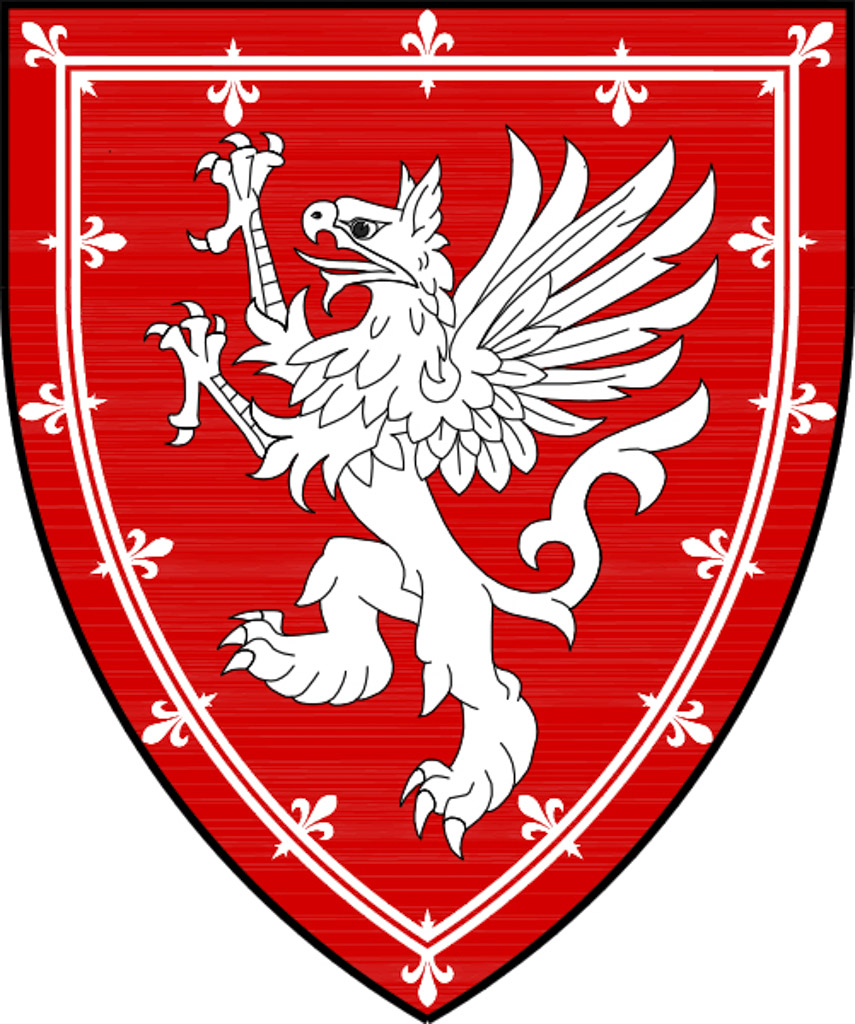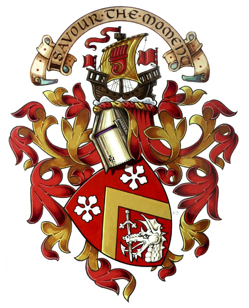 Arms: Gules a chevronel Or in chief two cinquefoils and in base a dragon’s head couped holding between its teeth a sword in bend sinister hilt upward Argent hilt Or pommel Argent.