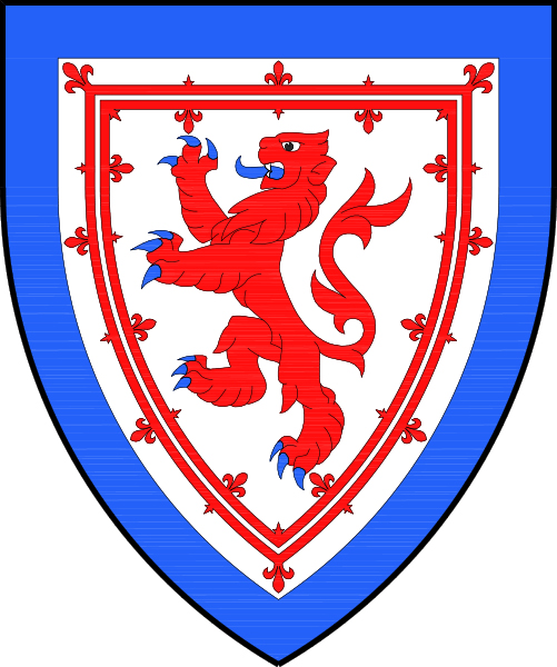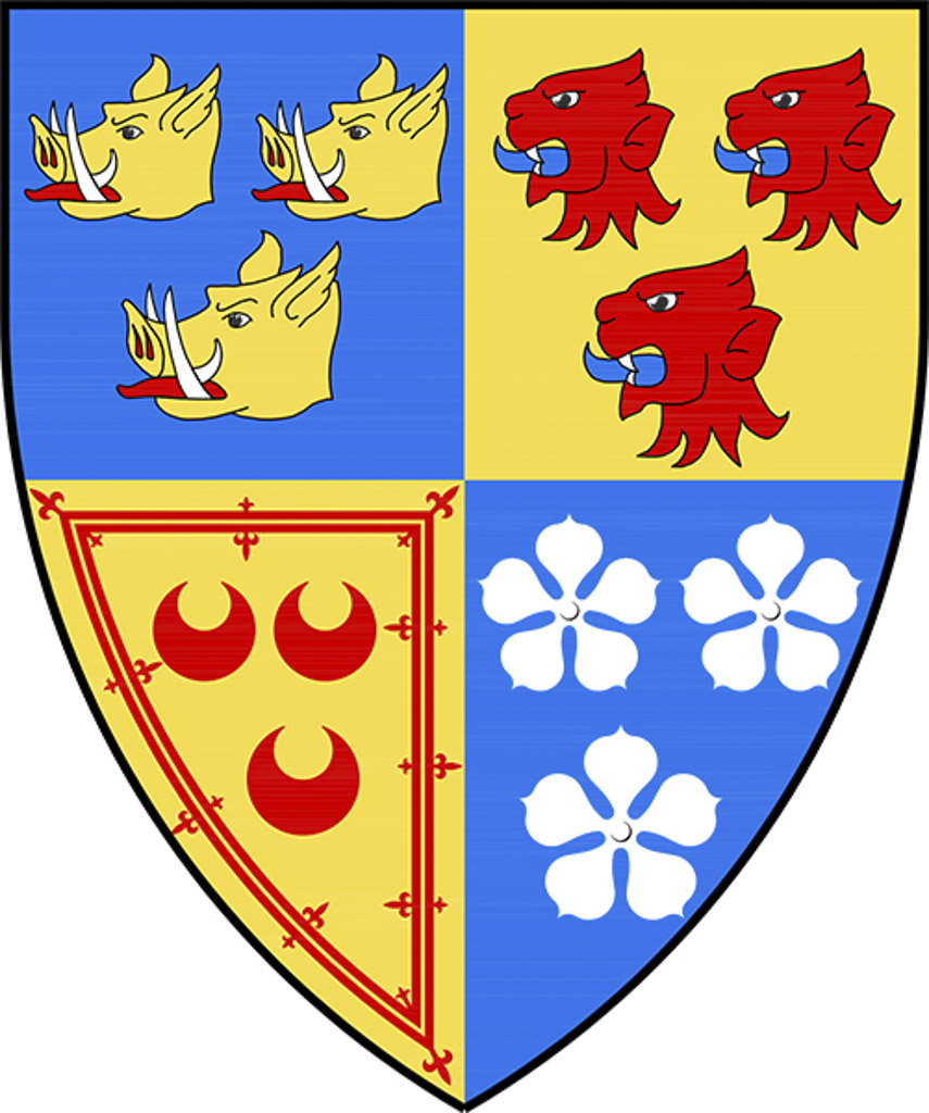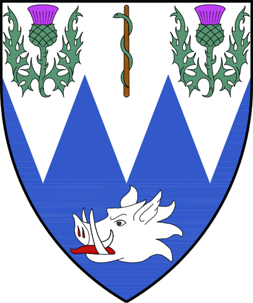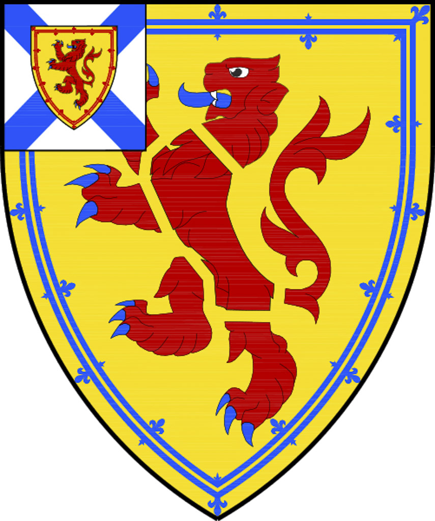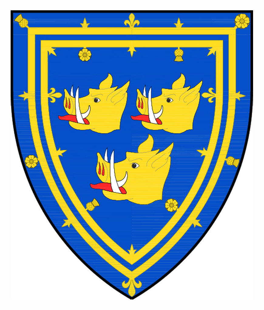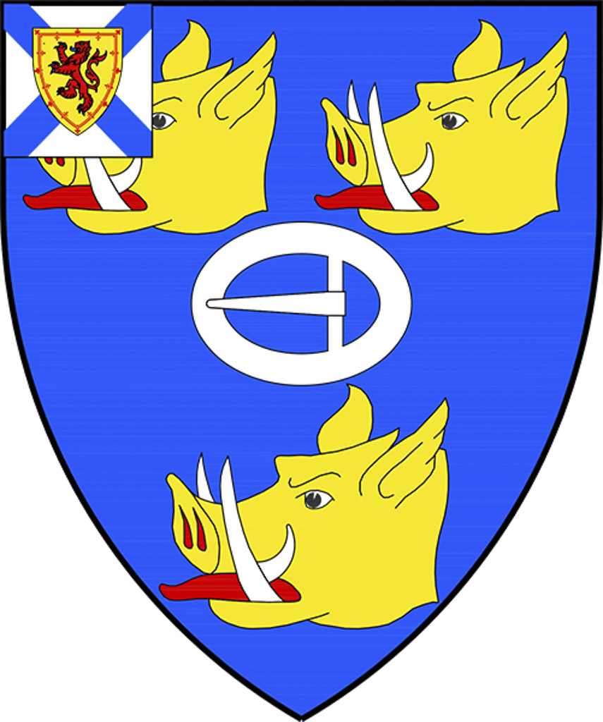 Shield: Azure, three Boar’s Heads couped Or, armed proper, and langued Gules, within a Double-Tressure flory counter-flory interchangeably with Thistles and Fleurs-de-lis Or