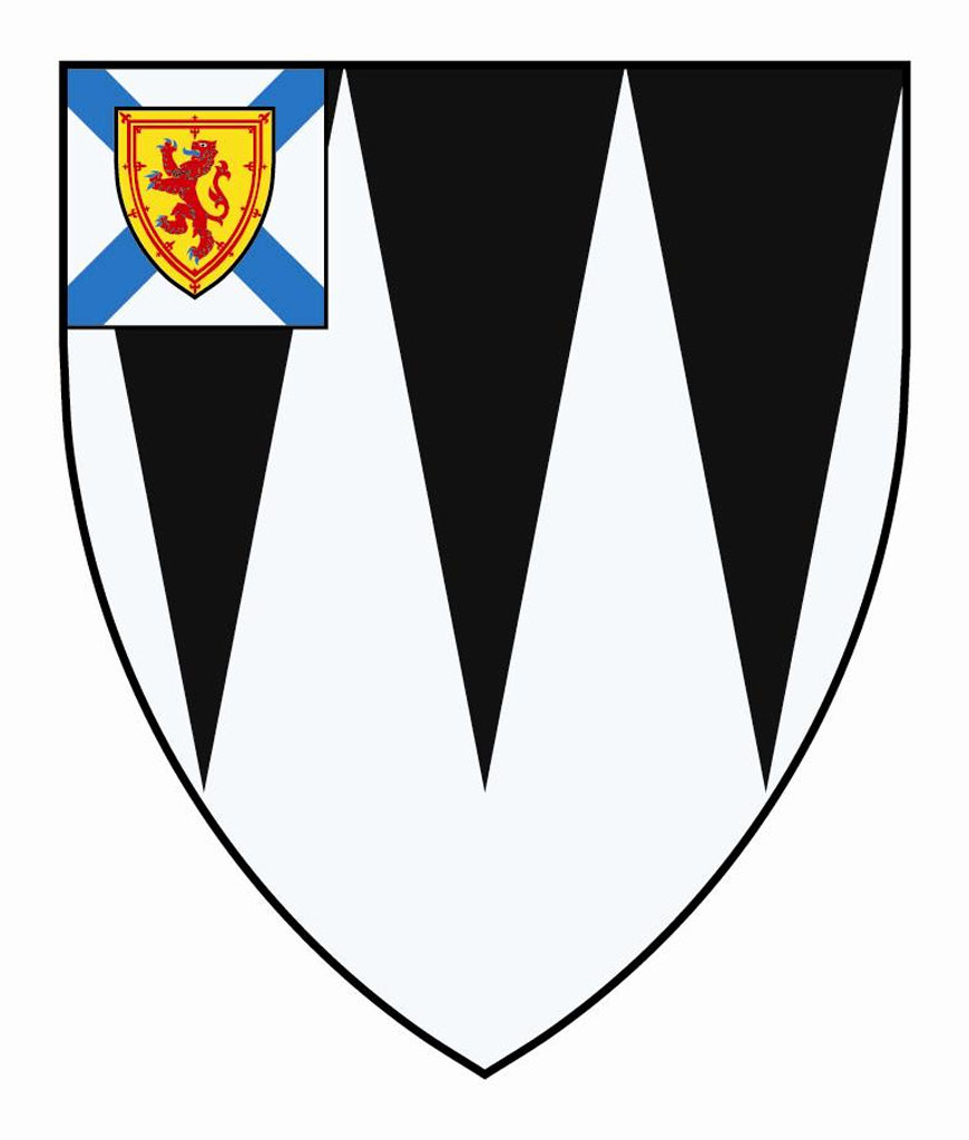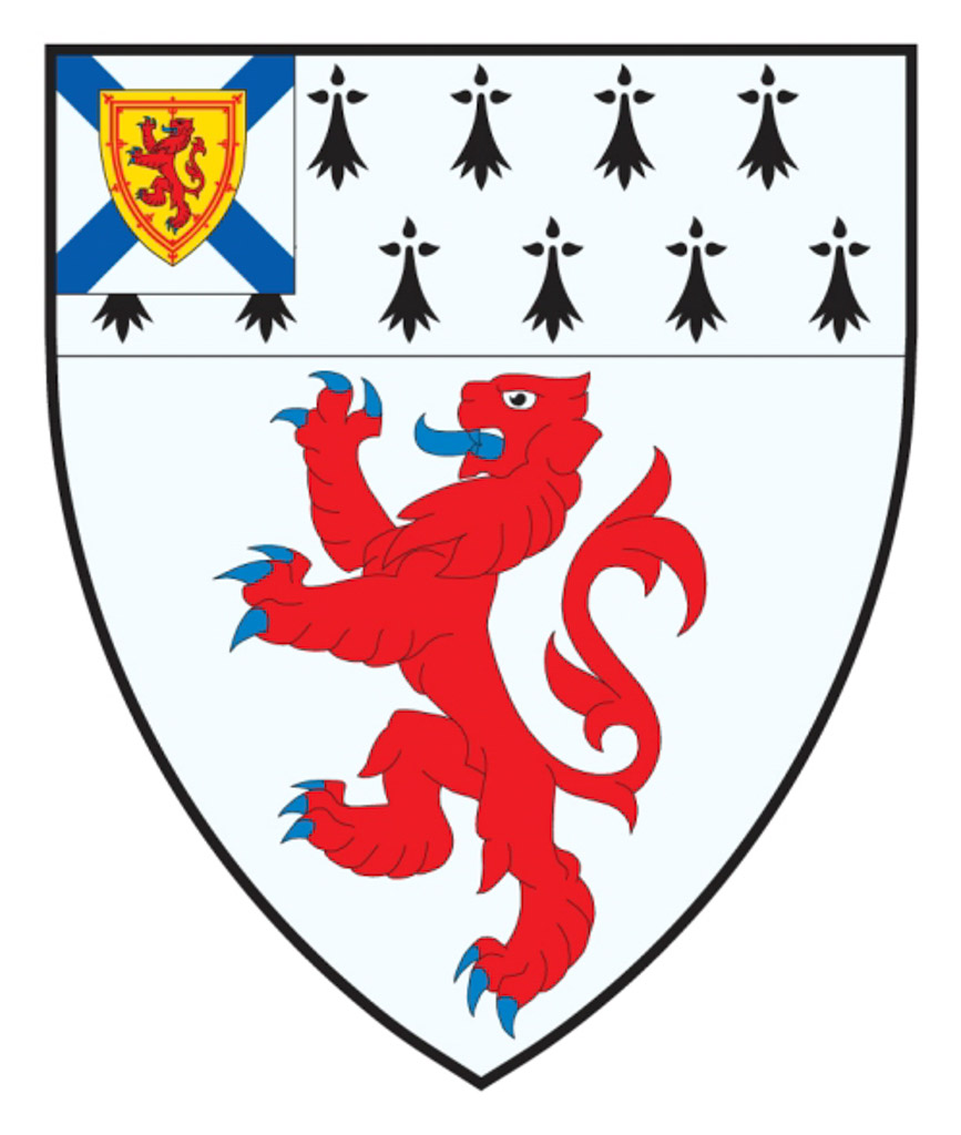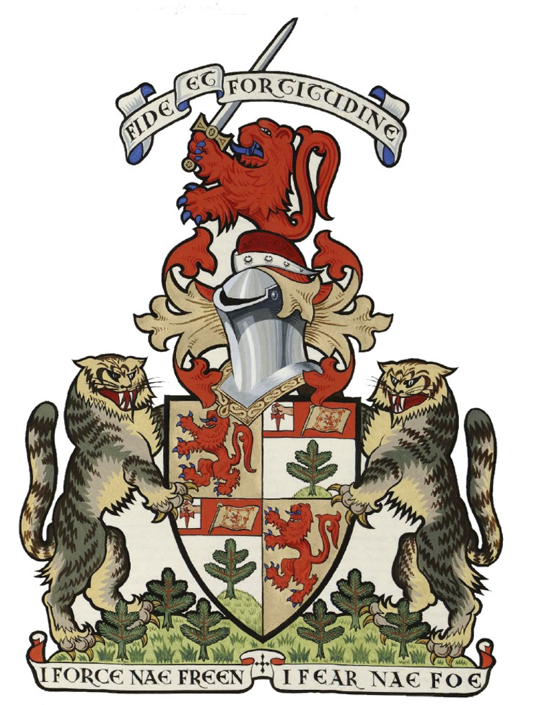 Arms: Quarterly: 1st and 4th, Or a lion rampant gules; 2nd and 3rd, argent a fir tree growing out of a mount in base fructed proper and on a chief gules the Royal Banner of Scotland, and displayed on a canton of the first a hand issuing from the sinister side holding a dagger point downwards proper.