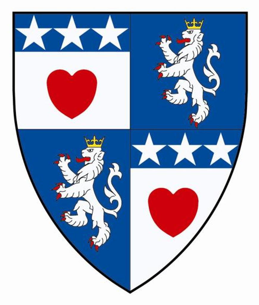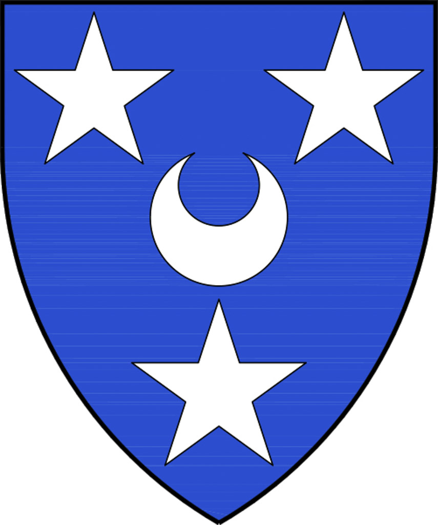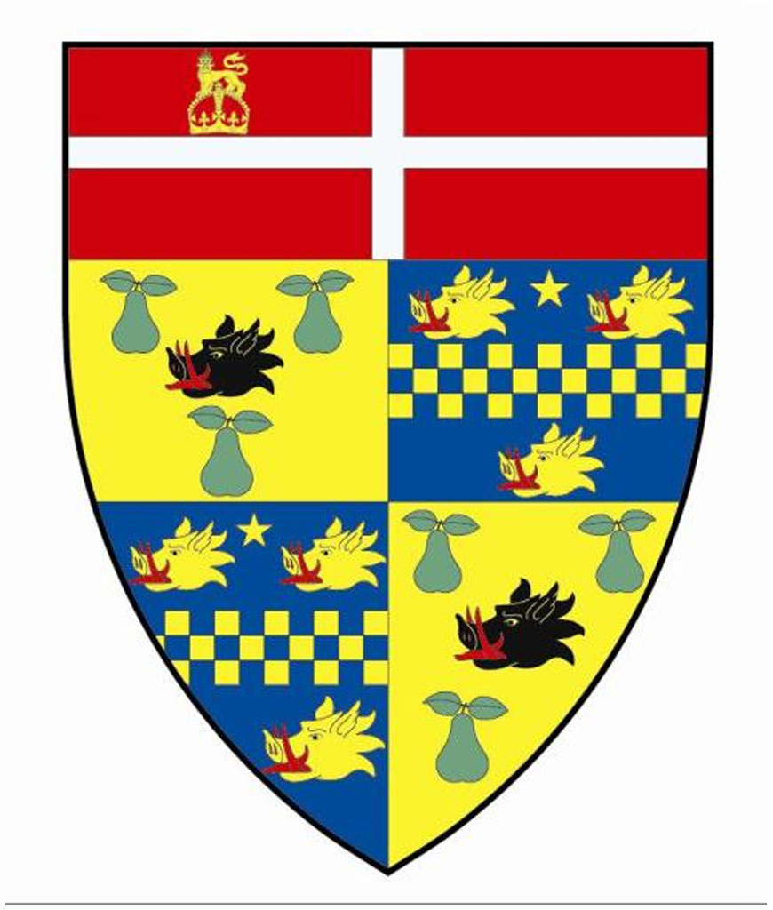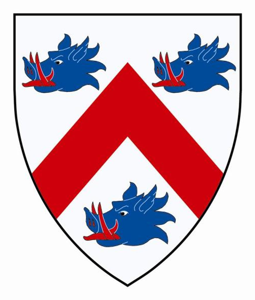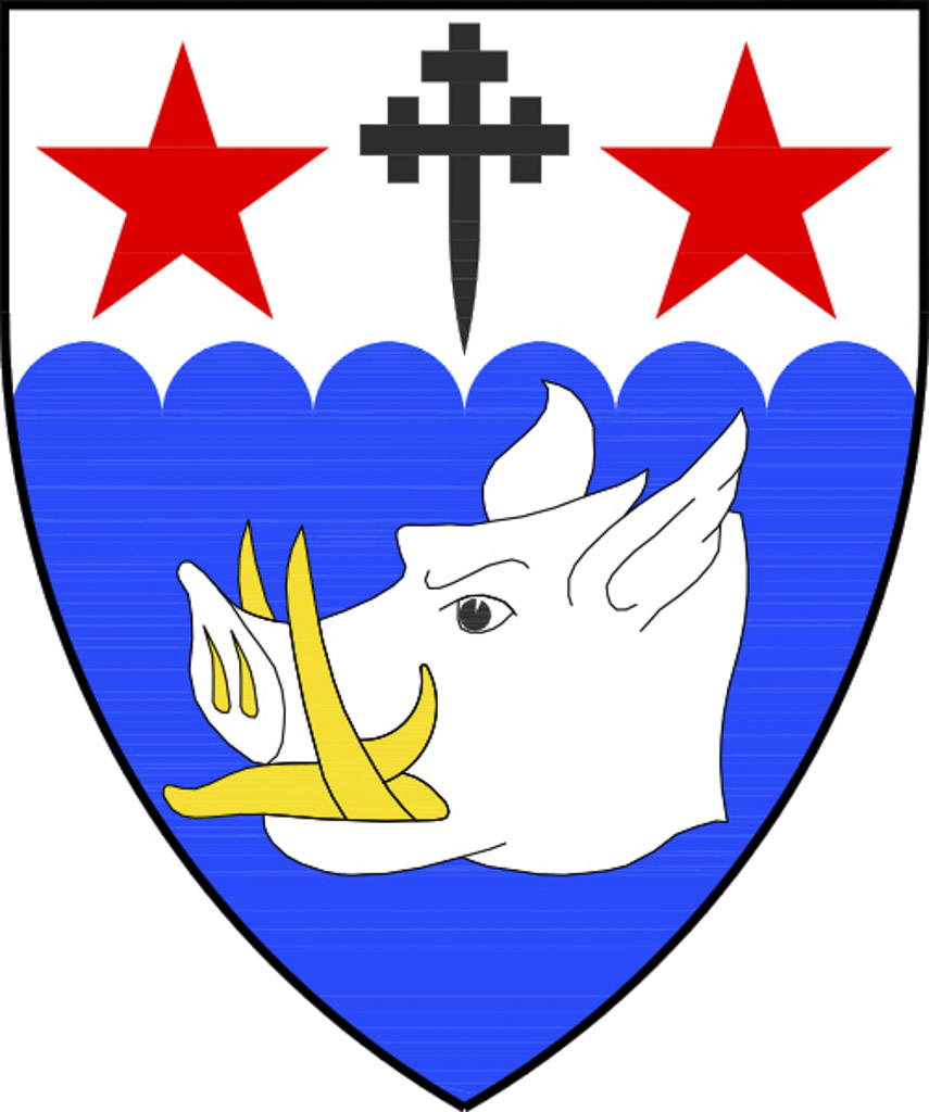 Arms: Azure a boar’s head couped Argent armed and langued Or, and on a chief engrailed Argent a cross crosslet fitchy Sable between two stars Gules.