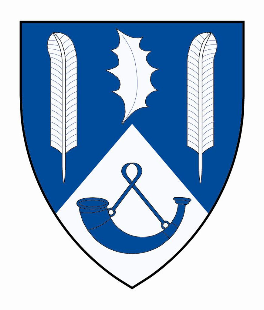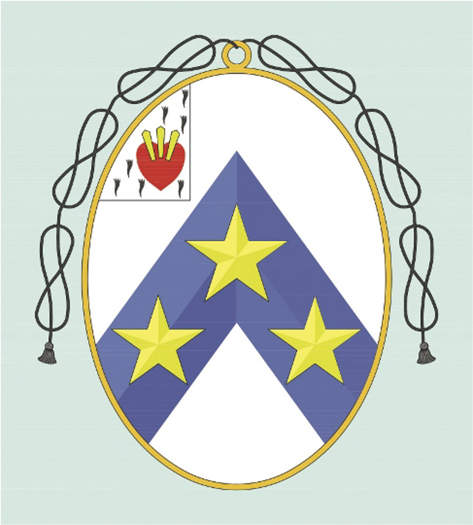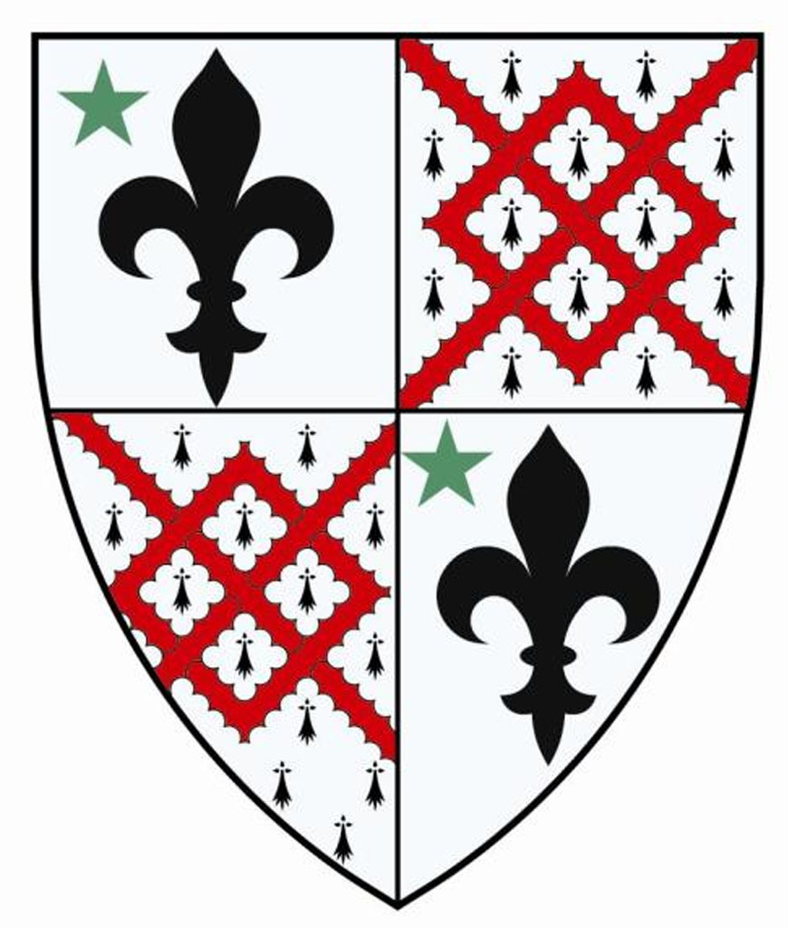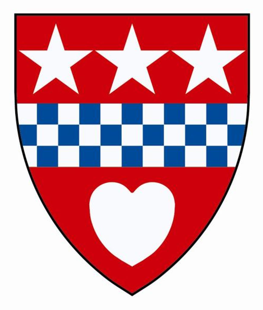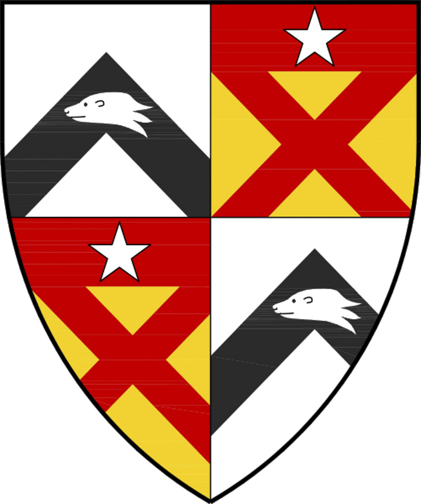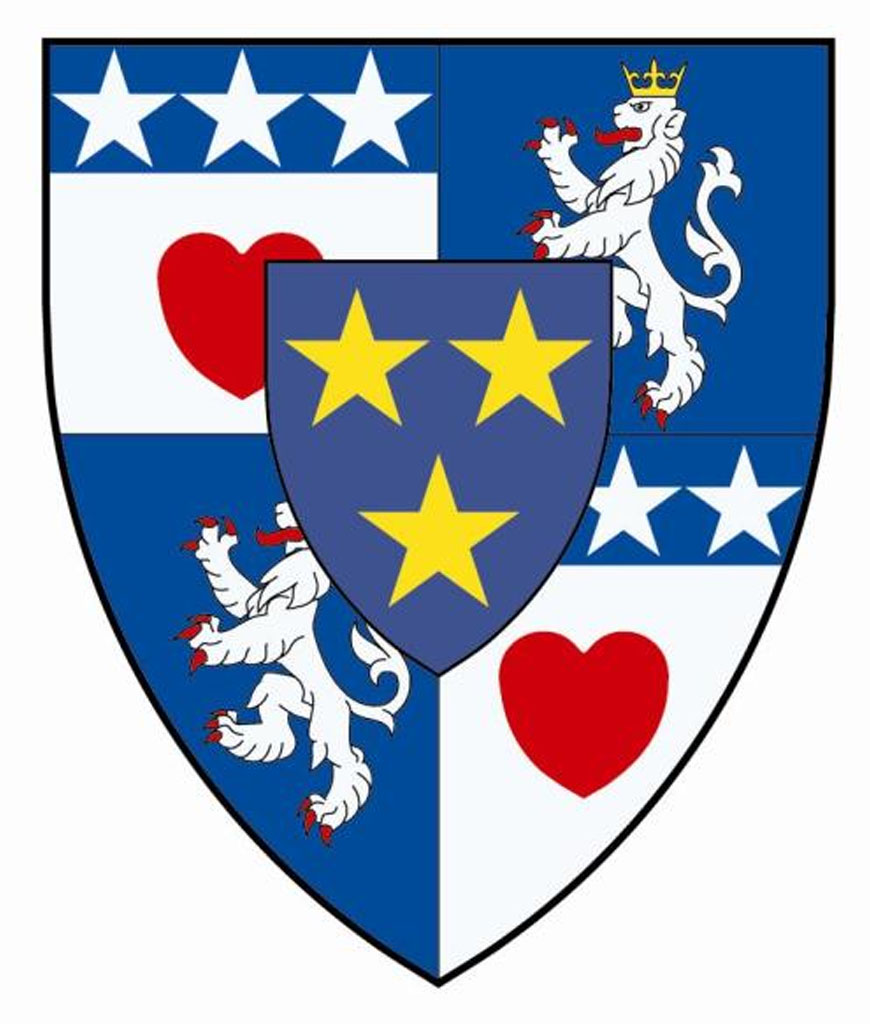 Arms: Azure a boar’s head couped Argent armed and langued Or, and on a chief engrailed Argent a cross crosslet fitchy Sable between two stars Gules.