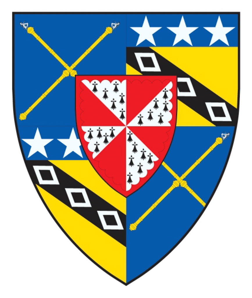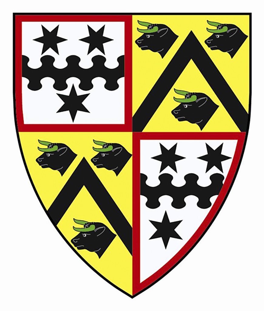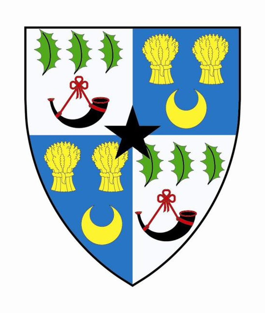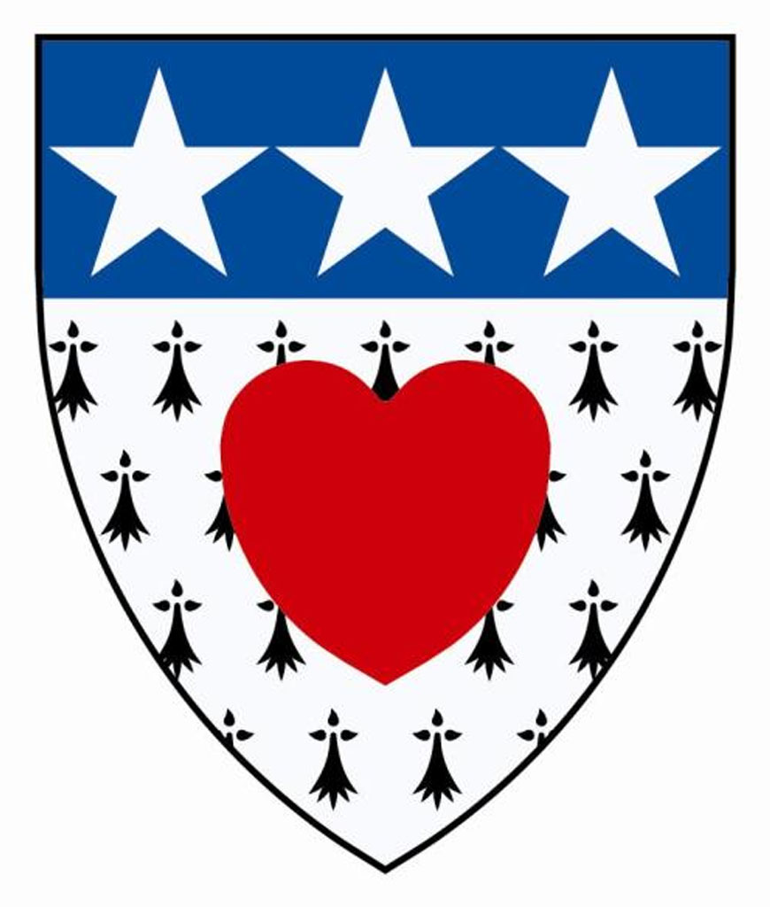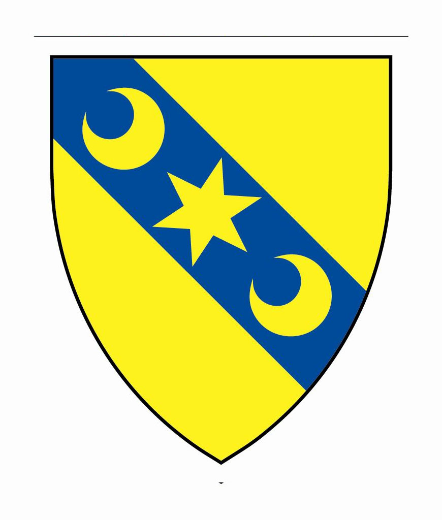 Arms: Azure a boar’s head couped Argent armed and langued Or, and on a chief engrailed Argent a cross crosslet fitchy Sable between two stars Gules.