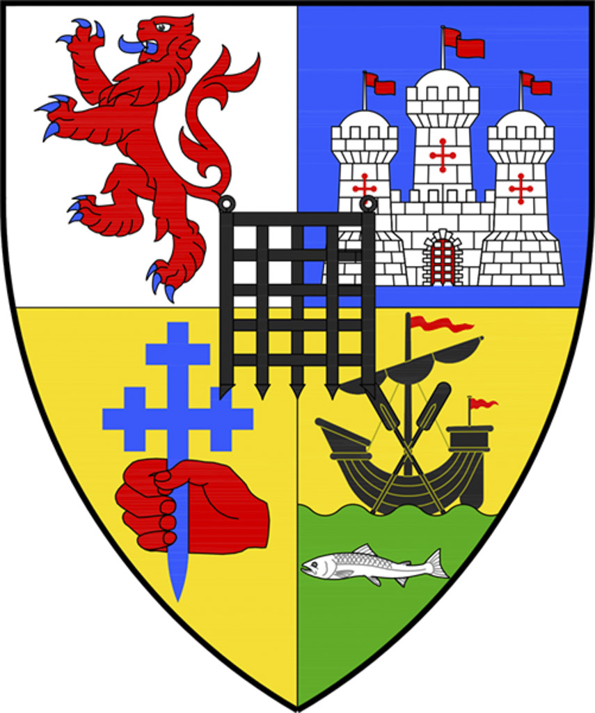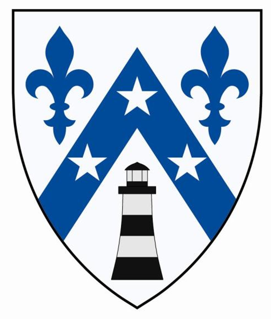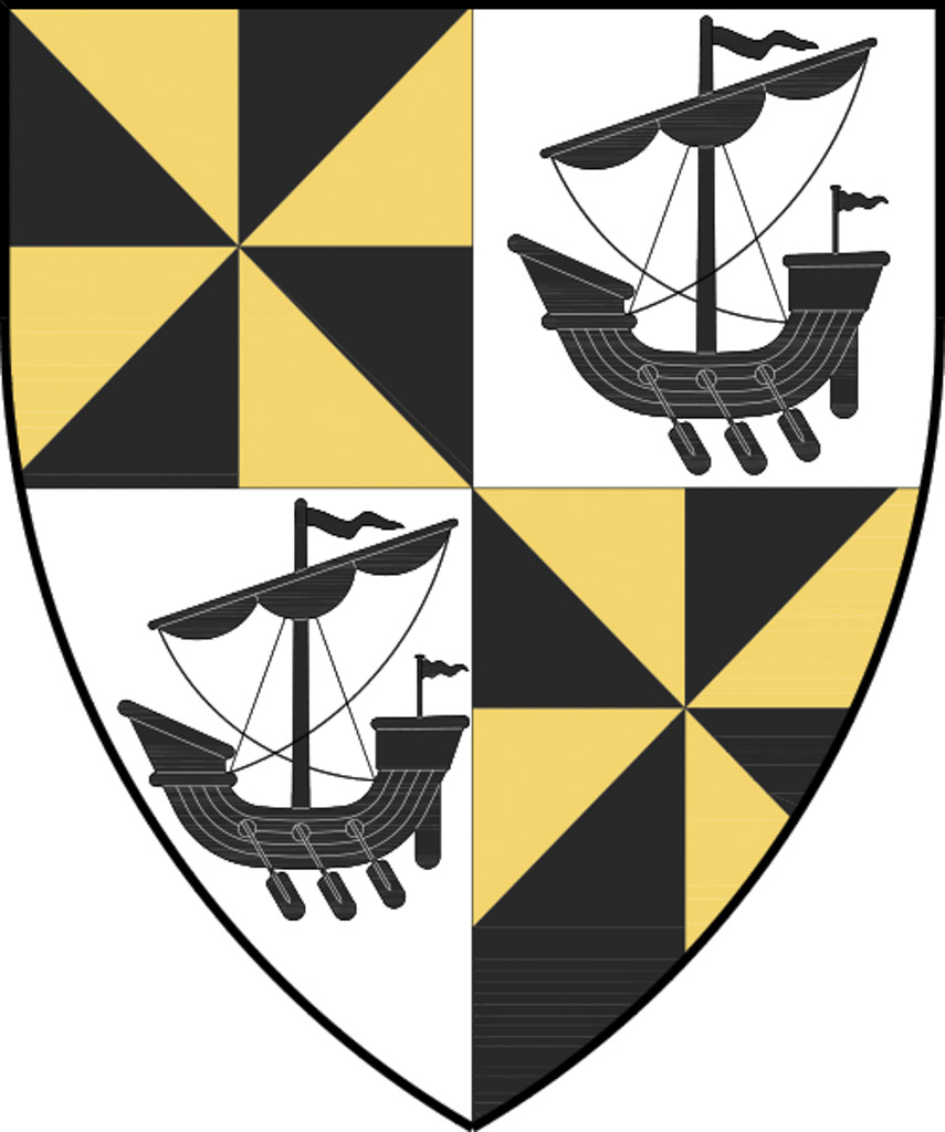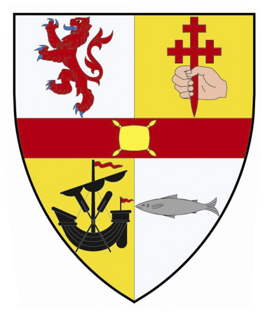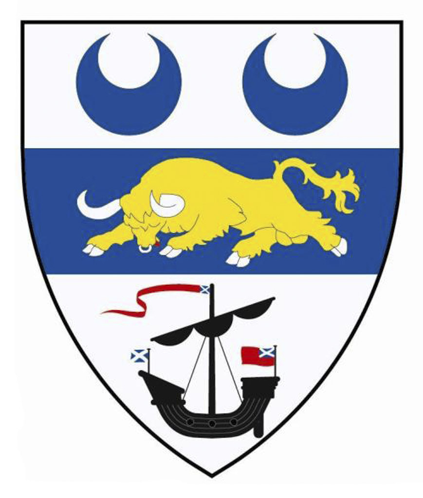 Blazon: Shield: Azure, a lymphad, sails furled, oars in action Or, flagged Argent with a saltire of the first, the masthead pennant Gules, on a