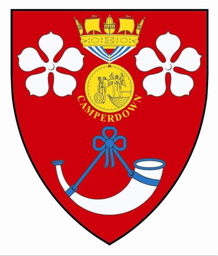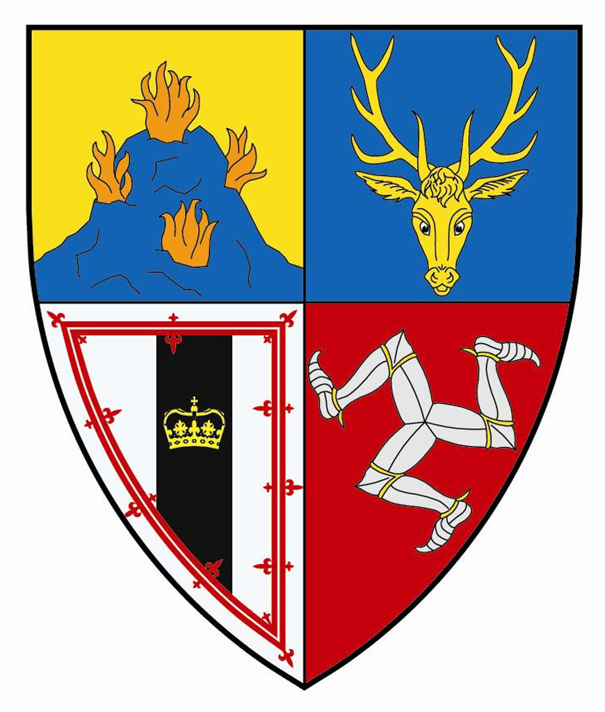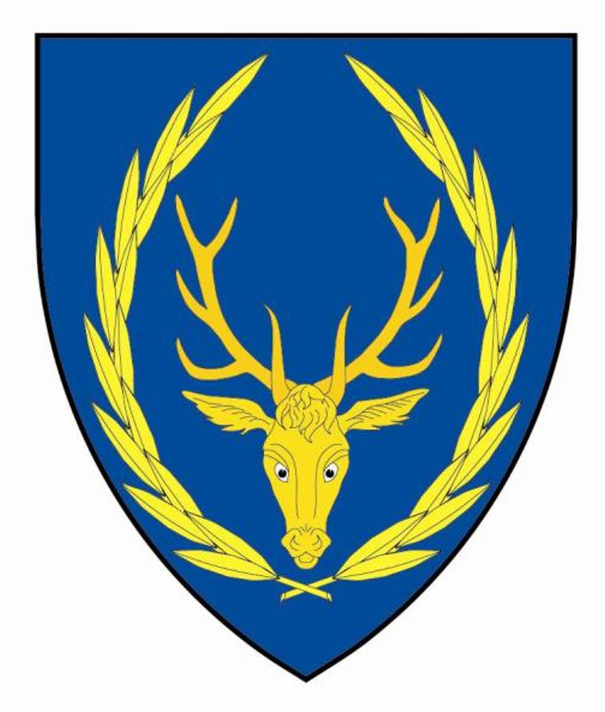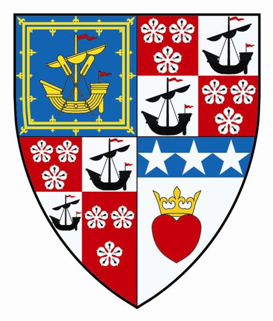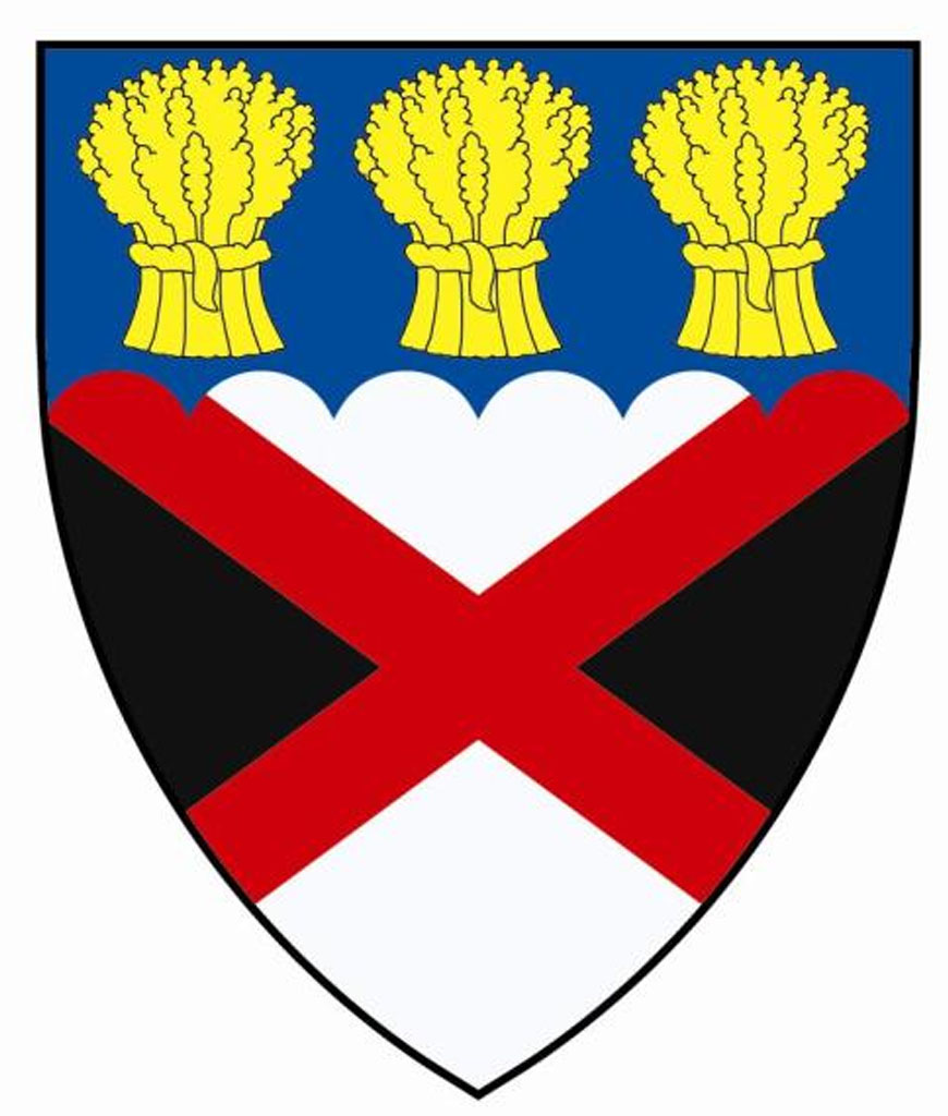 Blazon: Shield: Azure, a lymphad, sails furled, oars in action Or, flagged Argent with a saltire of the first, the masthead pennant Gules, on a