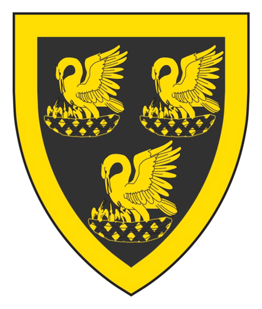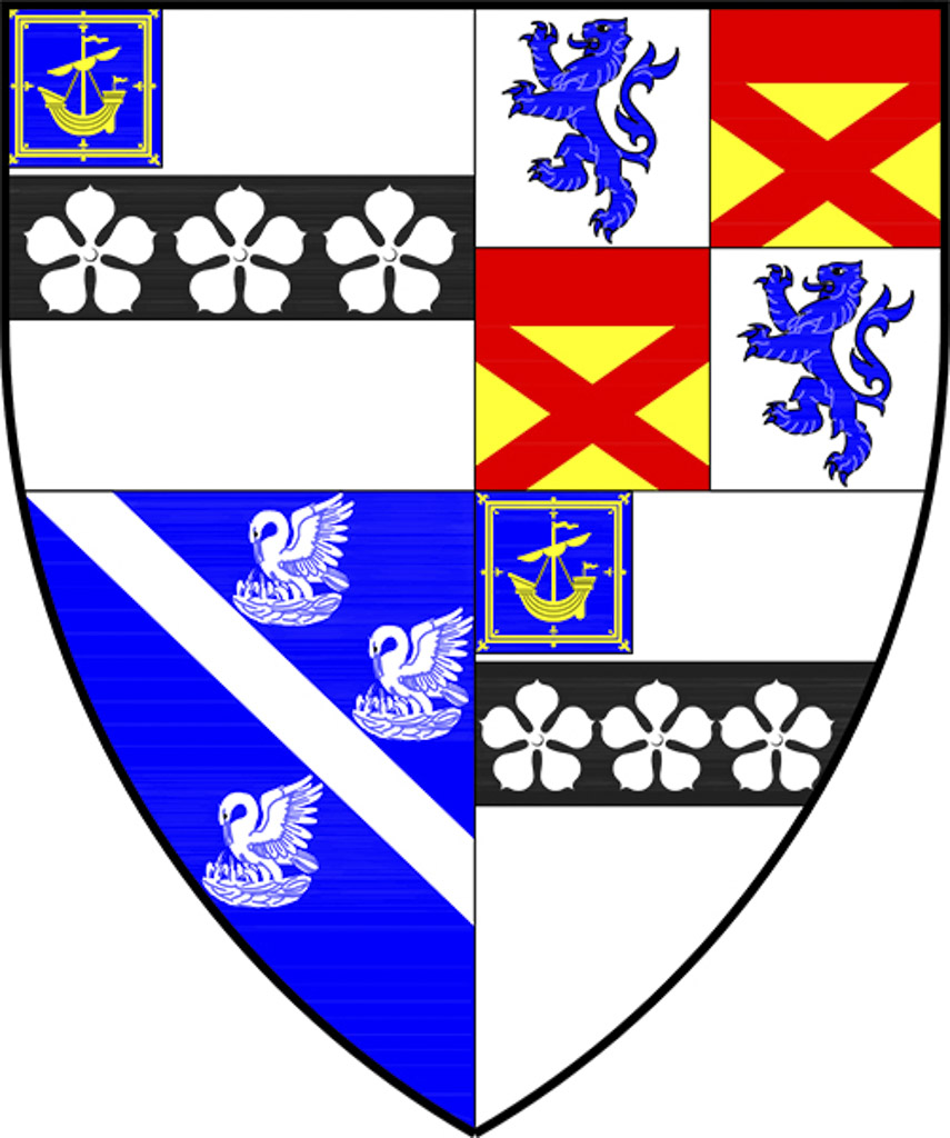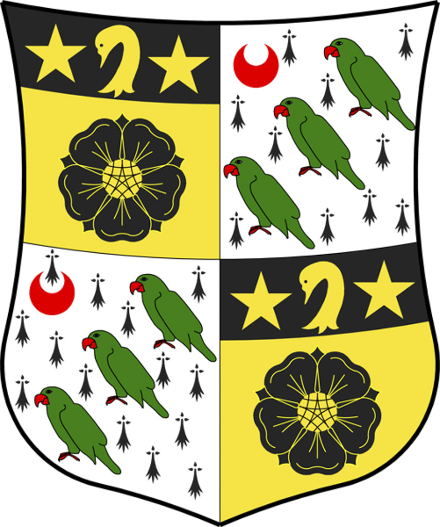 Arms: Quarterly: 1st and 4th Or a rose Sable seeded Or and on a chief Sable a swan’s head and neck erased between two stars Or; 2nd and 3rd Ermine three papingoes paleways in bend sinister proper and in dexter chief a crescent Gules.