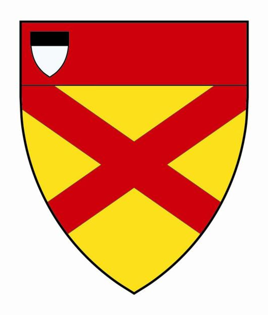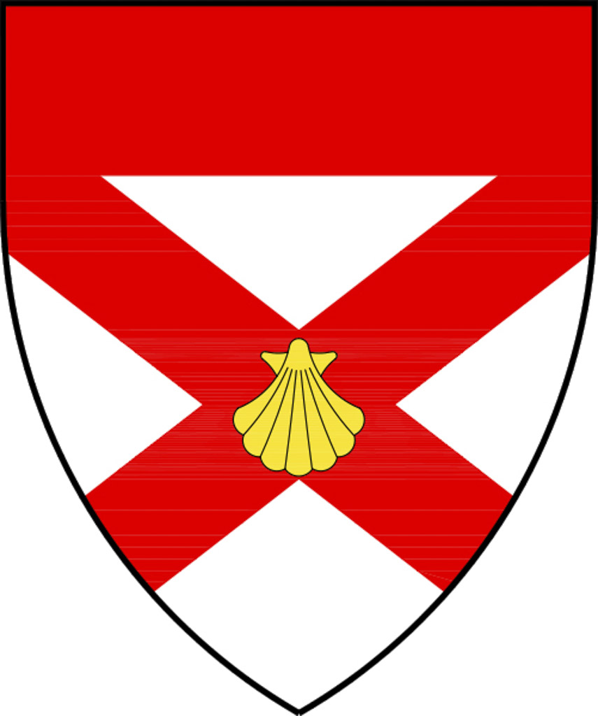 Arms: Argent, a saltire and chief Gules, the former charged with an escallop Or.