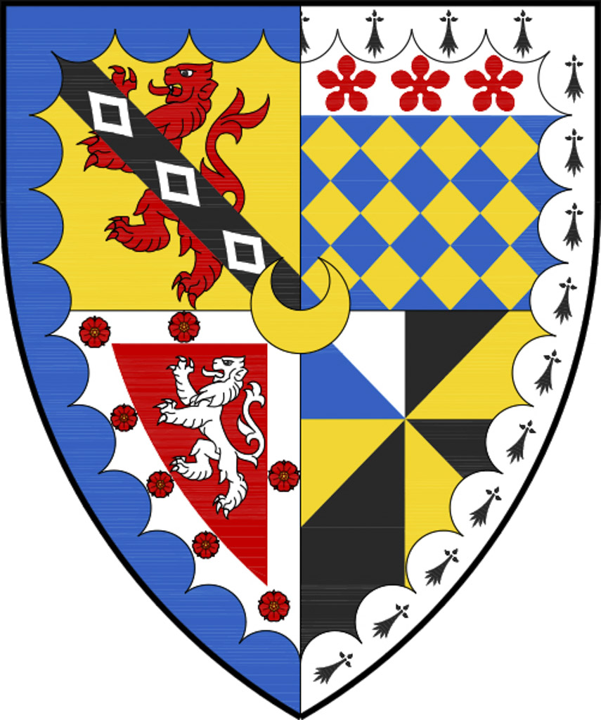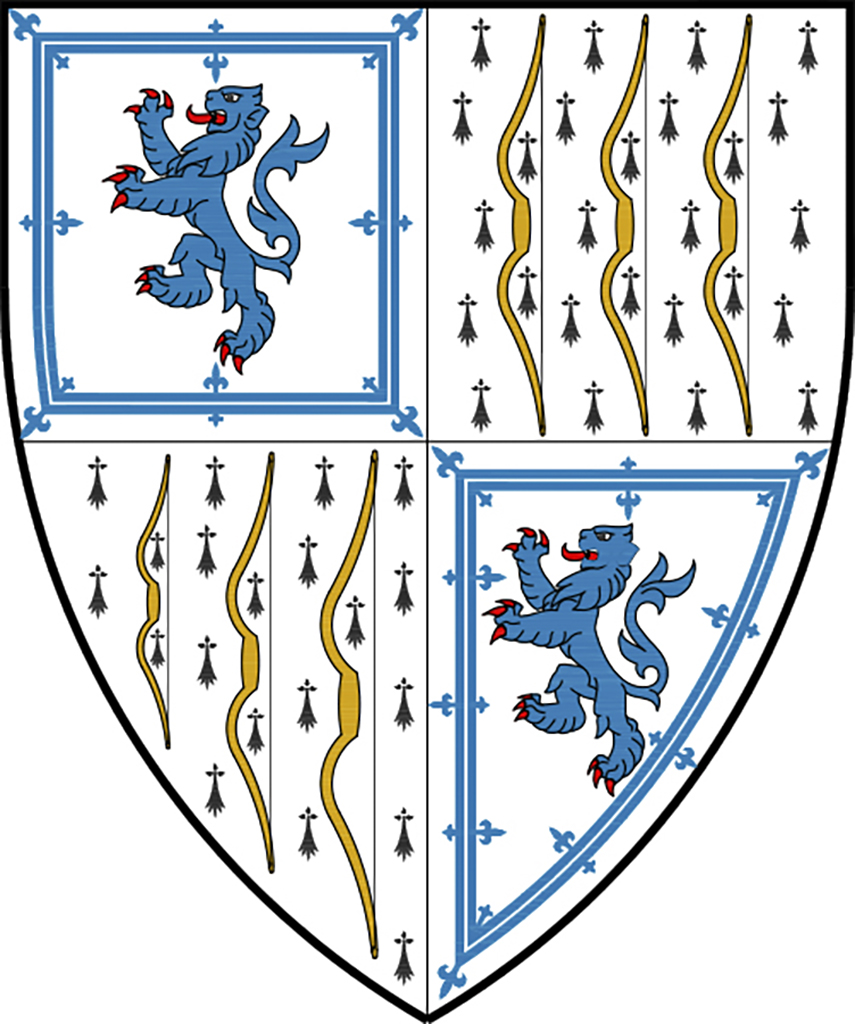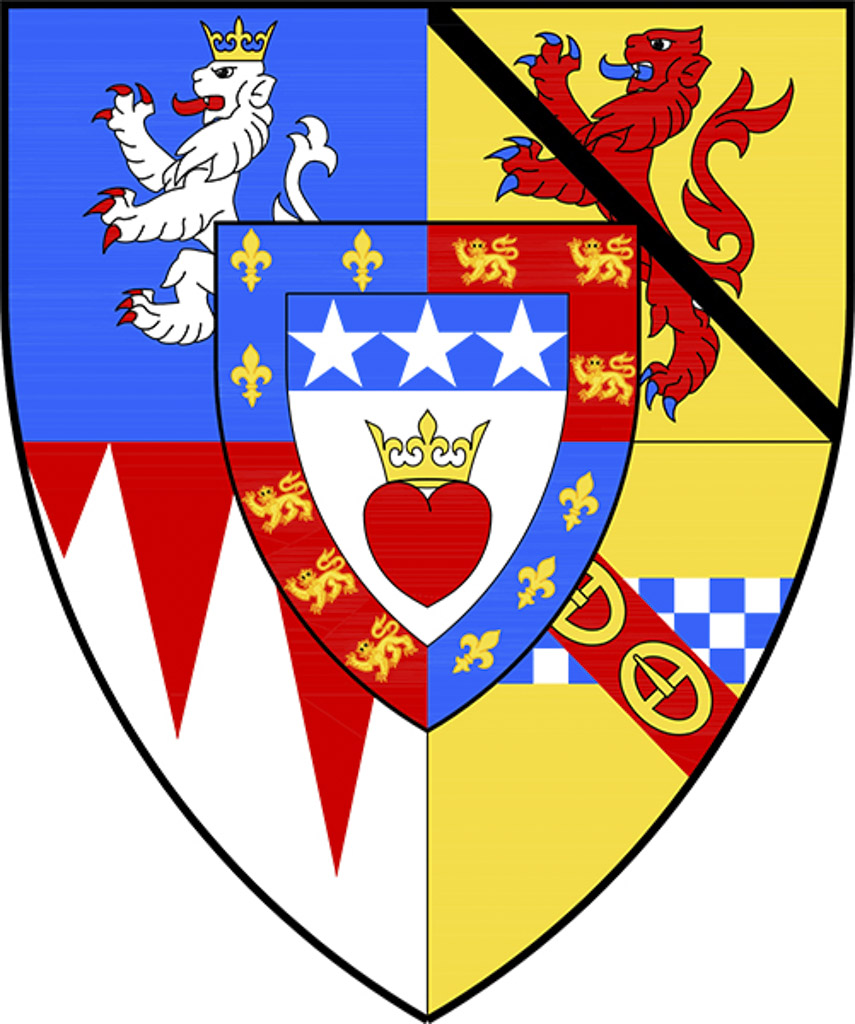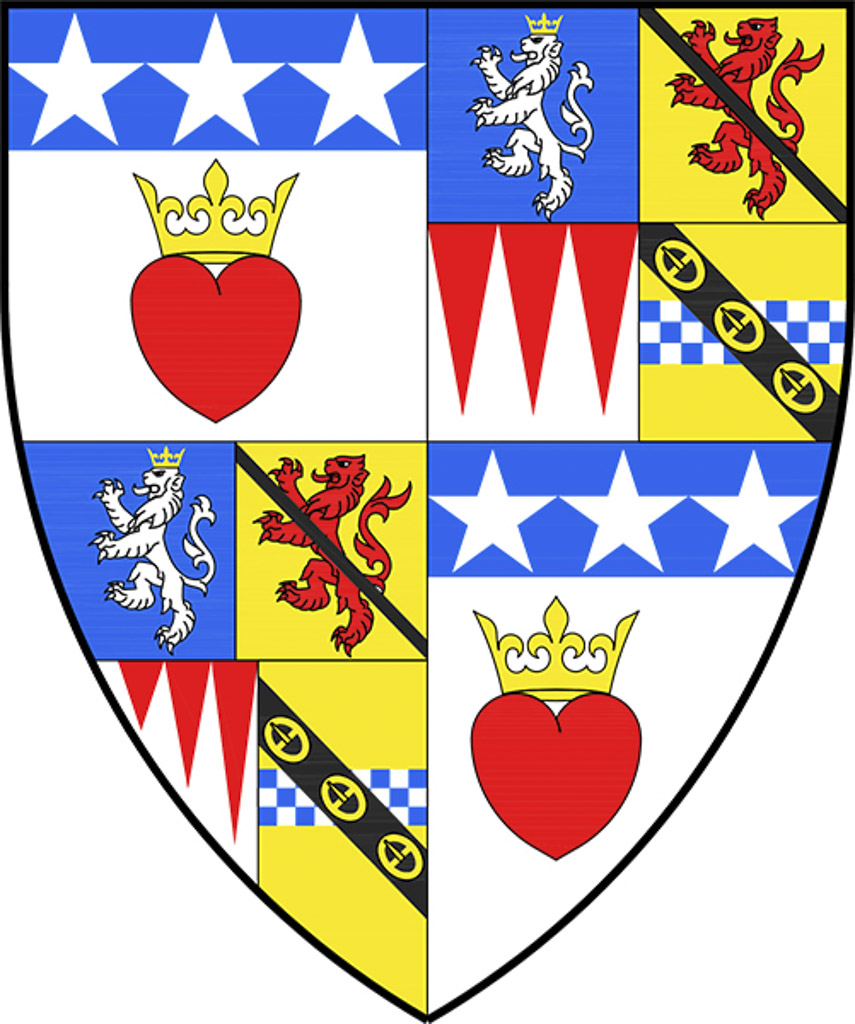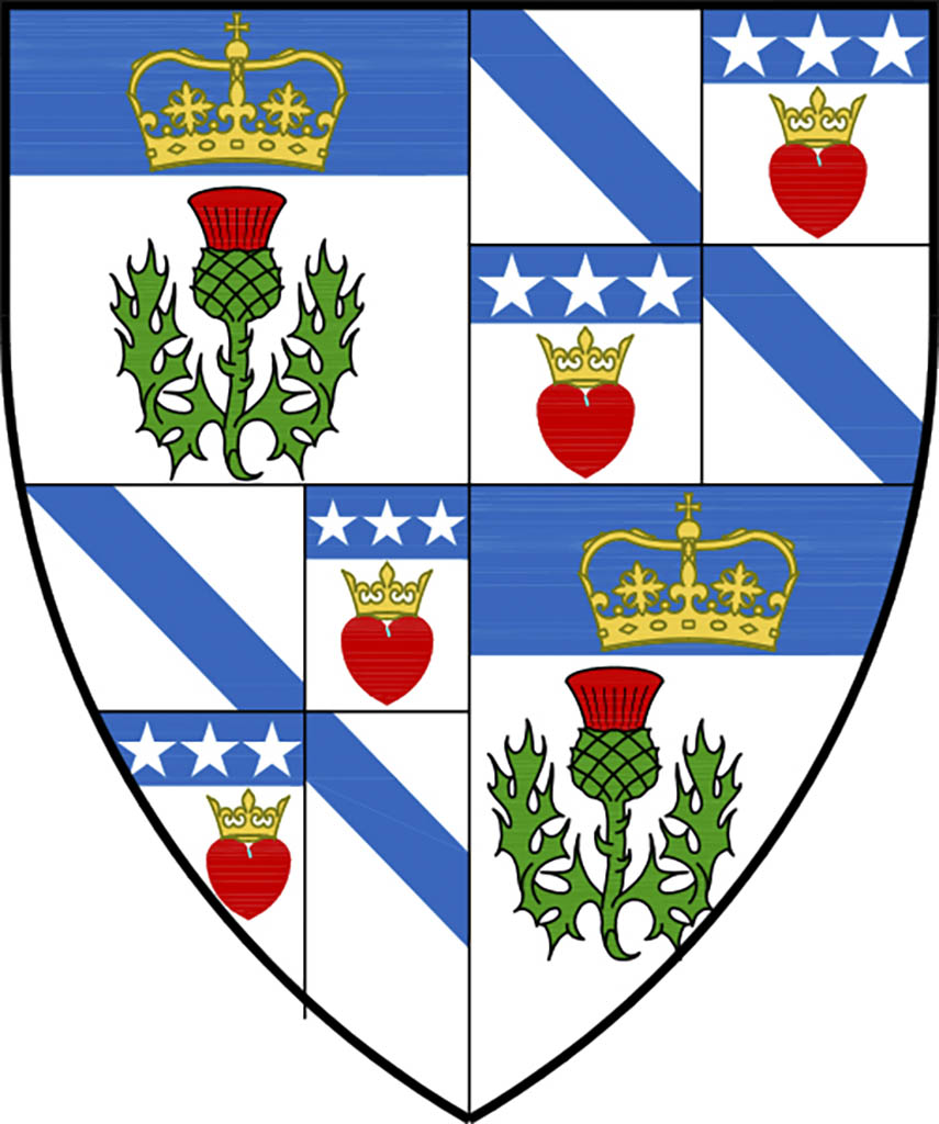SHIELD: Quarterly: 1st & 4th Argent a man’s heart Gules imperially crowned Or on a chief Azure three mullets Argent (for Douglas); 2nd & 3rd Azure a bend between six crosses-crosslet fitchée Or (for Mar); for augmentation the escutcheon within a bordure Or charged with a double tressure flory counterflory Gules.