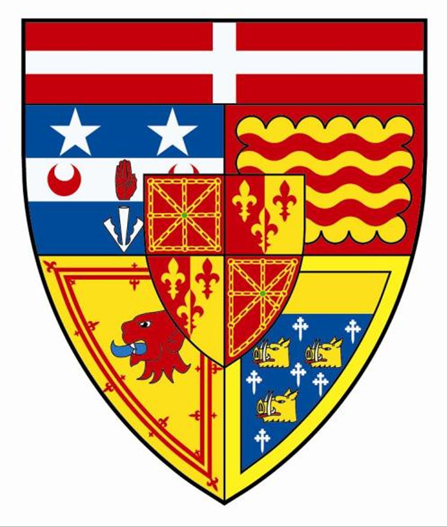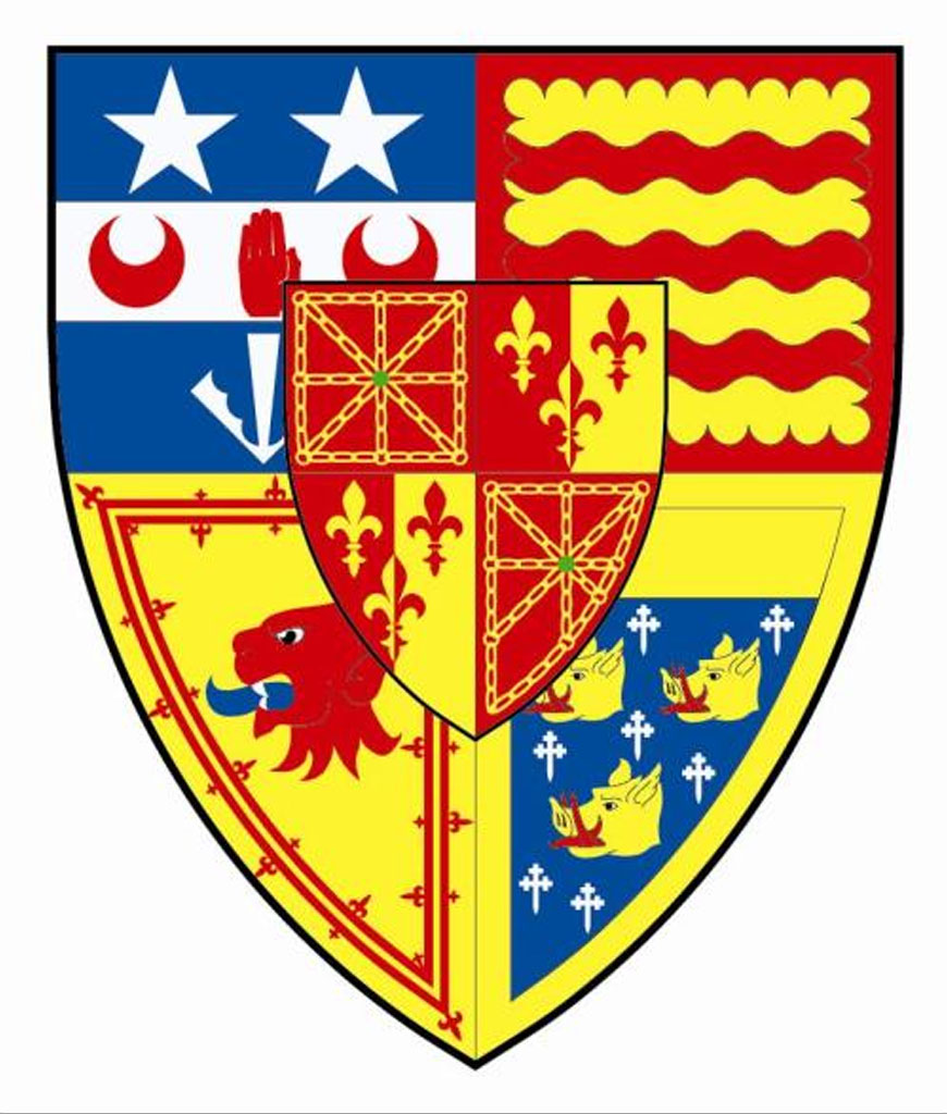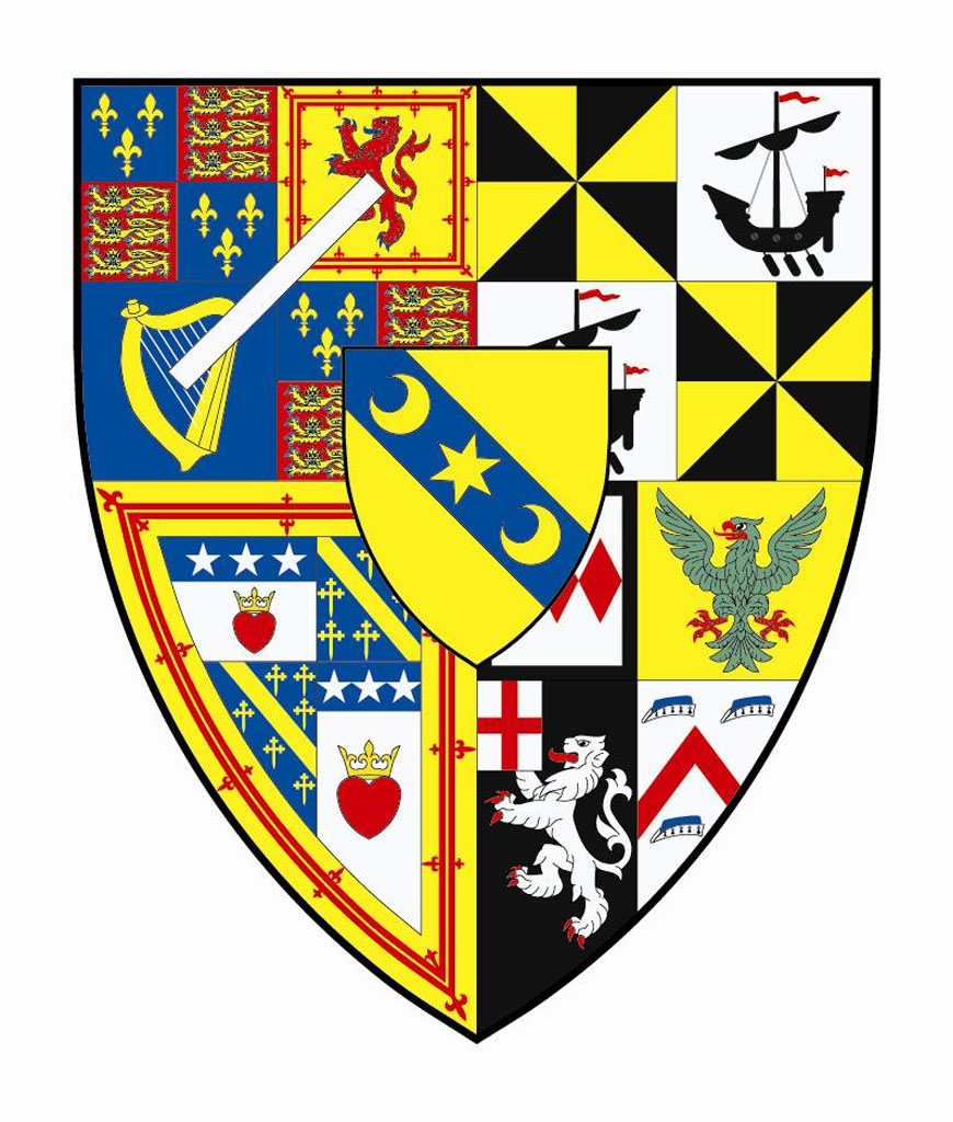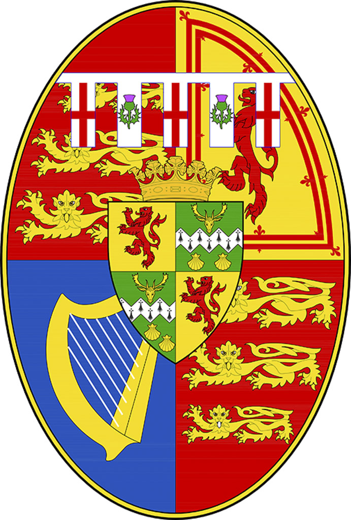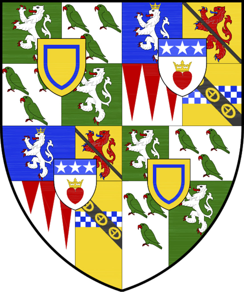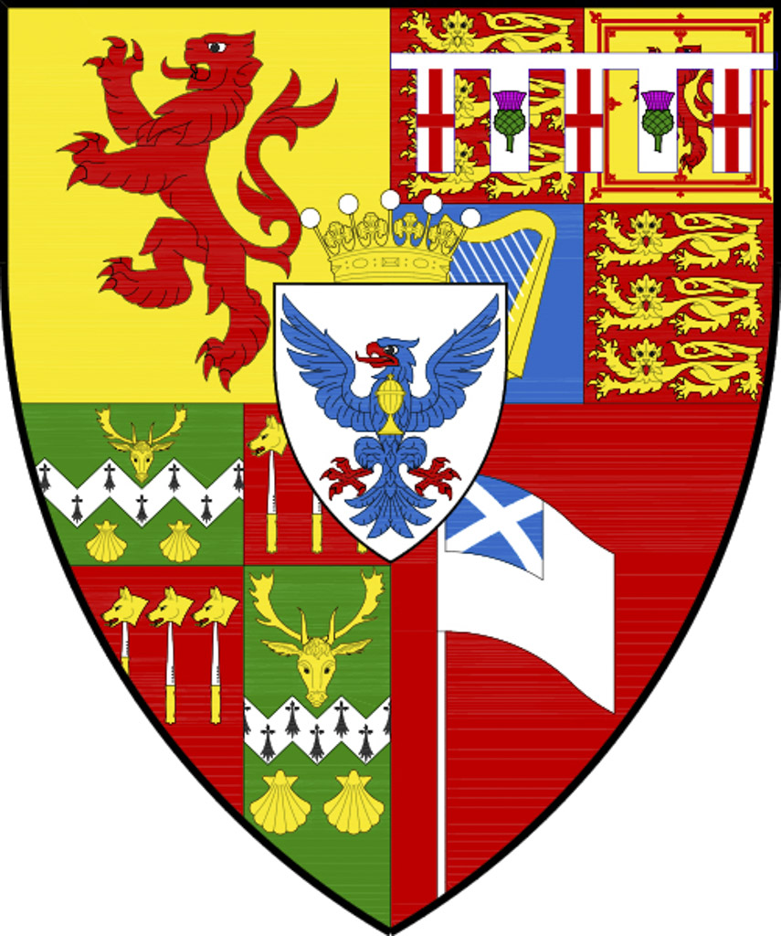 SHIELD: Quarterly: 1st & 4th Argent a man’s heart Gules imperially crowned Or on a chief Azure three mullets Argent (for Douglas); 2nd & 3rd Azure a bend between six crosses-crosslet fitchée Or (for Mar); for augmentation the escutcheon within a bordure Or charged with a double tressure flory counterflory Gules.