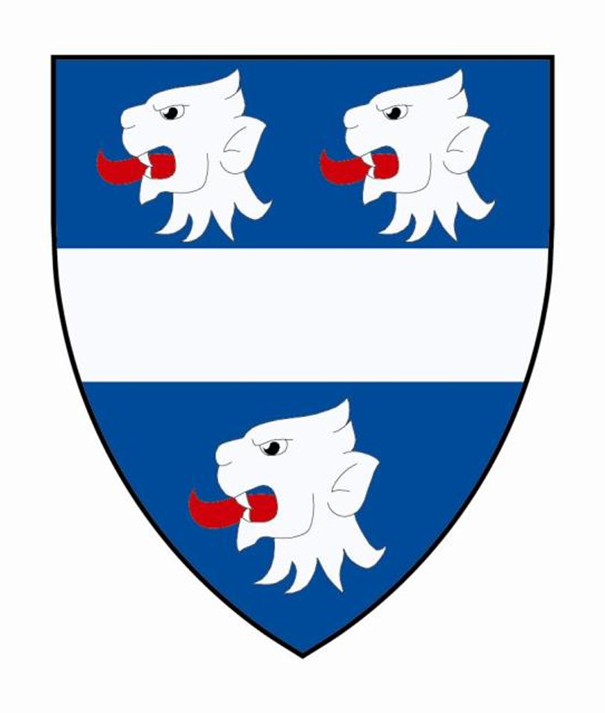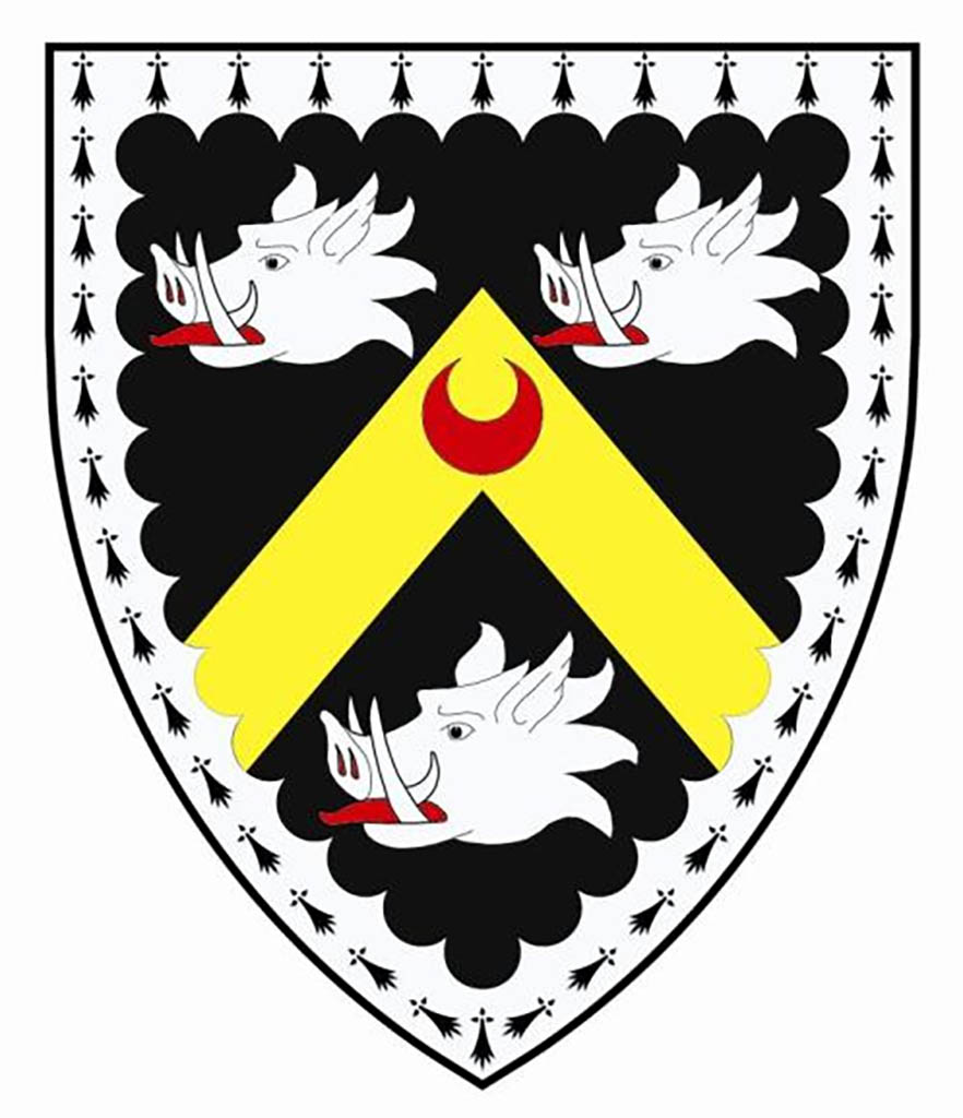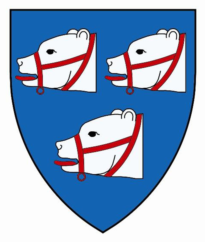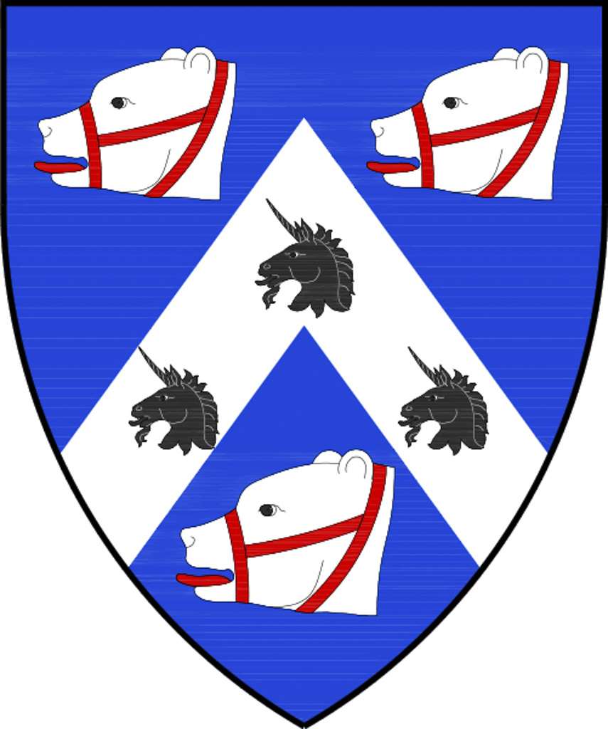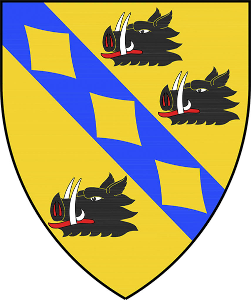 Arms: Or, on a bend Azure between three boars’ heads erased Sable as many lozenges of the first.