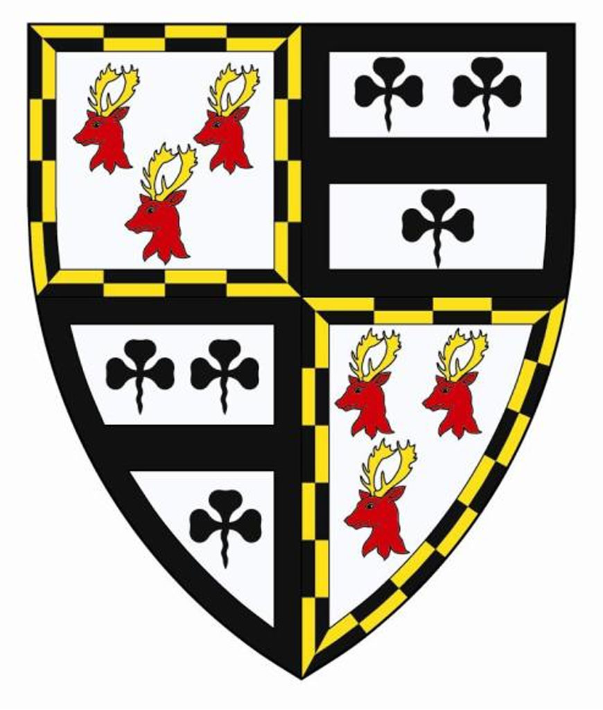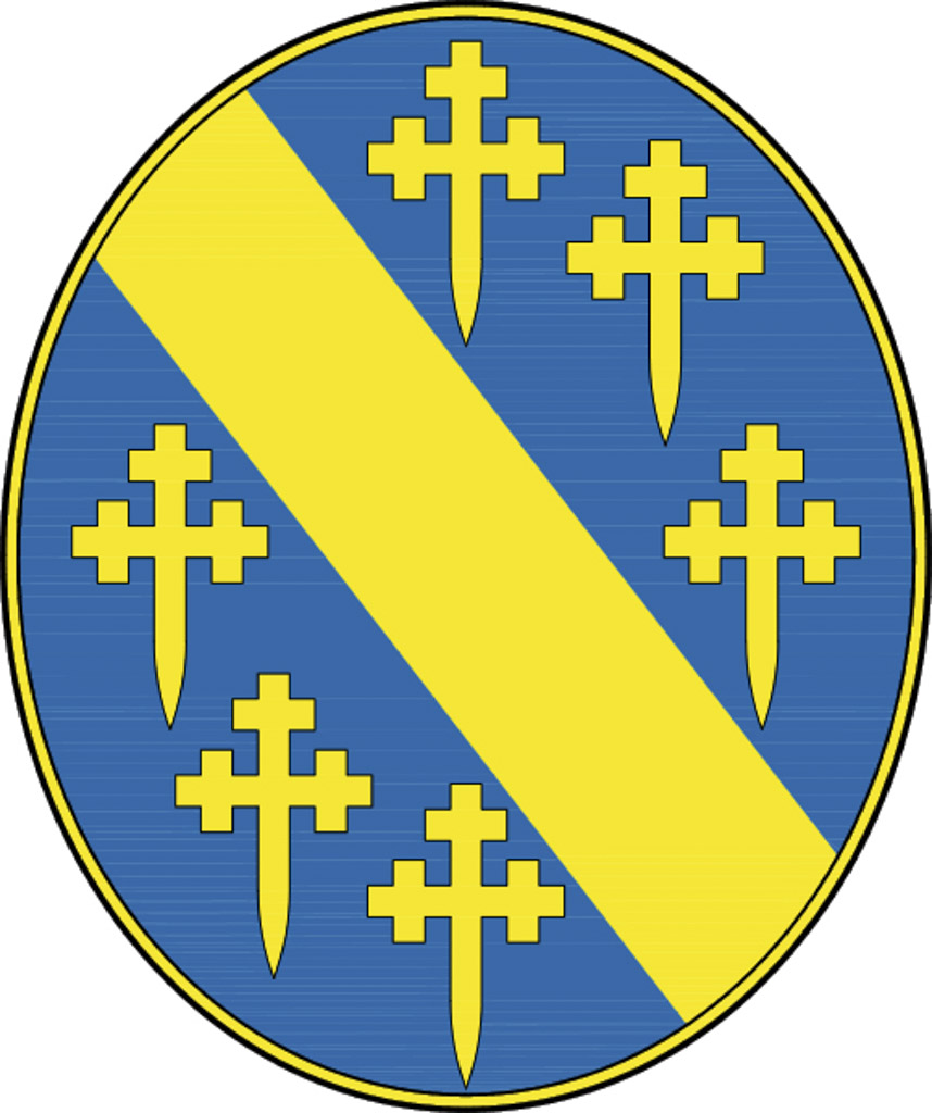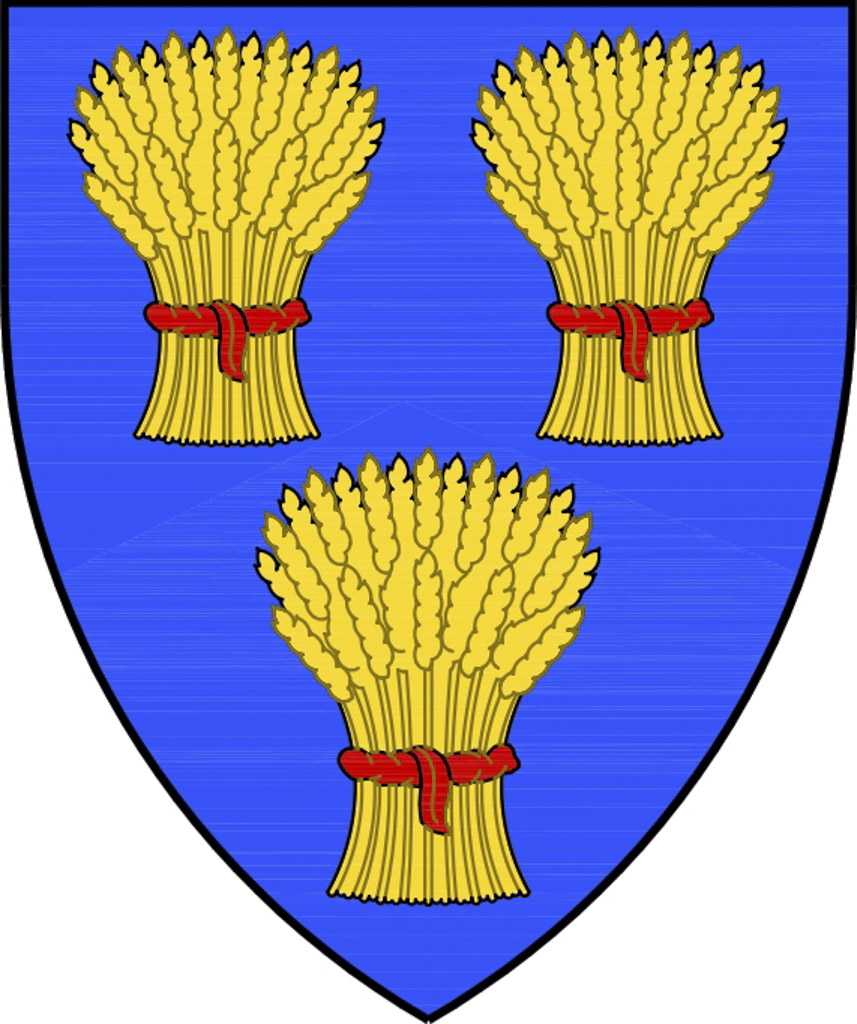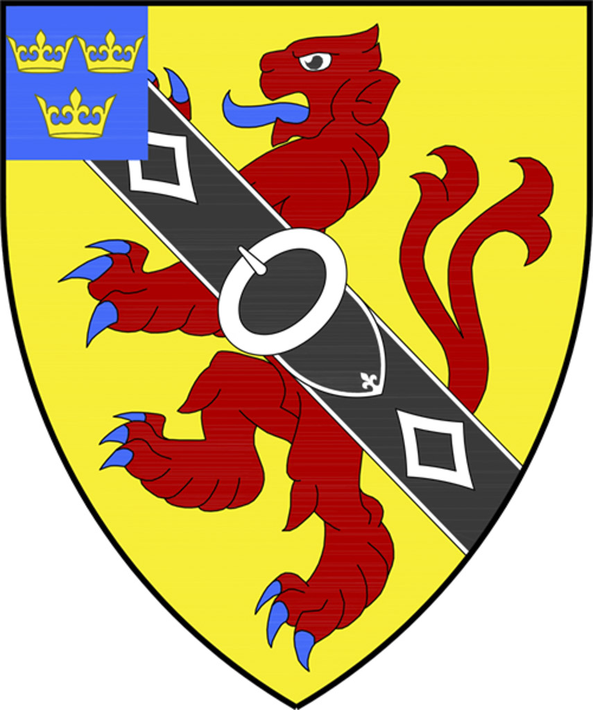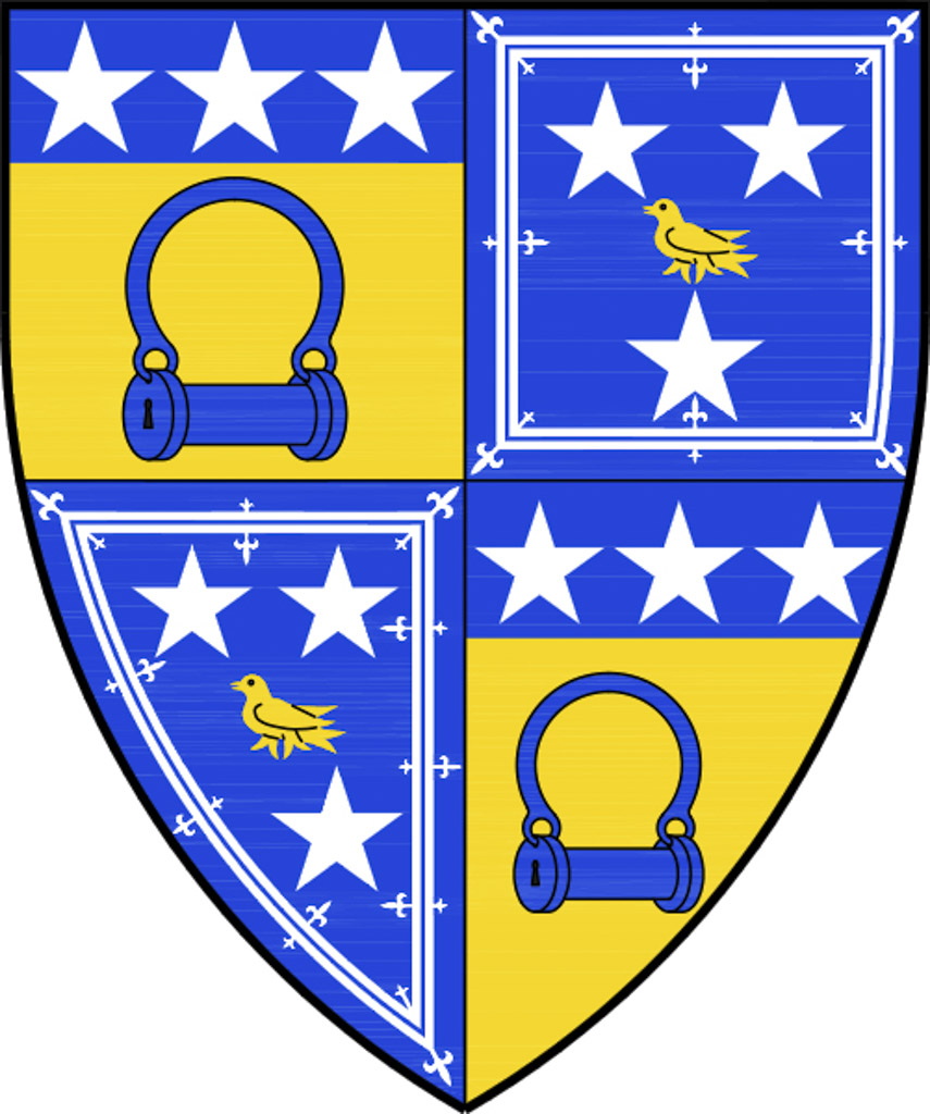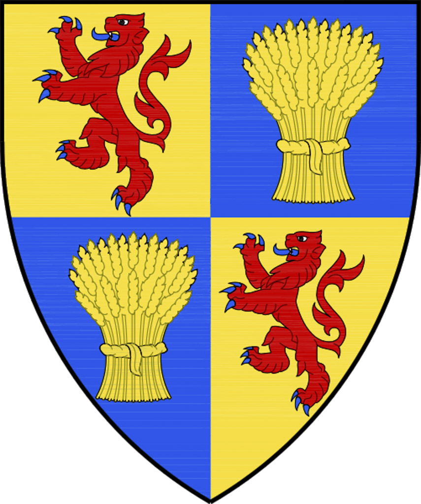 Arms: Or, on a bend Azure between three boars’ heads erased Sable as many lozenges of the first.