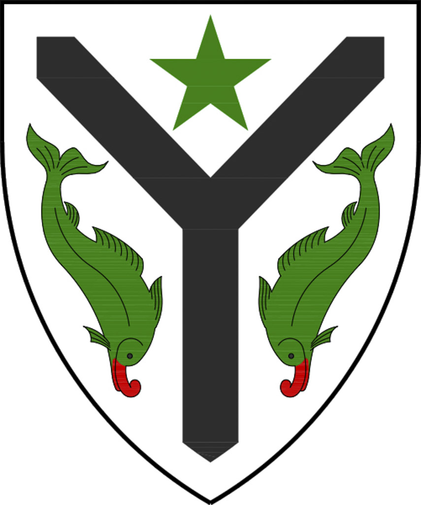 Blazon of Arms: Argent a shake-fork Sable between a mullet in chief Vert and two dolphins descending respectant of the last, embouchee Gules