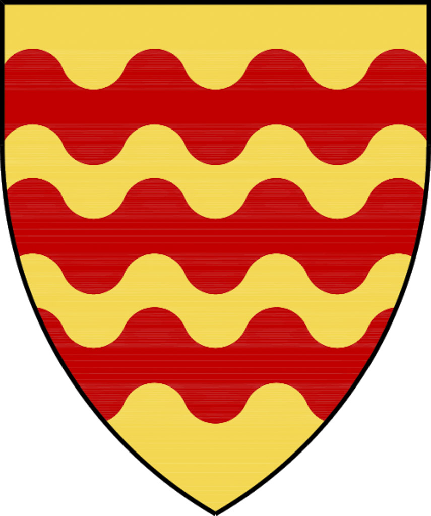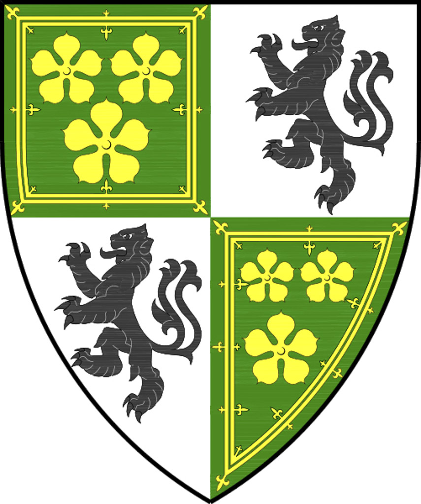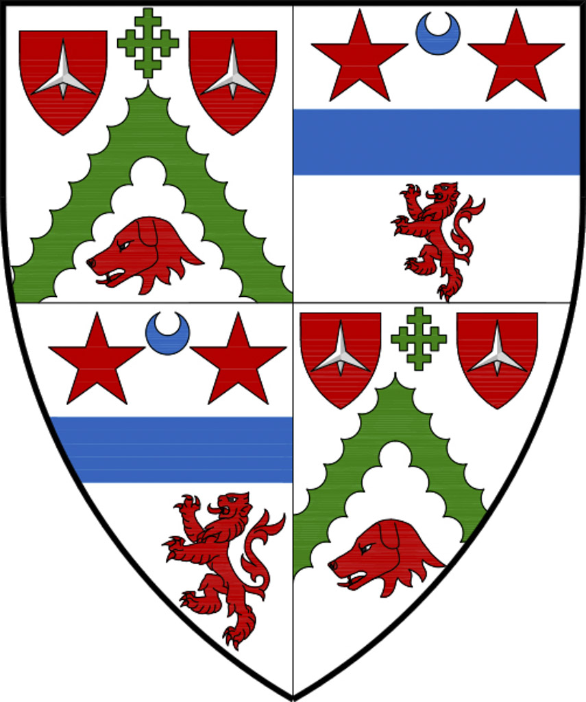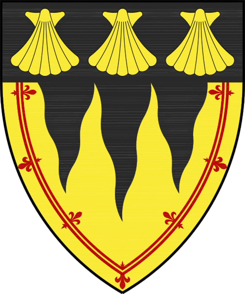 Arms: Parted per fess vert and sable a barrulet wavy between two lions’ faces in chief and an escallop in base Or.
