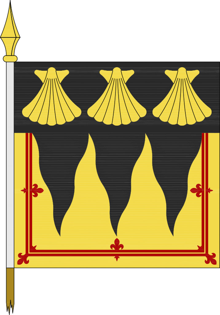 Or, three piles wavy Sable within a double tressure flory counterflory Gules, on a chief Sable three escallops Or.