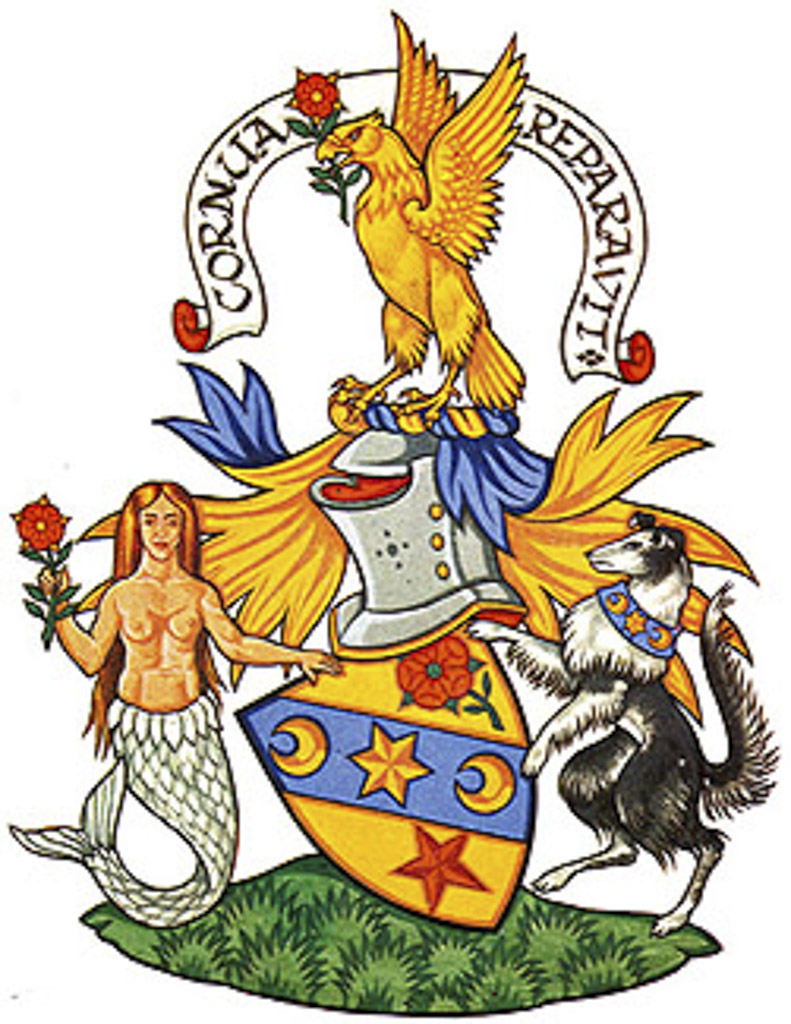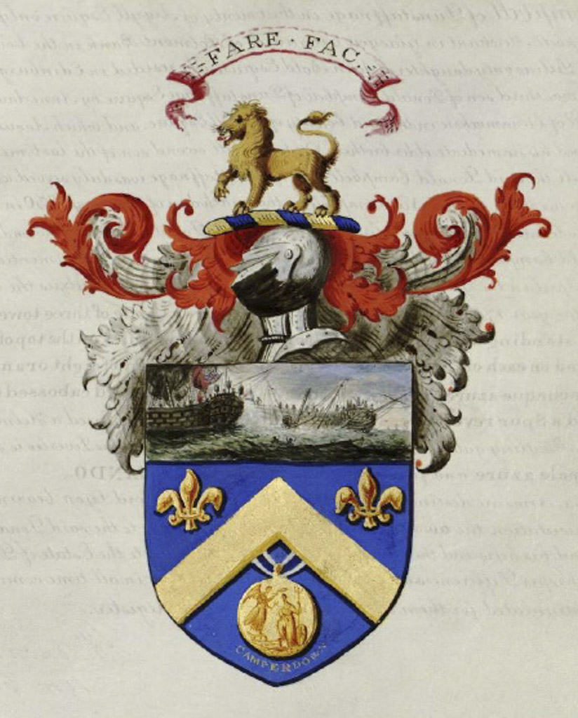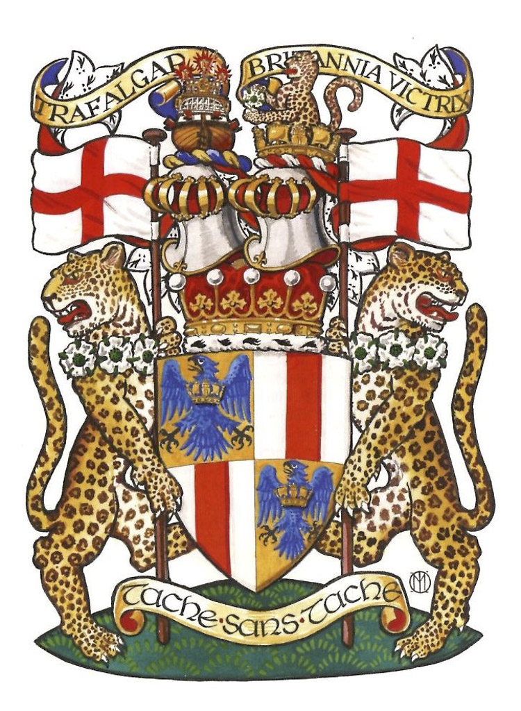 Arms: Vert a fess dancetty Ermine between a stag’s head cabossed in chief and two escallops in base Or; on a chief wavy Ermine the Trafalgar medal Or, pendant by a ribbom Azure, Argent, Azure, between wreaths of cypress and laurel with the word “Trafalgar” under the medal.