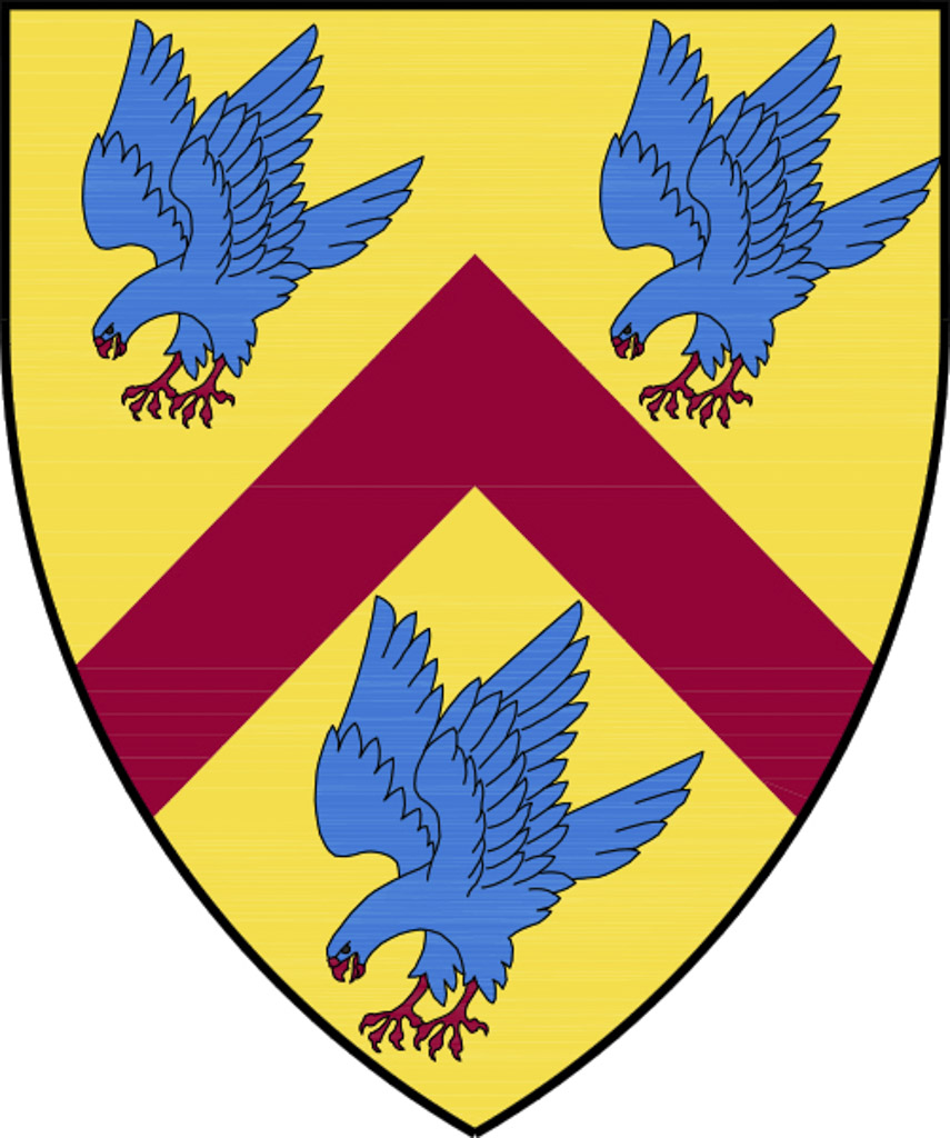 Arms: Or a chevron Murrey, between three falcons stooping Azure, armed, langued and beaked Murrey