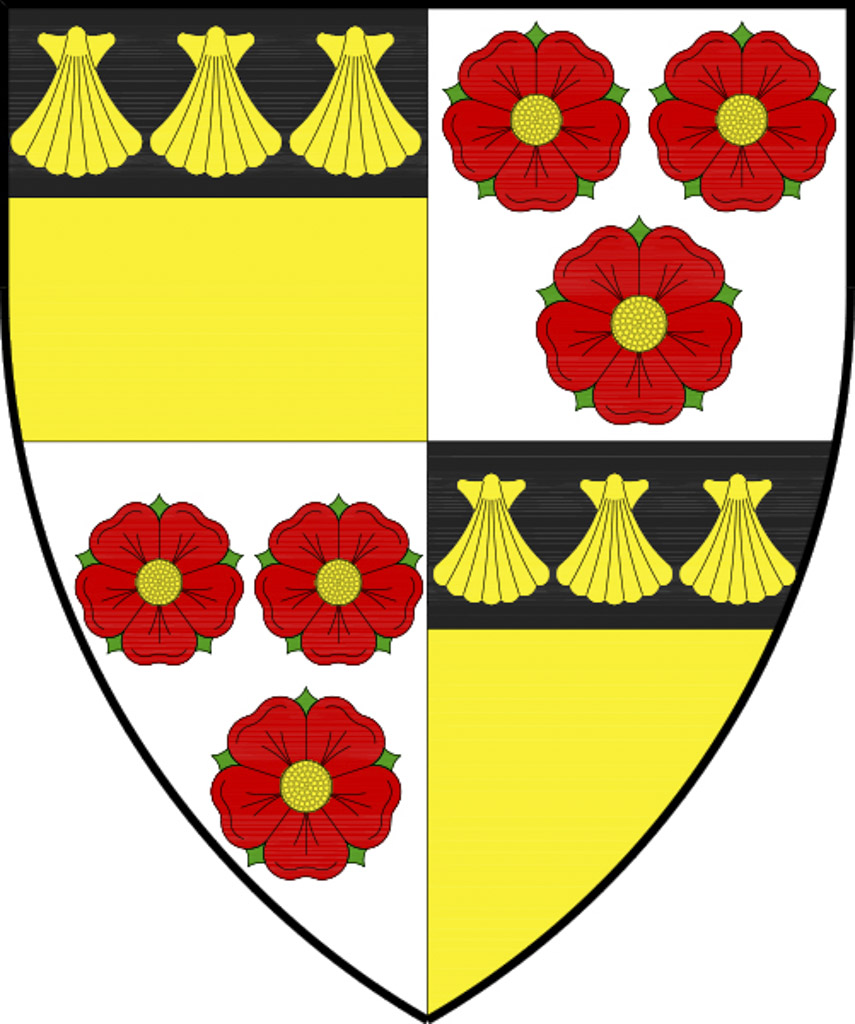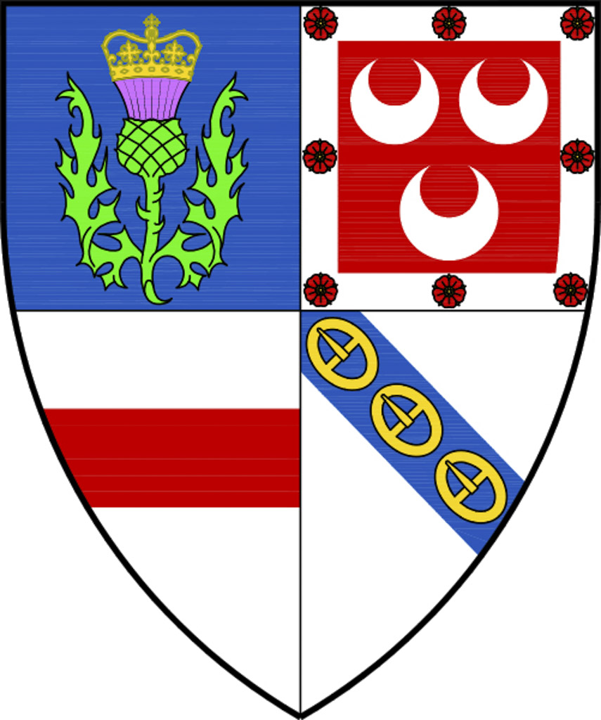 Arms: Quarterly: 1st and 4th, Or on a chief Sable three escallops Or (for the name of Graham ) 2nd and 3rd , Argent, three roses Gules barbed and seeded proper ( for the title of Montrose ).