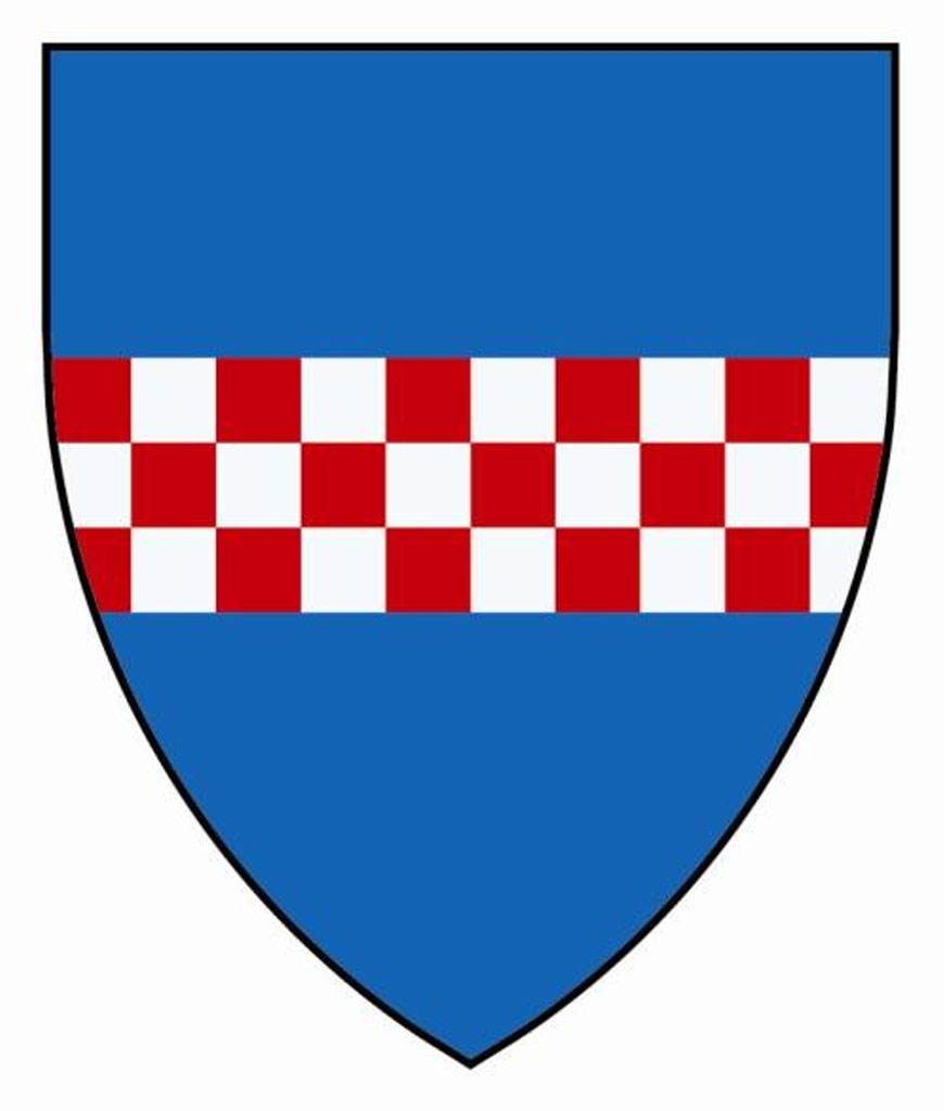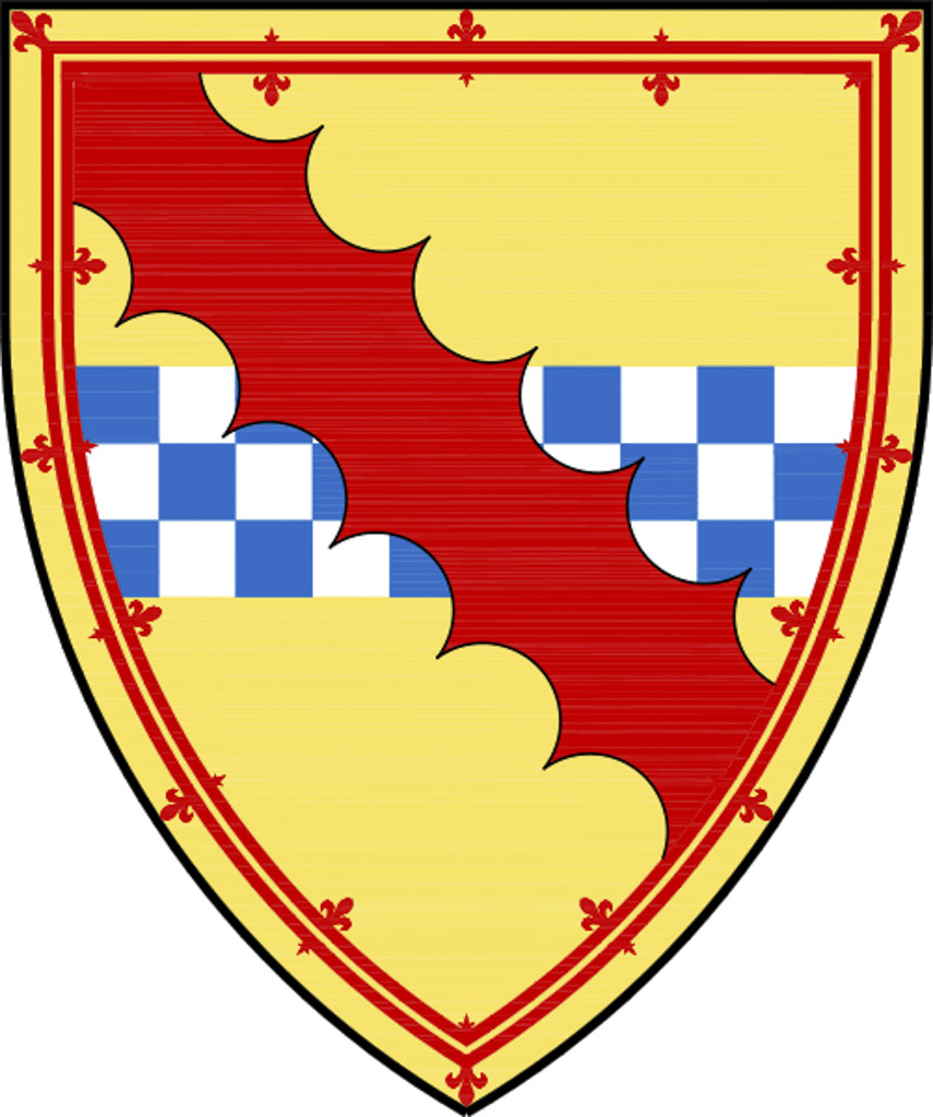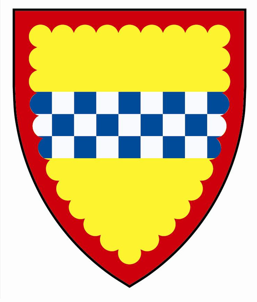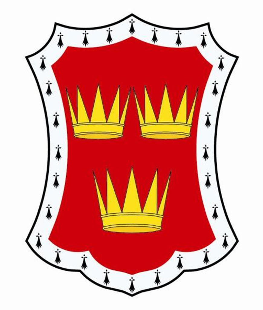 ARMS: Gules three antique crowns or within a bordure chequy of the last and the first charged with three crescents azure.
