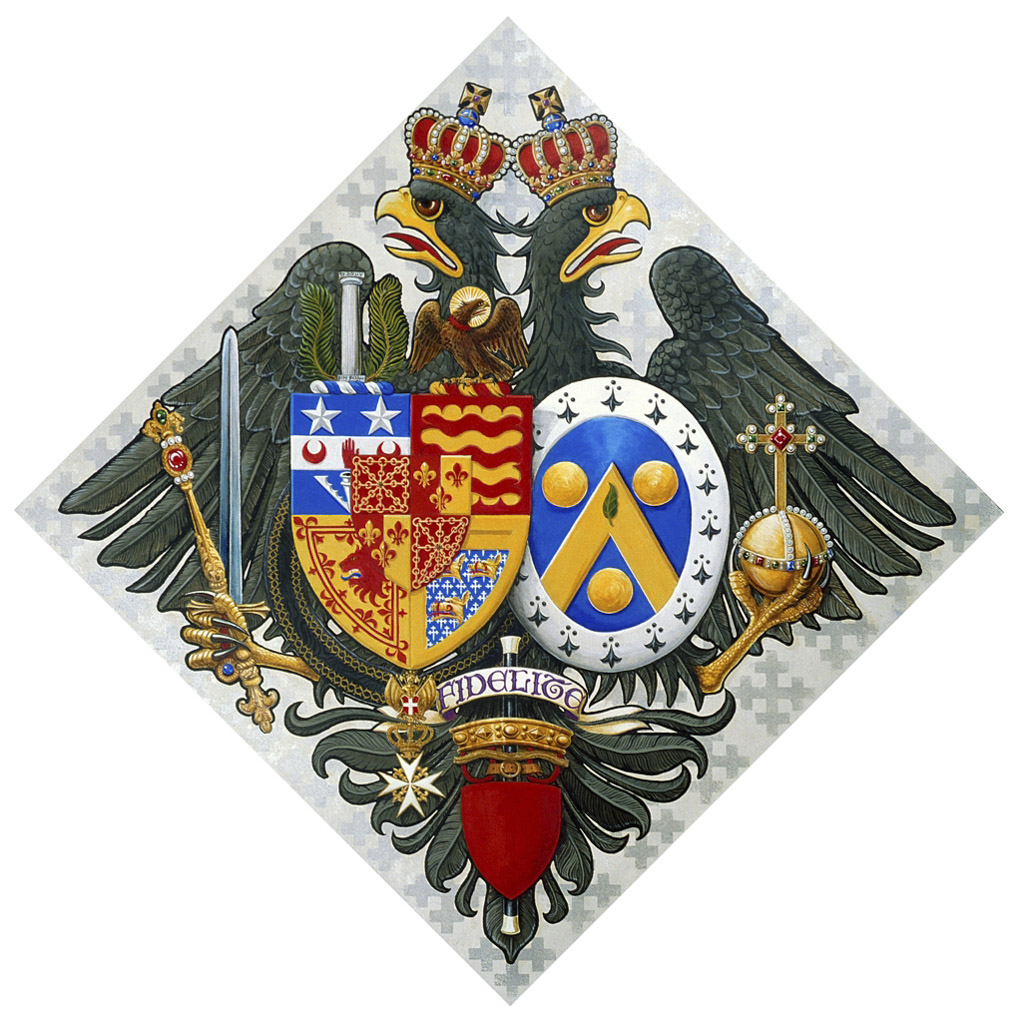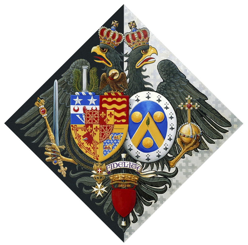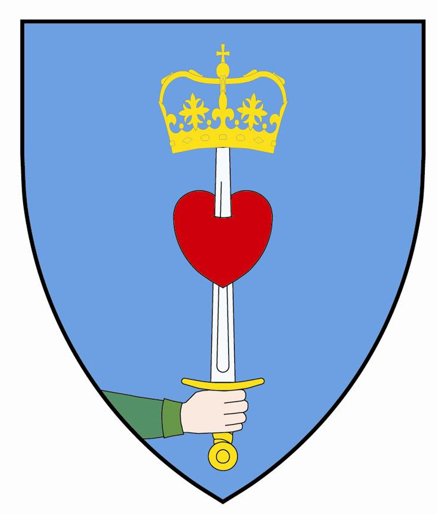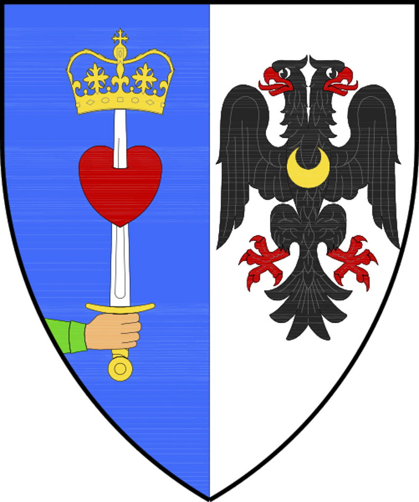 Blazon of arms: Per pale: Dexter Azure issuant from the dexter side an arm vested Vert grasping a sword erect Argent, impaling a heart Gules, the point supporting an imperial crown Proper; sinister, Or a double headed eagle displayed Sable, a crescent Or on its breast.