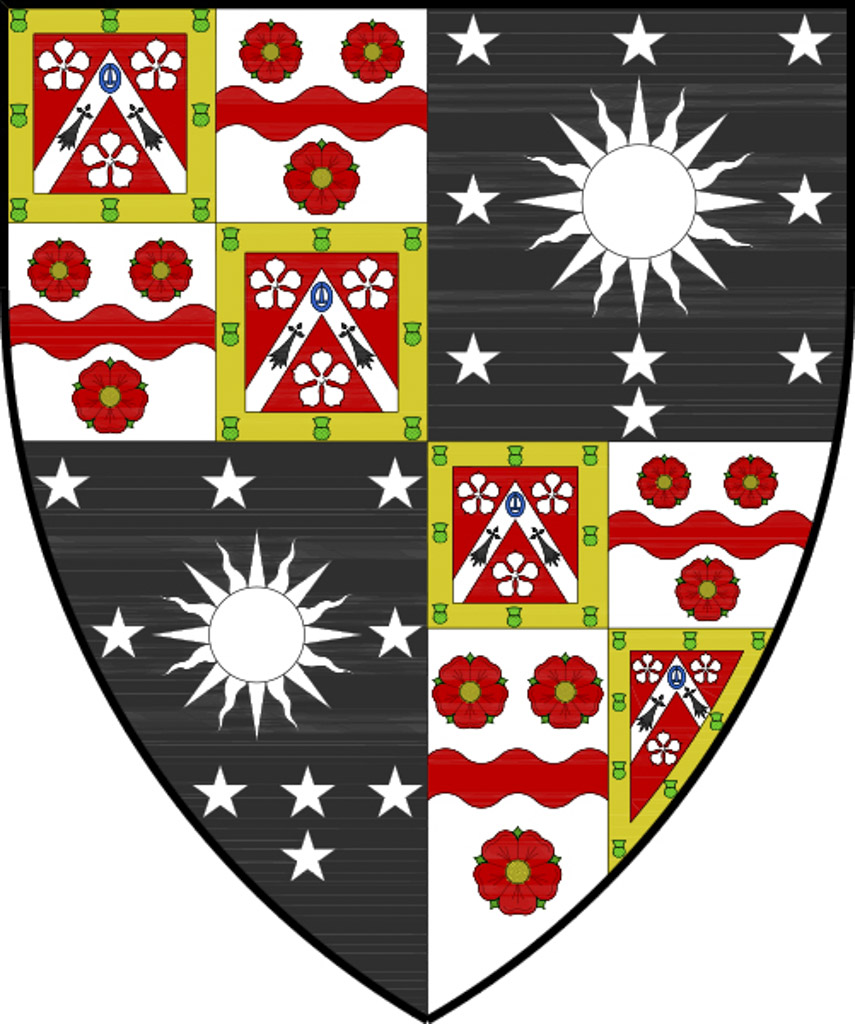 SHIELD: Quarterly, first and fourth vert, three primroses within a double tressure flory-counter-flory Or (for Primrose); second and third argent, a lion rampant double queued sable (for Cressy).