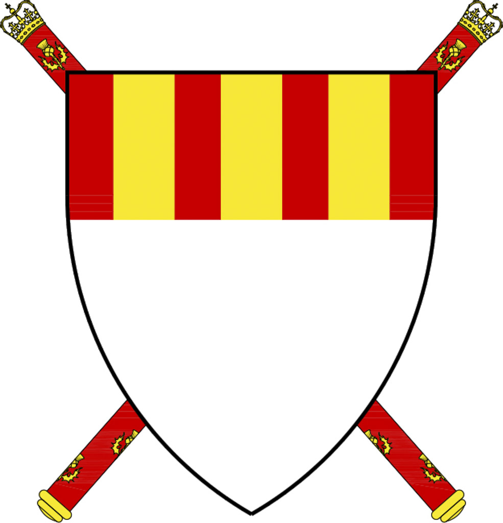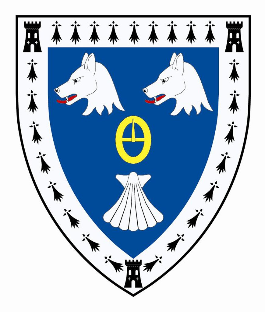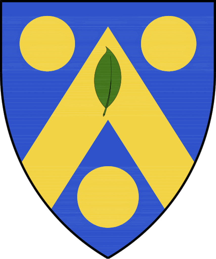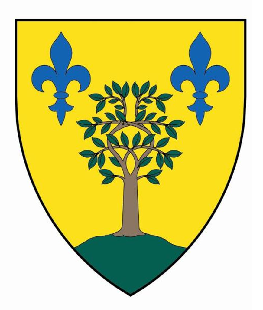 Arms: Argent, an oak tree Proper fructed Or growing out of a mound in base Vert, surmounted of a fess brettessed the crenelles semicircular, Purpure, charged with an hourglass Or.