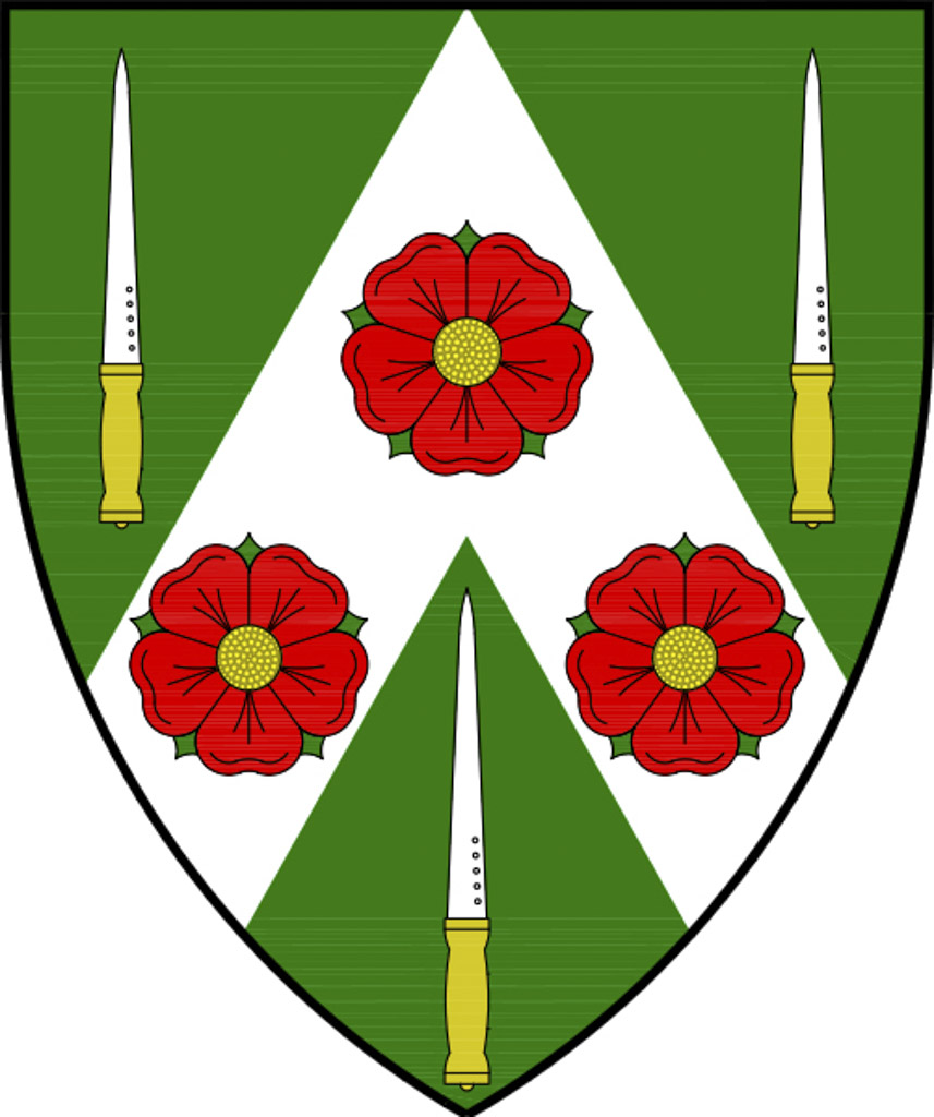 Arms: Vert, on a chevron Argent between three dirks erect Argent, the handles Or, as many roses Gules, barbed and seeded proper.
