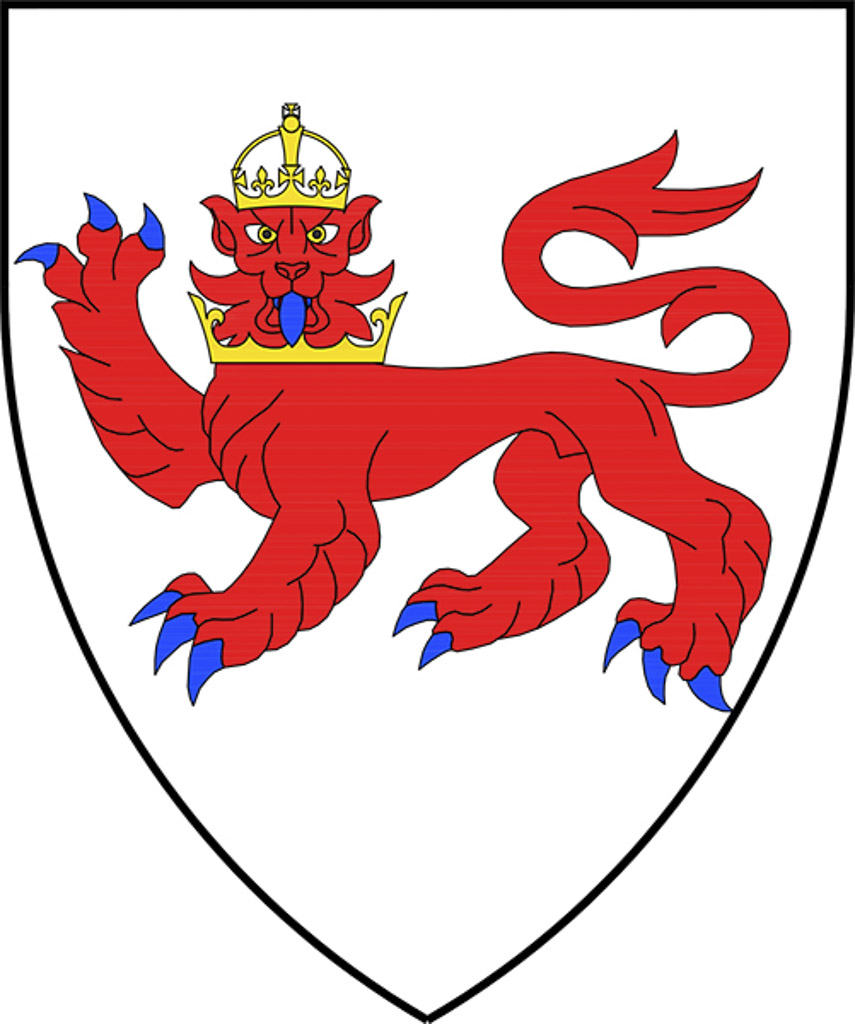 Arms: Argent a Lion passant guardant Gules crowned with an Imperial Crown and collared with an open one proper