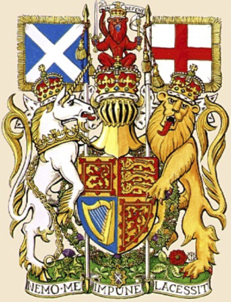 2nd Or a lion rampant within a double tressure flory counter flory Gules (for Scotland)