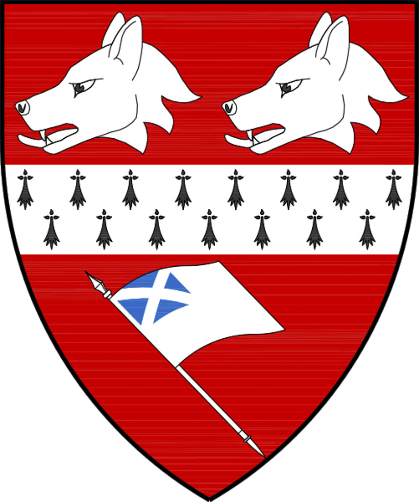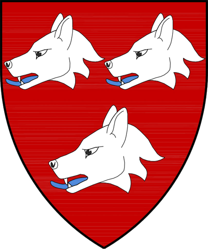 Arms: Gules Three wolf”s heads erased two and one armed and langued Azure