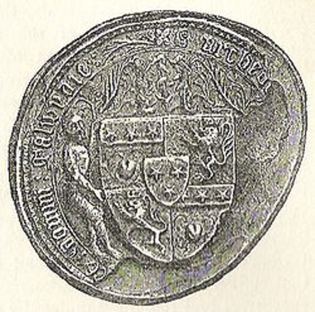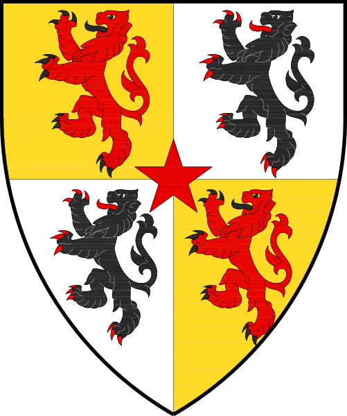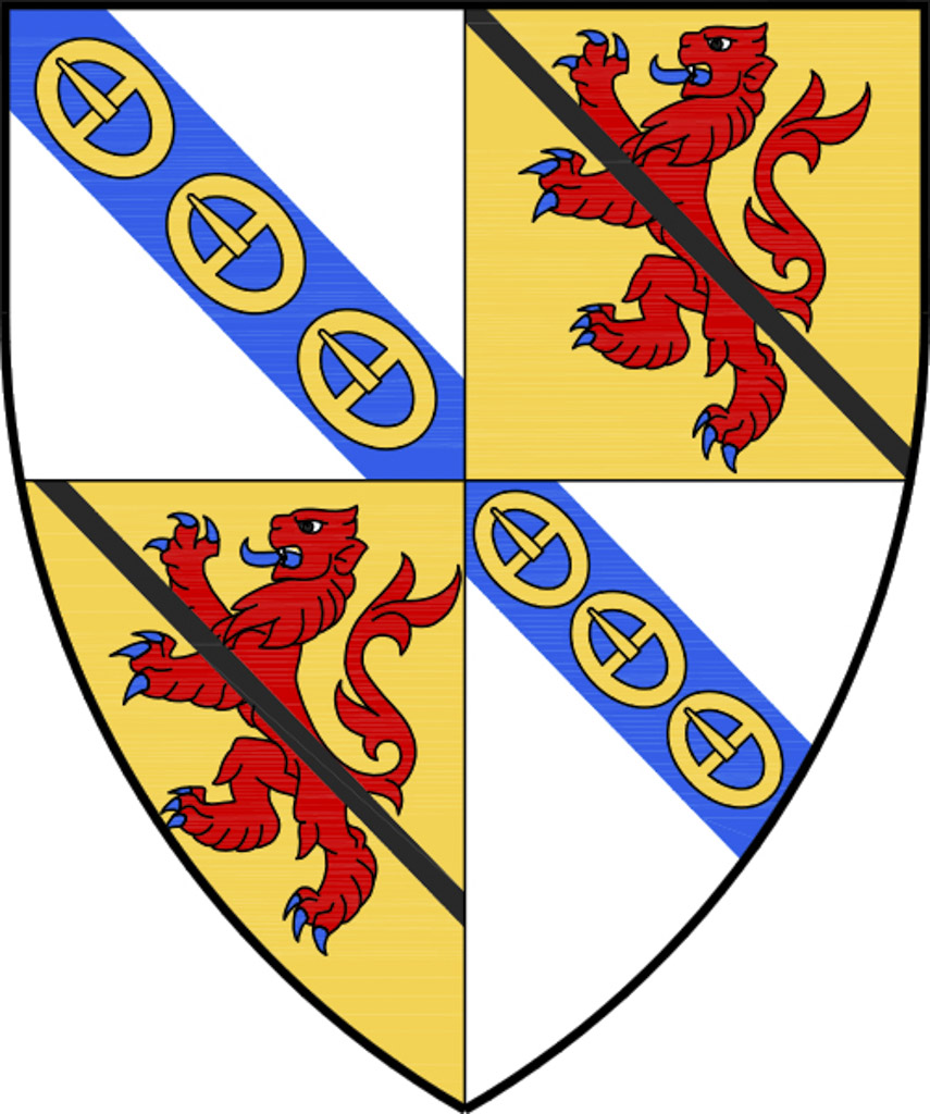 Arms: quarterly: 1st Or, a lion rampant Gules surmounted of a bendlet Sable charged with three mascles Argent ( ancient paternal arms of Spens )2nd