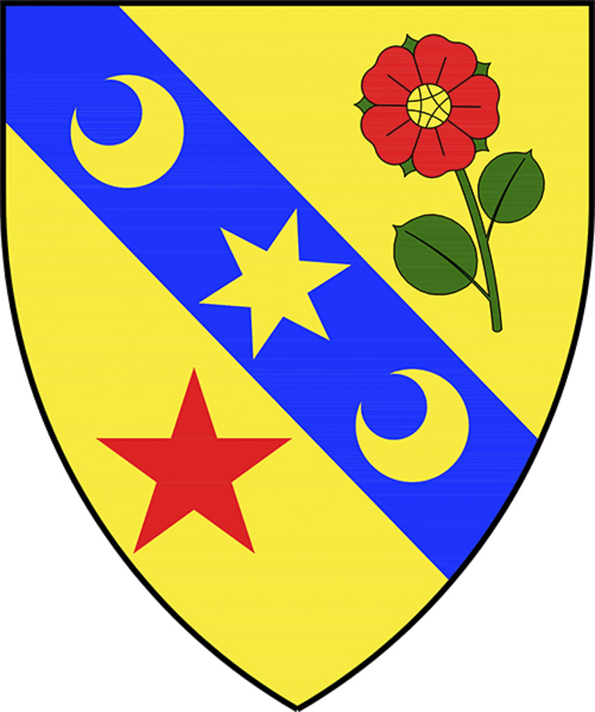 Arms: Or; on a bend Azure, between a rose slipped Gules leaves barbed and seeded Vert in sinister chief and a mullet Gules in dexter base, a six pointed mullet between two crescents Or.